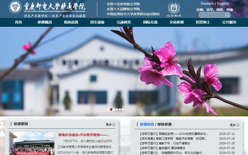 重庆邮电大学移通学院成立于2000年,是经教育部批准(教发函〔2004〕41号),由重庆邮电大学举办的独立学院,属全日制普通本科院校,面向全国招生。学校位于重庆合川大学城,校园依山傍水,环境优美,交通便捷。目前占地面积1350余亩,总建筑面积近49万平方米,教学仪器设备总值11054.3万元,校外实习实训基地98个,图书资料153余万册。现有通信与物联网工程学院、智能工程学院、大数据与软件学院、淬炼商学院、远景学院、中德学院、艺术传媒学院、创意写作学院、创业学院等10个二级学院,管理工程系、外国语言文学系、光电信息系等3个系,4个教学部,以及独具特色的完满教育委员会、双体系卓越人才教育基地等部门。共开设通信工程、电气工程及其自动化、轨道交通与信号控制、财务管理、工程管理、广播电视编导等35个本科专业,通信技术、工商企业管理等4个专科专业,形成了以工为主,经、管、文、艺五大学科协调发展的专业体系。目前在校学生接近19000人。现有专任教师1204人,外籍教师10余人,硕士以上学位教师占比60%,为学校专业教育提供有力保障。学校秉承“乐教、乐学、创造、创业”校训精神,确立信息产业商学院的总体办学定位,以应用型人才培养为目标,信息科学技术为特色,致力于培养人格高尚、专业基础扎实、创新实践能力强、具有国际视野的“应用型、工程型、创业型、国际化”人才,服务信息行业和地方社会经济发展。学校毕业生就业率一直在90%以上。毕业生就业主要分布在通信、制造、软件开发等行业,基本实现对口就业。2018届毕业生综合就业率95.65%。学校办学特色鲜明,人才培养措施有力,校园文化氛围浓厚。通过专业实验室、校内外实习实训基地以及学生科技竞赛训练基地、公共教学平台等,为学生构建工程训练创新平台,大力培养应用型信息技术人才。构建与企业无缝对接的双体系基地,开展素质拓展、创新学分、工程训练、移通网络学堂等人才培养的全方位工程教育体系。借鉴国外办学模式,探索远景学院人才培养新机制,推行通识教育。成立重庆市首个创业学院,建立大学生创业基地,全面推动创业教育和实践。搭建艺术修养与实践、竞技体育、社团活动、志愿者服务等一体的完满教育平台。启迪智慧与名家面对面,通过名人讲座、名师课堂、音乐剧、青年剧场、万画影城等打造文化移通名片,探索“文化移通”创新育人之路。学校坚持实施国际化战略,继与德国安哈尔特应用技术大学,联合成立中德应用技术学院以来,已与德国、美国等国十余所大学签署合作办学协议,广泛开展中外联合培养的硕士、本科双学历教育活动,目前已输送出百余名学生到国外深造,在校预备赴德学生近千人。学校特色办学成果斐然,四年来共获得省部级以上竞赛奖励100余项。学校先后荣获全国十佳优秀独立学院、中国十大品牌独立学院、重庆市园林式单位、重庆市数字化校园、重庆市大中专毕业生就业工作先进集体等30余项荣誉称号,2013年被教育部列为中国应用技术大学首批改革试点院校,2014年被评为最具综合实力中外合作院校,2015年被评为中国社会影响力就业典型高校,2016年获评重庆市就业示范中心,2017年学校教育教学成果获得重庆市第五届教学成果三等奖,学生创业团队在第三届中国“互联网+”大学生创新创业大赛中荣获全国铜奖,重庆赛区金奖。学校办学成效得到社会各界的广泛认可。