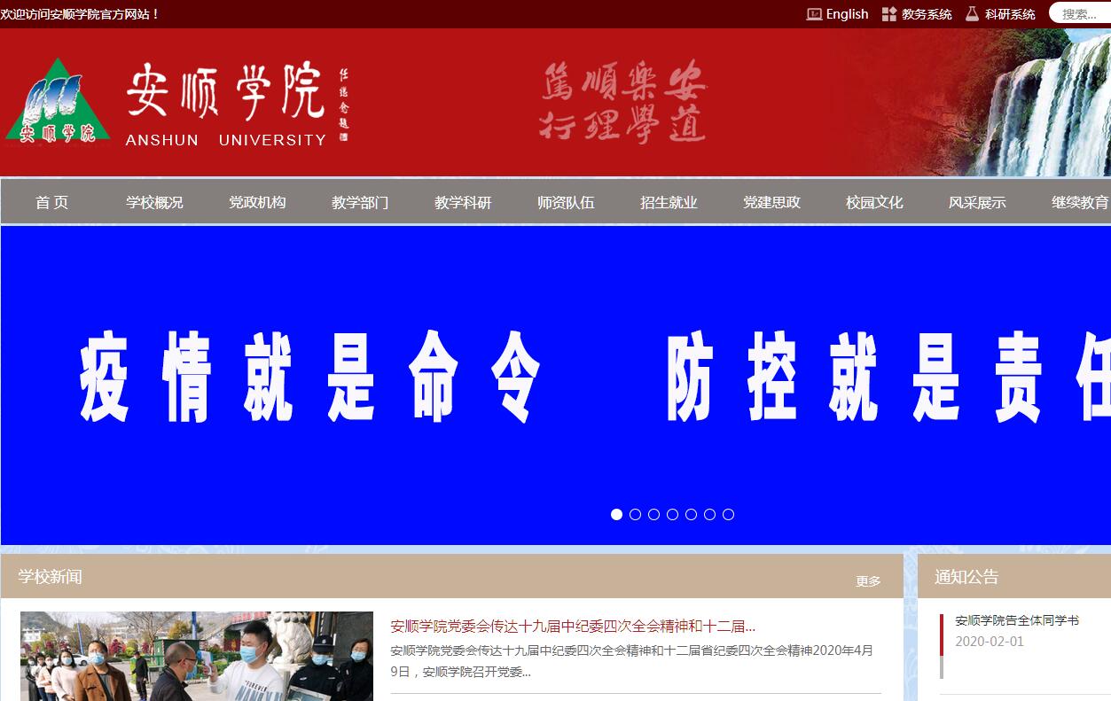 安顺学院坐落在贵州省安顺市。安顺市位于贵州省中西部,素有“黔之腹、滇之喉、粤蜀之唇齿”之称。全市总面积9267平方公里,总人口300万人,其中少数民族人口占总人口的39%。安顺历史悠久,文化底蕴深厚,是贵州省历史文化名城,拥有 “亚洲文明之灯”普定穿洞古人类文化遗址、“千古之谜”关岭“红崖天书”、“世界唯一”的明代屯堡村落、“中国戏剧活化石”安顺地戏、“东方第一染”安顺蜡染,有“中国瀑乡”、“屯堡文化之乡”、“蜡染之乡”、“西部之秀”的美誉,是国家最早确定的甲类旅游开放城市、中国优秀旅游城市、中国最美丽城市、中国十大特色休闲城市。安顺是中国共产党老一辈无产阶级革命家、全国“100位为新中国成立做出突出贡献的英雄模范人物”王若飞同志的故乡,王若飞故居是全国爱国主义教育基地、全国首批百个红色旅游经典景点之一。安顺是全国文明城市提名城市、国家卫生城市、全国双拥模范城、国家园林城市,是国家首批新型城镇化综合试点城市、国家首批全域旅游示范区创建单位、全国首个农村金融信用市、全国首批通用航空产业综合示范区、国家高新技术产业开发区、国家第二批生态修复城市修补试点城市、全国唯一的“省部共建”石漠化片区水利精准扶贫示范区。 安顺学院是2006年2月经国家教育部批准组建,实行“省市共建、以市为主”的普通本科高校。学校办学历史可追溯到1938年成立的黔江师范学校,历经黔江师范学校、黔江中学、省立安顺师范学校、安顺师范高等专科学校等发展阶段,迄今已有近80年的历史。学校至今已为社会培养了6万余名各类合格专业人才,毕业生大多工作在基础教育、基层政府和企事业单位第一线,为我国西南地区教育事业和地方经济社会发展做出了重大贡献。学校2015年通过教育部普通高等学校本科教学工作合格评估,2016年增列为贵州省硕士学位授权立项建设单位。 学校拥有东、西、北三个校区。西校区为主校区(校本部),学校占地面积1113亩,教学行政用房10.78万平方米,学生宿舍5.01万平方米,馆藏纸质图书58万余册。学校现有在职教职工856人(含附属中学95人),师资队伍总人数655人,其中专任教师430人,教授等正高级职称59人,副教授等副高级职称246人,具有硕士、博士学位师资527人,外籍教师3人;有贵州省省管专家3人,享受省政府津贴专家2人,省优秀青年科技人才2人,省级教学名师3人,省高校哲学社会科学学术带头人3人,安顺市市管专家24人。开设有以本科教育为主的经济学、法学、教育学、文学、历史学、理学、工学、农学、管理学、艺术学10个学科门类共57个本科专业(方向),全日制本专科在校生近8000人。 学校现设有16个二级学院、4个教研教学部、8个教学科研辅助机构以及省级院士工作站、省2011协同创新中心、省人文社科研究基地、省级学会、省级社科研究机构、省级少数民族传统体育项目训练基地、省级国家职业技能鉴定所、省级特殊教育师资培训中心、省教育厅工程中心各1个和省教育厅创新团队2个。有省级特色重点学科1个、省级重点学科2个、省级重点支持学科7个、省级特色专业2个、省级专业综合改革试点专业5个、省级特色重点实验室1个、省级实验教学示范中心1个、省级教学团队3个、校级研究中心3个。 学校主动适应地方经济社会发展对专业人才的要求,致力于培养基础宽厚、素质全面、实践能力强、适应基础教育与地方经济社会发展需要的高素质应用型人才。学校科研实力逐年提升。“十二五”期间,学校教师共承担科研项目744项,其中国家级项目13项,省级项目145项,地厅级项目267项。学校教师累计发表论文2473篇,其中被SCI、SSCI、EI等科学引文收录68篇,出版著作38部。目前有省级“双一流”建设项目5个。 学校以《关于进一步促进贵州经济社会又好又快发展的若干意见》、《教育部关于全面提高高等教育质量的若干意见》、《中共贵州省委贵州省人民政府关于进一步支持安顺加快经济社会发展的意见》和《中共贵州省委 贵州省人民政府关于支持高校加快改革发展的意见》文件精神为契机,进一步坚定了建设有鲜明地方特色的应用型本科高校的发展方向,明确了高素质应用型专业人才培养目标,大力实施“质量立校、特色兴校、人才强校、科研促校”战略,全面提高教育教学质量、科研水平和社会服务能力,教学中心地位不断凸显,办学特色初步显现,服务地方能力持续增强,逐步进入了以内涵式发展为主的新阶段。学校发展呈现出良好态势,广大师生对未来充满信心,齐心协力,奋发图强,努力将安顺学院建设成为办学特色鲜明的地方性应用型大学。 办学指导思想:坚持中国特色社会主义办学方向,以科学发展观为指导,全面贯彻落实党和国家的教育方针,立足安顺、服务贵州、走向全国;坚持质量立校战略,以教学为中心,深化教育教学改革,构建质量管理体系,全面提高人才培养质量;坚持特色兴校战略,彰显特色,突出亮点,以特色引领学校教育事业发展;坚持人才强校战略,以提升教师整体水平为核心,加大人才引进力度,延揽和造就优秀学者;坚持科研促校战略,加强科研管理,推动应用研究和科研成果转化,提高科研水平,促进科研与教学互动发展。以“四大战略”促进提升学校办学水平,加强应用型人才培养,主动服务区域经济社会发展