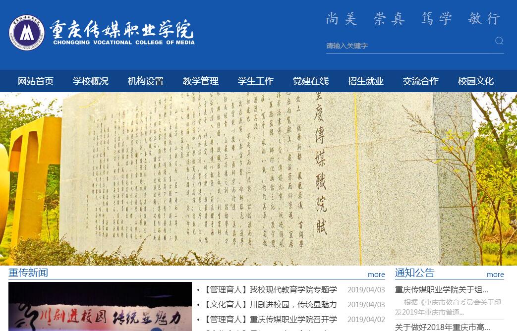 重庆传媒职业学院是重庆市人民政府批准、教育部备案设立的全日制普通高等院校,学校坐落于链接重庆与成都的重要节点城市、中国人民志愿军特等功臣邱少云的故乡——铜梁。这里宜学宜居,有着“重庆最具幸福感城市”之美誉,自然环境优美,文化底蕴深厚。学校建立于2008年,学校占地500余亩,是重庆市唯一一所以数字传媒为主线,集文化传媒策划、制作、运营、云媒资共享信息技术和经济管理、公共服务与事业管理等多学科相互渗透,突出应用和创新特色的高等职业学校。学校设有经济管理学院和数字媒体学院等二级学院,涵盖了新闻、影视、艺术、财务、电子商务、现代服务与管理等多个专业,学校面向全国各省市招生,目前在校学生4000余人。学校坚持“立足重庆,面向西部,服务‘一带一路’,培养应用型人才,建设多学科协调发展的应用型高等院校”的办学定位,秉承“尚美、崇真、笃学、敏行”的校训,坚持凝练打造“质量立校、专业领校、人才强校、科研兴校、开放办校、依法治校”的办学特色。建校10年来,已经为社会培养了上万名合格人才,为促进地方经济社会发展做出了重要贡献。学校拥有一支学有专长、结构合理、富有创新精神的“双师型”专兼职教师队伍,现有专任教师100余人,副高级及以上职称教师21名,研究生以上学位33名,教育部教学指导委员会成员1名。其中副高以上职称占30%,硕士学位以上教师占50%,“双师型”教师占60%以上。学校教师分别来自于南开大学、四川大学、重庆大学、成都电子科技大学、中国传媒大学、西南大学、重庆师范大学等著名高等院校,具有较高的学术水平和丰富的教学经验。同时,学校还聘请了十余位国内外知名教授担任我院客座教授。学校具有高配置的校内外实习实训基地,全功能数字化教室、标准化图书馆、电子阅览室、高标准配置演播室、摄影摄像室、微机室、语音室、电视节目制作室、画室、艺术创意室、非线性编辑室、图形工作站、动漫画实训基地、形体艺术室、灯光室、化妆室、物流与报关实习实训基地、微型企业创业园、云媒资共享实验室(手机电视台)等校内学习和实训平台。与世界500强企业怡亚通集团公司合作建立了以移动互联网相关技术为核心的“众创学院”,与华三通讯技术公司合作成立了“华三网络学院”,与华龙网、大渝网、深圳电视台、经济日报、中铁华夏、重庆茂洋、重庆广电集团、上海佳吉物流、北京通用航空、立方国际数字科技集团等大型企业建立了长期的校外实训基地。同时还开设了具有行业特色的“立方国际可视化”、“国际邮轮乘务”、“北京通用航空服务”等定向班。学生在校期间即可参与企业项目制作,实现零距离上岗。学生顶岗实习率达100%,一次性就业率持续保持95%以上。学校办学理念先进,文化底蕴深厚,校园环境优静,是学生养德求知、成就梦想的圣地。