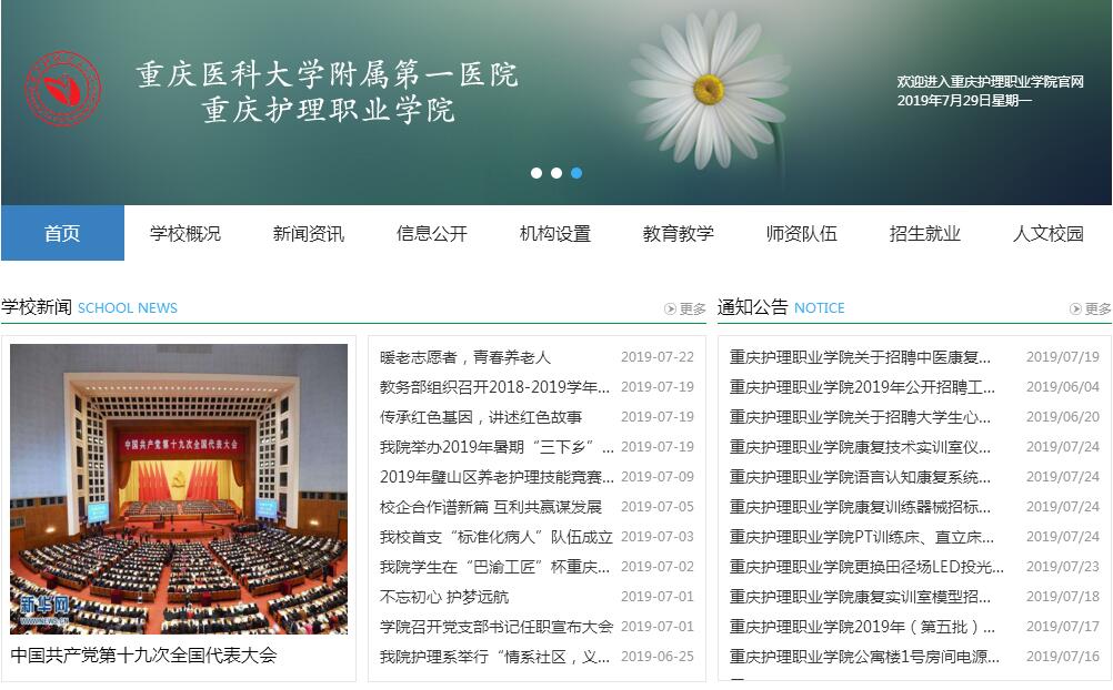 重庆护理职业学院于2016年由重庆市人民政府批准设立,主管部门为重庆市教育委员会,是一所实施全日制专科层次高等教育的民办非营利高等职业学校(教育部代码:14576)。学院由重庆医科大学附属第一医院全额出资举办,位于重庆市璧山区来凤街道解放东路600号,毗邻重庆医科大学附属第一医院青杠老年护养中心,占地287.95亩,设护理、助产、康复治疗技术、老年保健与管理、社区康复5个专业,2016年进行首届招生,目前在校生近2000人。学院目前建有基础护理实训室、健康评估实训室、ICU模拟病房、专科护理实训室、康复治疗技术实训室、老年保健与管理实训室、助产实训室、人体形态学实训室、药理学实验室、组胚学实验室等22间校内实训室。重庆医科大学附属第一医院青杠老年护养中心作为学院实习实训基地,建有老年实训室、康复实训室等12间校外实训室。学院高度重视校企合作模式,积极推动产教融合,通过考察、遴选签订了10所三级医院,16所二级医院作为学生实习基地。学院现有专任教师93人,其中具有高级职称教师26人,具有研究生学历的教师36人,“双师型”教师占专任教师的50%以上,学院聘请大量来自于大型医疗机构且具有丰富行业经验和较高实践技能水平的行家能手担任外聘教师,指导学生实习实践。学院积极利用举办方重庆医科大学附属第一医院集团的丰富资源,探索“医养教”深度融合模式,坚持以培养高素质技术技能型护理人才为主要任务,以养老服务人才培养为特色,努力把学院建设成为“优势突出、特色鲜明、质量上乘、西部一流、辐射全国”的高素质护理等服务人才培养培训基地,紧紧围绕党的十九大精神,积极践行健康中国实施战略。