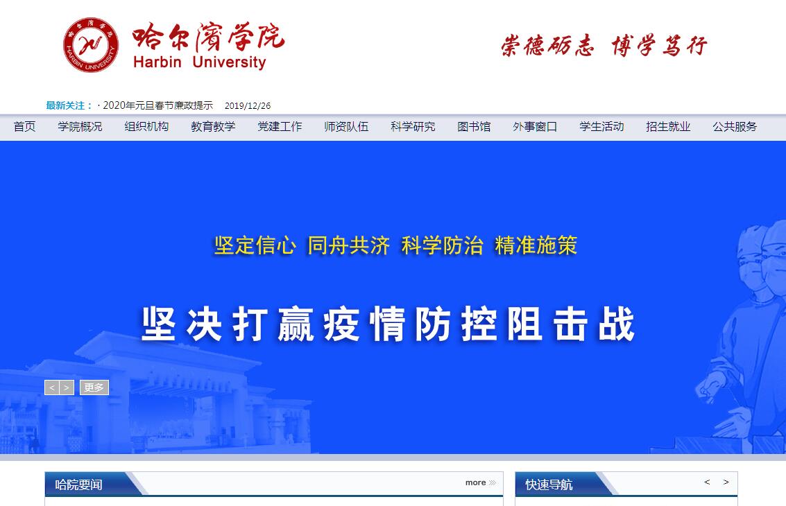 哈尔滨学院是一所经国家教育部批准的综合性地方普通本科院校。2000年由原哈尔滨大学、哈尔滨师范专科学校等六所学校合并而成。学校实行“省市共建,以市为主”的办学体制。面向区域经济社会发展,致力于培养高素质、高技能的应用型人才。 学校坐落于素有“东方小巴黎”美誉的冰城——哈尔滨市,位于哈西新区核心地带,地处哈尔滨高校集中的学府区域。学校占地面积65万平方米,校区错落分布、疏朗有致,中西合璧、园林景观。精致的欧亚建筑,尽显异国情调;苍挺的松树林,散发着静雅的气息和北疆的坚毅;夏季的丁香芬芳、冬季的冰雪景致,彰显浓郁独特的北国风情。学校被黑龙江省政府命名为“花园式单位”。学校现设有12个二级学院,开设46个本科专业,涵盖了经济学、法学、教育学、文学、历史学、理学、工学、管理学、艺术学等9大学科门类。小学教育专业是国家级特色专业建设点,艺术设计是国家级专业综合改革试点项目,软件工程学科是省级重点建设学科,承担教育部卓越小学教师培养改革项目。省级重点专业、省级重点实验室、省级实验教学示范中心、省级研究基地9个。近五年来,学校承担国家、省市级科研项目271项;获各级各类科研成果奖249项。2017年获批黑龙江省高等学校硕士学位授权立项建设单位、哈尔滨市博士后创业实践基地。学校现有专任教师656人,其中教授、副教授 328 人,占教师总数的50%;具有博士、硕士学位的教师490 人,占教师总数的74.7%。享受国务院和省政府特殊津贴专家5人,省教学名师、省优秀中青年专家、市有突出贡献中青年专家13人,多名教师获国家优秀教师奖、国家优秀教育工作者奖、曾宪梓奖等奖项。国家级教学团队、省级教学团队,省级研究团队、市专业领军人才梯队10个。教育部视频公开课1门,省级精品课16门。学校面向全国26个省(自治区、直辖市)招生,全日制在校生11255人。建校以来,学校已为社会培养了6万余名高素质应用型人才,毕业生在教育、科技、文化及企事业等各自岗位上建功立业,为地方经济建设和社会发展发挥着积极作用。学校积极开展“校企”“校政”合作,分别与海航集团、中软集团、哈尔滨地铁集团等知名企业建立合作关系;与政府相关部门合作共建哈尔滨市党风廉政建设理论研究基地、哈尔滨市民族宗教工作研究培训基地、黑龙江湿地培训中心、哈尔滨湿地研究所等科研机构;与哈尔滨市南岗区教育局合作共建哈尔滨学院附属小学。学校坚持开放办学,先后与美国、俄罗斯、英国、法国、日本、韩国等10余所高校建立了友好合作关系,连续承办6届海外华裔青少年冬令营活动。