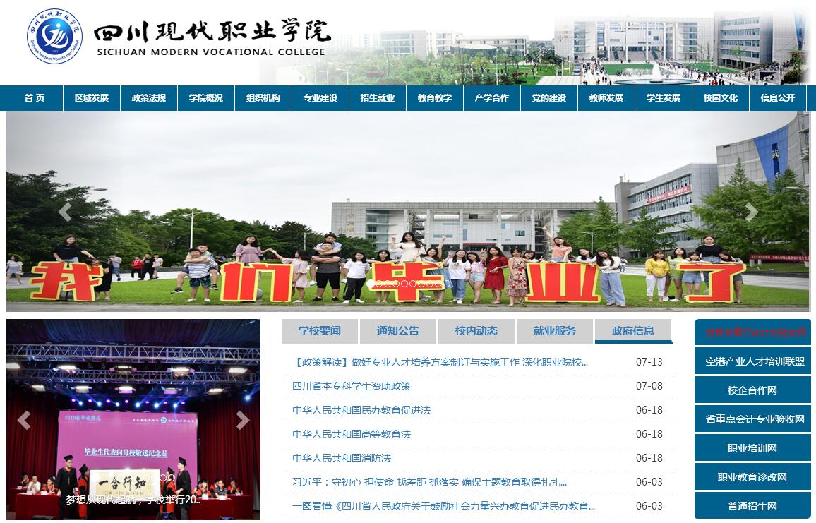 四川现代职业学院位于四川省成都市,是教育部批准设立的四川省第一批民办高校,创办于1993年,前身为四川师范大学航空港校区,开展普通本专科教育,从2008年开始举办普通高等专科职业教育。学院校园占地 511.8亩,校内环境优美,设施设备齐全。现有普通全日制在校生11000余人,专兼职教师700多名。针对四川省、成都市重点产业布局,构建了轻化工、机械设计制造、自动化、电子信息、计算机、通信、法律事务、建筑设计、建设工程管理、房地产、财务会计、金融、电子商务、物流、经济贸易、市场营销、餐饮、旅游专业类,共设有32个专业,其中省级重点专业1个,省民办重点特色专业3个,省级现代学徒制试点单位专业2个,校级重点特色专业群1个,校级重点特色专业5个,校级重点特色培育专业2个。校外建有900余家实训实习基地,校企深度合作企业200余家,建有环球国际旅游学院、中电锦江电子学院、新成储物流产业学院、易田电商产业学院、四川三叶集团商学院和室内装饰行业学院6个二级产业(行业)学院。校内建有90多个实训室、1个藏书84.8万余册的图书馆、2个标准塑胶运动场以及灯光网球场、篮球场和相应的健身设施。学生公寓配备热水器、空调等基本生活设施,校园网络实现WiFi全院覆盖。学院践行与中国特色社会主义教育息息相通的陶行知教育思想,坚持“产教融合、校企合作、工学结合、行知合一”的基本办学原则,秉承“以学生发展为本,人人成才;以人才培养为主,服务社会”的办学理念,依托四川天府新区腹地的地理优势,构建了“园区、企业、学校”和“协会、企业、学校” 两个三位一体办学模式,形成了基于“学做、工学、实习就业”三个合一的“1234”人才培养思路,实施“分级分段分岗工学交替的合作育人”的人才培养模式。学院坚持德育为首,以“明德、致远、博雅、健康”四大育人工程为载体,全面推进素质教育,促进学生全面发展;以学生职场能力培养为落脚点,构建了“理论教学、实践教学、素质教育、创业创新教育”四维一体的课程体系,落实全方位育人理念;以课程融通为工作思路,全面推行双证教育,目前学生双证获取率达到89%;以职业技能培训、职业技能竞赛为抓手,助推学生职业技能提高,近年来,1000多名学生参加了国家级、省级技能竞赛,其中330多名学生获取了100多个项目的不同奖项;29名教师获得省级职业技能大赛一、二、三等奖。办学成效日益明显,就业率持续上升,近三年毕业生平均一次性就业率为99.41%,成都就业率达到78.44 %,专业对口率达到93%,顶岗实习就业转化率89.03%,多家企业对我院毕业生给予了高度评价。学院先后荣获“四川省民办教育先进集体”“四川省依法治校示范学院”“四川省大学生思想政治教育先进集体”“四川省高校后勤管理先进集体”“四川省高等职业院校体育工作先进单位”“四川省高新技术考试典型单位”“成都十大最美高校”等称号。