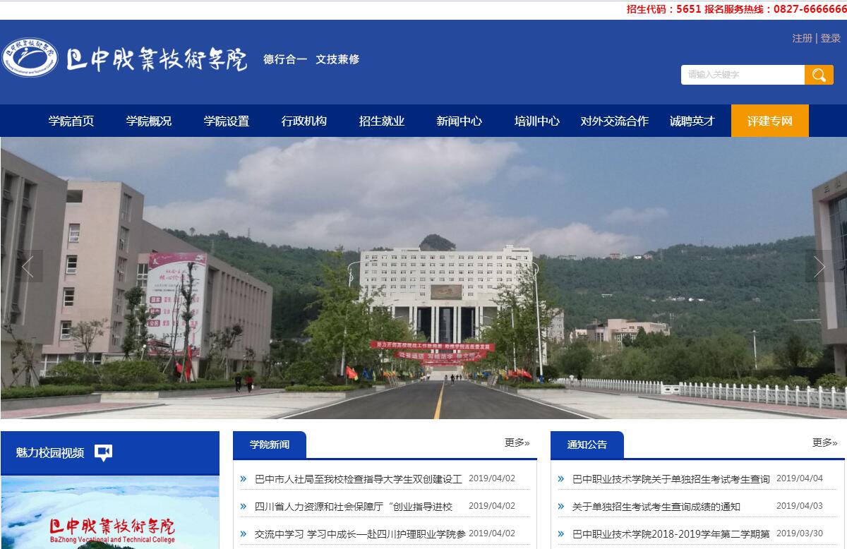 巴中职业技术学院,是2011年中共巴中市委、巴中市人民政府实施“统筹城乡、追赶跨越、加快发展”战略重点招商引资重点项目,由四川省艾林投资集团有限公司独资筹办;2013年2月经四川省人民政府批准,教育部备案,由四川省教育厅主管的全日制普通高等学校。建校后先后整合了1954年创建的巴中师范学校、1958年创建的通江中等职业卫生学校和1990年创建的巴中市技工学校,是革命老区巴中首座全日制高等学府。学校占地面积500亩(不包含通江校区),规划总投资7.6余亿元,总建筑面积24.26万平方米,总规划建成容纳1万余学生的全日制高职院校。现已建成校舍总建筑面积148889.73平方米,教学行政用房面积81760.04平方米(其中,实验室、实习场所面积30911.35平方米),学生宿舍面积46212.87平方米;教学用计算机台数844台,馆藏纸质图书47.64万册,固定资产总值57548.35万元,教学科研仪器设备总值3131.91万元。现有学校全日制高职在校生5401人,专任教师209人,校外兼职教师82人。副高以上职称64人,硕博研究生66人,双师素质教师117人。学校设有教育学院、管理学院、医学院、理工学院、基础教学部、思政教学部6个教学单位,设有党委办公室、学校办公室、人事处、教务处、学生处、科研处、教学督导室、招就处、财务处、后勤处、工会、图书信息中心等25个内设机构。现开设有学前教育、计算机网络技术、旅游管理、会计、护理、汽车检测与维修技术、物流管理、建筑工程技术等26个全日制高职专业。学校建立多元化的提升学历教育的发展模式。与西华大学、四川文理学院和内江师范学院等本科院校紧密合作,为在校学生搭建了专升本的平台。学校与欧洲知名院校提赛德大学、格鲁斯特大学、切斯特大学等达成联合办学协议,学生在获得我院专科毕业证书后,可继续在国外大学深造,国家承认其学历。学校自建校以来,得到省、市各级领导和社会各界人士的关心支持下。省人大主任(时任省委书记)王东明、省委常委省农工委主任曲木史哈、时任省委常委统战部长李静、副省长杨兴平,省委教工委书记、省教育厅厅长朱世宏,省教厅李光华、刘立云、张澜涛等领导,及巴中市历任市委书记等领导相继莅临我校视察指导,充分肯定了学校的办学成效,做出“要加快巴中职业技术学院建设发展”的重要指示。在省市领导关心关怀下,全体师生同舟共济,与时俱进,学校得到又好又快发展“双师素质”的教师队伍茁壮成长,管理不断科学化、人性化,“立德树人”,教育教学质量稳步提升;师生参加省、市竞赛获奖100余项,发表论文255篇,主参编教材60余本,省、市级科研项目36项,获得国家专利21项。学校先后被确定为国家职业技能鉴定所、JYPC全国职业资格考试认证中心、全国应用型人才培养工程培养基地;荣获教育部国防特色学校,四川省五四红旗团委、平安校园先进单位、体育工作先进单位、民族团结进步创建活动示范单位、科技文化卫生“三下乡”活动先进单位,巴中经开区青年就业创业示范基地等荣誉称号。学校办学影响力逐步扩大,不断为区域经济社会发展彰显其职能作用。