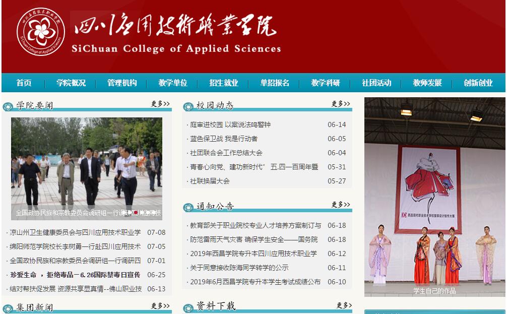 四川应用技术职业学院是经四川省人民政府批准成立、国家教育部备案、四川省教育厅主管,纳入国家统招计划、具有独立颁发普通大学专科毕业证书资格的全日制普通高等学校,是四川省民族地区第一所高等职业院校。学院坐落于著名的“航天城”、“春天栖息的城市”——西昌市。学院师资力量强,现有专任教师280人,其中副高以上职称75人,研究生以上学历80人,75%的专业课教师具有双师素质。学院开设学前教育、护理、小学教育、机械制造与自动化、电气自动化技术、汽车检测与维修技术、建筑工程技术、计算机应用技术、宝玉石鉴定与加工技术、财务信息管理、会计、电子商务、行政管理、旅游管理、酒店管理、休闲体育等16个专业。学院设有护理专业实训室、车工实训车间、汽车检测与维修实训室等48个校内实训基地和70个校外实训基地。校园现有教学行政用房16万平方米,图书馆现有纸质图书16万册,电子图书20万余册。学院推行“校企合作、工学结合”的培养模式和“五个对接”的办学模式,秉承“以服务为宗旨,以就业为导向,以特色求发展,以能力赢市场”的办学理念,强化学生实践动手能力的培养,为高新企业输送大批高素质人才。学院的人才培养模式及工作成就得到了各级领导的充分肯定,2014年6月学院理事会理事长苏华在全国职业教育工作会议上作了典型发言,并受到李克强总理、刘延东副总理、马凯副总理的亲切接见。2016年2月,国务院副总理刘延东、教育部副部长朱之文、四川省省长尹力、四川省教育厅厅长朱世宏来我院视察调研,对学院的办学给予了充分肯定。2016年3月,学院理事会理事长苏华在全国政协十二届四次会议上作了题为《增加职教高考,做到因材施教》的大会发言。学院本着为学生成才服务的宗旨,部分优秀毕业生可以直升到其它本科院校学习。同时,面向全体在校学生推行专本套读,学生在学院毕业后,不但可以拿到学院统招专科毕业证,经考核合格还可拿到相关院校的本科毕业证,大大提高了学生学习的成果及毕业学历的含金量。