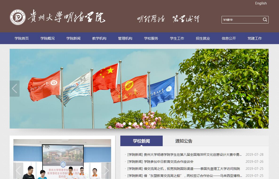 贵州大学明德学院创建于2001年6月,2004年经教育部备案确认由贵州工业大学国际合作学院更名为贵州工业大学明德学院,同年8月,贵州工业大学与贵州大学合并组建新的贵州大学,贵州工业大学明德学院更名为贵州大学明德学院。2013年9月,贵州大学与泰豪集团签订办学协议,合作举办贵州大学明德学院。截止2019年3月,学院在校生规模达9829人。学院现有教职工511人,其中具有高级职称167人(占比32.67%),中级职称183人(占比35.81%)。教师队伍中拥有博士学位22人,硕士学位258人,具有硕士及以上学位教师占教师总数的54.79%。学院现拥有众多具备企业工作经验、具有相关专业行业领域职业/执业资格证书的“双师型”人才120人,占教师总数的23.48%。学院新校区坐落于美丽的花溪大学城,目前新校区建设一期工程基本竣工,学院占地面积955亩,建筑面积达到56万余平方米,其中教室9.2万余平方米,学生宿舍12万平方米,实验室3.7万余平方米、图书馆2.4万平方米、体育馆0.6万平方米,学生活动中心、学生公寓、食堂等教学与生活设施配套齐全,学院已成为环境优美,设施完善的新机制本科独立学院。学院始终以马克思列宁主义、毛泽东思想、邓小平理论、和“三个代表”重要思想、科学发展观、习近平新时代中国特色社会主义思想为指导,全面贯彻党的教育方针,以立德树人为根本,以理想信念教育为核心,以社会主义核心价值观为引领,以全面提高人才培养能力为关键,遵循高等教育教学规律,秉承“明理厚德,笃学诚行”的校训和“艰苦奋斗,自强不息”的办学精神,积极探索“产教融合、产学融合、校企合作”的办学模式,抓好“招好生、教好学、育好人、就好业”的育人环节链,围绕贵州大扶贫、大数据、大生态的三大战略行动,深化教育教学改革,以社会需求为导向,致力于培养服务贵州区域经济社会发展的--“三大一先”(大数据、大文化、大健康及先进制造)、掌握科学思维方法、具有较强的获取知识和创新思维能力的高级应用型人才,形成“全员、全过程、全方位”的育人机制。贵州大学明德学院由贵州大学与泰豪集团合作举办。贵州大学创建于1902年,拥有雄厚的教育教学资源,为国家“211工程”部省共建、国家世界一流学科建设高校,拥有众多优质师资资源,学科建设成绩显著,立足贵州,全面服务于贵州经济社会发展,为实现贵州与全国同步全面建成小康社会做出了巨大贡献。泰豪集团成立于1988年,并于2002年7月在上海证券交易所上市。公司致力于信息技术的研发和应用,是中国电子信息百强企业、中国民营制造企业500强,企业已形成以智慧能源、军工装备、数字创意、智慧城市、创业投资业务为主的发展格局,在全国拥有40多家分、子公司,以及10多个高科技产业园区,产品应用于全球100多个国家和地区。在贵州大学和泰豪集团的紧密合作下,学院坚持“依托贵州大学优质教育资源,借助泰豪集团优质市场资源,以师资队伍建设为核心、以学科建设为龙头、以科学管理为基础、以社会需求为导向,培养专业基础知识扎实和实践能力强的高级应用型本科人才”的办学思想,提出“建设一个专业、培养一批人才、服务一批企业、形成一个产业”的办学理念,努力将学院建设成为“全国独立本科院校十强”和中国“双创”一流应用型大学。学院通过合理设置并适时调整学科专业结构,形成了以工科专业为主,经济、管理、文化创意等多学科协调发展的学科专业体系。现有信息工程系、数字传媒系、健康管理系、电气工程系、土木工程系和经济管理系6个教学单位,开设有计算机科学与技术、通信工程、电子信息工程、数字媒体艺术/技术、生物工程、土木工程、水利水电工程、建筑学、机械设计制造及其自动化、电气工程及其自动化、会计学、财务管理、工商管理、行政管理、英语等39个本科专业,其中工学类专业18个,工科优势明显。建校18年来,学院共培养了1.8万余名毕业生,年终就业率每年均超过90%,部分工科专业就业率连续多年超过98%,为贵州经济社会和高等教育的发展做出了重要的贡献。