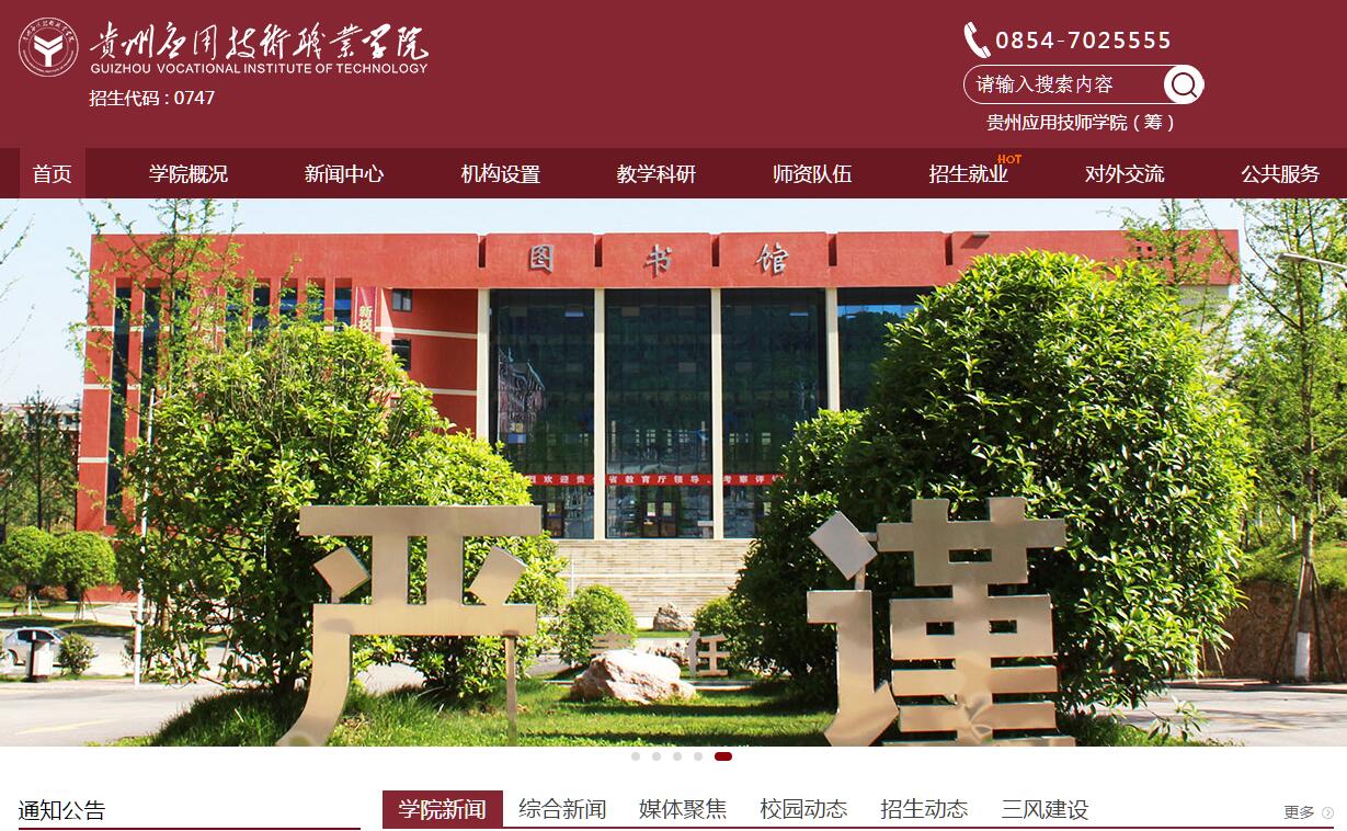 贵州应用技术职业学院(Guizhou Vocational Institute Of Technology)是经贵州省人民政府批准,教育部备案的全日制普通高等院校。学院全面贯彻党的教育方针,坚持社会主义办学方向,坚持立德树人,注重内涵发展,以质量求生存,以特色求发展,以服务为宗旨,以就业为导向。立足黔南,面向贵州,辐射西南,培养高素质、高技术、高技能应用型人才。学院坐落于贵州历史文化名城福泉市酒金河畔,环境优美、设施先进、管理规范、特色鲜明,是家长乐送、学生乐学、教师乐教、企业乐用的“快乐校园”。学院规划建设用地600余亩,建筑面积25万平方米,教学设施设备5500余万元,总投资达8亿元。一期工程占地面积320多亩,建有教学大楼、现代化图书馆、学生食堂、学生公寓、高标准的生态田径运动场、足球场、篮球场、素质拓展场,是广大学生学习成长的理想场所。学院还为各专业配备满足教育教学需要的各类仪器价值3000余万元,建成了50多个实验、实训室。与希望集团、上海大众、瓮福集团有限责任公司、川恒化工股份有限责任公司和贵州范围内20余家县级医院等100多家明星企业签订校企合作协议,建立了实训就业基地。学院设有教学事务部、学生事务部、综合事务部等10余个管理机构,设有护理系、汽车工程系、经济贸易系、化学工程系、旅游系等6个教学系部,开设了汽车技术服务与营销、汽车检测与维修技术、汽车改装技术、汽车新能源技术、城市轨道交通运营管理、财务管理、电子商务、会计、市场营销、学前教育、护理、应用化工技术、空中乘务、高速铁路客运乘务、药品生产技术、精细化工技术、幼儿发展与健康管理、旅游等十多个专业。学院现有专职教师近280人,其中副高级以上职称占教师总人数20%以上,“双师型”占教师总数的25%以上,硕士及以上学历教师达到18%以上。学院实行开门办学,走产学研结合的道路,与百余家企业深度合作,共建实习、实训就业基地,共同培养学生,为学生实习、高质量就业提供了广阔平台。