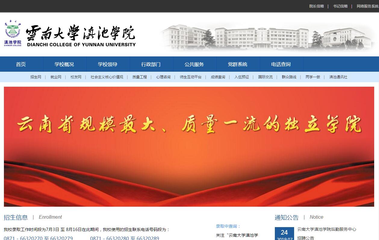 云南大学滇池学院创办于2001年,是由国家“双一流”大学云南大学申办、教育部批准设立的云南省规模最大、人才培养质量一流的独立学院。学校现有2个校区——昆明滇池国家旅游度假区校区、嵩明职教园区校区,占地面积1306亩,教学仪器设备总值约9769.06万元;体育文化设施完备,后勤服务设施功能齐全;学校图书馆藏书149.5万册,电子图书717210册;校园网络信息点共有1.9万余个,遍布校园各区域,网络出口宽带20G。学校现有8个学科门类,50个本科专业,覆盖了经、法、教育、文、理、工、管、艺术等多门学科。现有11个分院、2个公共教学部、全日制在校学生达1.9万余人,毕业生4万余人。人才培养质量成果显著。学校先后共有2500余人考取研究生,其中70%考取“985”和“211”院校,被社会誉为“研究生的摇篮”。北京大学、清华大学、中国人民大学、复旦大学等24所“985”大学和中国社科院均有我校学生在攻读研究生。3500余人考取公务员和事业单位,被社会誉为“公务员的摇篮”。司法考试通过率达到参考学生人数的50%左右。助理会计师等资格证书获证率居全省民办本科高校前列。英语专业八级、四级考试以及日语、泰语、越南语专业考级通过率名列全省独立学院第一,全省高校前列。大学英语四级、六级考试和计算机二级考试通过率连续十余年名列全省独立学院第一,全省高校前列。学院现有国家级质量工程建设项目19项,其中,教育部“新工科”项目1项,规划教材1部。云南省质量工程建设项目67项。教育部大学生创新创业训练计划项目70项,云南省大学生创新创业训练计划项目207项。校园文化丰富。学校以社会主义核心价值观为引领,开设了“英才讲坛”、 “滇池讲坛”、“校友讲坛”等系列品牌讲座,开展“一院一品、一院一赛”等校园文化活动,参与学生达到学生总数的85%。学校40余个学生社团涵盖了社会公益、学习实践、文化艺术、体育竞技、创业实践等内容。滇池学院女子排球队是唯一一支参加全国女排甲A联赛的学校体育团队。创新创业教育改革成果丰硕。“彩云本草”项目代表云南省参加首届“青年红色筑梦之旅”活动,被教育部列为六个重点项目之一,2017年8月15日收到中共中央总书记写给参加活动全体学生的回信,中央电视台《新闻联播》报道了相关情况。是云南省高校中唯一四次进入中国“互联网+”大学生创新创业大赛全国总决赛的高校,并在四届比赛中获得3金1银3铜的优异成绩,金奖数名列全国2600多所高校第15位,名列全国独立学院、民办高校第一,占云南省金奖总数的3/4。在四次大赛中,学生在第一、三、四届大赛中代表所有参赛高校分别向时任中共中央政治局委员、国务院副总理刘延东和中共中央政治局委员、国务院副总理孙春兰汇报“双创”成果,创造中国高校之最。此外,还是全省高校中唯一获得全国“青年红色筑梦之旅先进集体”、“最佳带动就业奖”、“优秀指导教师奖”的学校。在云南赛区比赛中,获得3个冠军和15个金奖。“山己人思”项目获得2018大学生创业世界杯中国赛区金奖,并与清华大学一道代表中国赴丹麦哥本哈根参加全球总决赛。学生参加数学建模竞赛、电子设计大赛、软件设计大赛、“外研社杯”英语竞赛等各类国际、国内竞赛,800余个项目,2000余人次获得国际、国家、省级奖励。其中,获得过美国数学建模竞赛一等奖。2018年在团省委评选的“云南省十大向上向善好青年”中,2人来自滇池学院。3次获得云南省大学生年度人物称号。2015年以来,学校分别被教育部授予“全国毕业生就业典型经验高校”(又称全国就业工作50强高校)、“全国深化创新创业教育改革示范高校”、“全国创新创业典型经验高校”(又称创新创业50强高校)称号,是中国独立学院中唯一获表彰的学校。此外,学院连续10年被云南省教育厅评为“大学生就业工作目标责任制考核一等奖”,还被云南省有关部门授予“云南省毕业生就业典型经验高校”、“云南省就业创业先进集体”、“云南省高等院校创新创业教育实践基地”、“云南省实践育人创新创业中心”、“云南省创新创业典型经验高校”、“云南省深化创新创业教育改革示范学校”、云南省“转型发展试点学院”、云南省“特色优势民办高校”、“云南省民办先进高校”、“云南省高校教学管理先进集体”称号,滇池青年创业园被授予“省级青年创业示范园”等。2017年,学校“创新创业教育改革探索与实践”项目,获得云南省第八届教学成果一等奖。学校连续4年入选调研中国大学生暑期实践项目,是中国独立学院、民办高校和云南省高校中唯一4次入围的高校。社会关注度高。中央电视台《新闻联播》、《光明日报》、中国政府网、新华网、人民网、《中国教育报》、《云南日报》、《云南电视台新闻联播》、吉林电视台、《广州日报》、《南风窗》等国家级、省市主流媒体报道我校深化人才培养经验及成果数百次。和谐校园氛围浓厚。学校被省教育厅、省综治委、省公安厅五次评为省级“平安校园”,四次评为“全省企业事业单位治安保卫工作先进集体”。连续两年被省教育厅评为“家庭经济困难学生资助工作先进集体”,被省医保中心评为“大学生医疗保险工作先进集体”。此外还获得云南省首批“5A级社会组织单位”称号,被昆明市总工会授