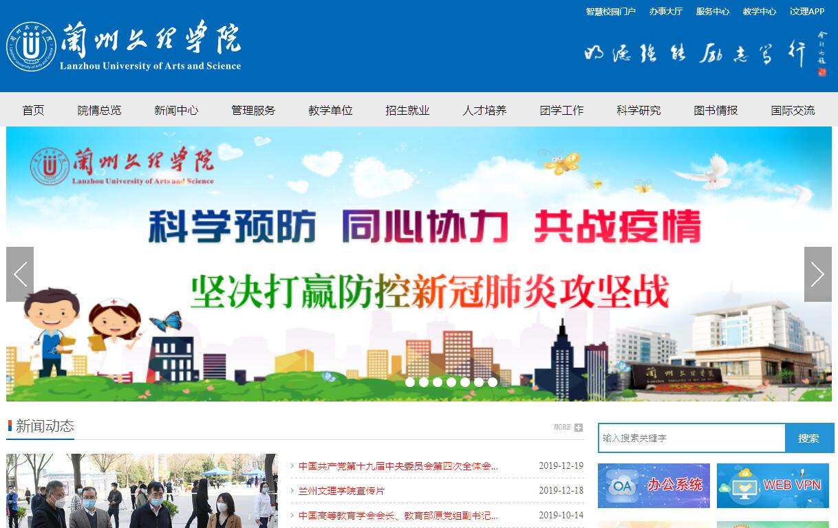 兰州文理学院是2013年经教育部批准设立的普通本科院校。其前身是1950年创立的甘肃教育学院和1985年创办的甘肃联合大学,2012年甘肃省艺术学校并入。2015年被列为甘肃省首批转型发展试点院校。学校地处丝绸之路经济带的重要节点城市——兰州。三千里丝绸之路,八千年华夏文明,甘肃承东启西、连接南北的重要战略区位优势,多姿多彩、灿烂辉煌的自然人文资源,为学校办学育人提供了独特丰厚的资源和巨大广阔的发展空间。在六十多年的发展历程中,学校始终坚持“学以致用,服务社会”的办学理念,不断探索、与时并进,为甘肃经济社会建设,基础教育发展培养了一大批高素质应用型人才。特别是2013年升本以来,学校主动服务甘肃文化大省建设,聚焦文化传媒旅游艺术四大方向转型发展,已经成功转型为一所服务甘肃文化大省、旅游强省建设,为区域文化、旅游及相关产业发展培养高素质应用型人才的高校,特别在文化传媒旅游和艺术四大方向已具有一定的社会影响力,彰显出明显的学科发展优势。学校现有文学院、新闻传播学院、旅游学院、经济管理学院、马克思主义学院、数字媒体学院、传媒工程学院、化工学院、教育学院、外语学院、美术学院、音乐舞蹈学院、社会体育学院、继续教育学院、甘肃省艺术学校等15个教学单位。有汉语言文学、新闻学、播音与主持艺术、数字媒体技术、数据科学与大数据技术、软件工程、广播电视工程、通信工程、环境设计、视觉传达设计、戏剧影视美术设计、音乐表演、舞蹈表演、旅游管理、投资学、社会体育指导与管理等25个本科专业,32个专科专业,涉及文学、工学、艺术学、管理学、经济学、理学、教育学、法学等8个学科门类,初步形成了文化传媒内容类、文化传媒技术类、文化传媒教育类和文化传媒经管类四大学科专业群,形成了以文学、艺术学和工学为支撑,文、理、艺术、工、管等多学科协调发展的学科专业体系。学校现有全日制在校生近11000人。设有甘肃省动漫工程技术研究中心、戏曲人才培养与舞台剧目开发协同创新中心、西北民族文化与旅游发展研究中心、中塔文化研究与交流中心、化工新材料重点实验室等5个省级科研平台,甘肃旅游智库秘书处设在学校。学校现有教职工860余人,其中专任教师528人,具有高级职称的教师259人。学校实施“人才强校”战略,外引内培结合,引进一批高学历、高职称优秀人才;聘请国家一级编导、国家工艺美术大师、著名书画家、著名作家、戏剧“梅花奖”得主等6位行业领军人才为驻校专家,聘请了46位各行业、各学科的高层次优秀人才担任特聘教授;选派骨干教师到国内知名高校或赴美、英、加拿大等10余个国家访学和开展学术交流。学校坚持借力借势开放发展战略,与清华大学、复旦大学、南开大学、兰州大学、北京语言大学、陕西师范大学、中国传媒大学、教育部高等学校发展规划建设中心、中国社会科学院法学研究所、香港浸会大学、香港大公文汇传媒集团、香港大公国际传媒学院、美国中央俄克拉荷马州立大学、福特海斯州立大学、塔吉克斯坦国立艺术学院、音乐学院、美术与设计学院等高校和科研院所开展多领域合作,与甘肃各市州、新疆哈密市等地市开展战略合作,主动服务区域经济社会发展,主动融入国家“一带一路”战略,服务丝绸之路经济带建设。面向未来,兰州文理学院将以习近平新时代中国特色社会主义思想为指导,全面落实立德树人根本任务,坚持“立足甘肃、面向西部,辐射中亚”的服务定位,坚持“学以致用,服务社会”的办学理念,着力提升学校“文化、旅游、传媒和艺术”四大方向产出的市场占有率、业界话语权、政府认可度和社会影响力。坚持“对标追赶、转型提升,建设特色鲜明的应用型大学”的发展方略,致力于为区域文化旅游及相关产业发展培养具有人文情怀、科技素养、国际视野和社会责任感,“懂专业、精实务、能创新”的高素质复合型应用型人才。为把学校建设成为我国西部地区高素质应用型文化、旅游、传媒、艺术人才的重要培养培训基地,甘肃地方文化与丝绸之路文化的重要研究创新和传承传播平台,区域文化、旅游和相关产业发展的重要智库和服务中心而努力奋斗。