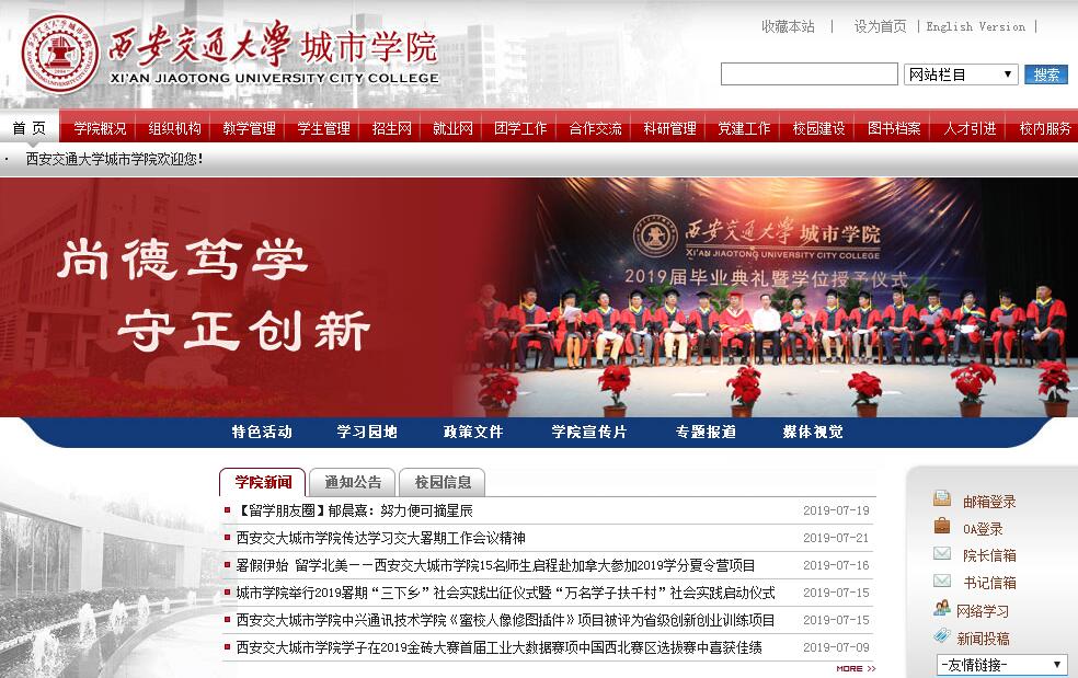 西安交通大学城市学院成立于2004年,是经国家教育部批准、由西安交通大学和西安博通资讯股份有限公司共同举办的新型全日制普通本科高校。院长是西安交通大学博士生导师陈光德教授。学院的校训是:尚德笃学,守正创新。办学定位是:服务陕西,国内一流,国际知名。学院依托西安交通大学百年名校优质的学科资源、雄厚的师资力量、规范而严格的教学管理优势,根据现代科学技术发展趋势和地方经济社会发展需求设置专业。学院面向全国招生,现设有电气与信息工程系、计算机科学与信息管理系、机械工程系、经济系、管理系、外语系、艺术系、护理系、传播系、土木建筑工程系等10个系,4个教学部,16个研究所,44个本科专业,形成了以工科类、经管类专业为支撑,以艺术、文学、医学类专业相配合协调的多学科结构。目前有全日制本科学生8708名。学院秉承西安交通大学优良的办学传统,通过改革传统的教学计划,构建了新的人才培养方案,实施了新的人才培养模式,按照“以学生为主体,以教师为主导,以育人为宗旨,以教学为中心”的办学指导思想,确立了“保证基础,强化实践,注重能力,提升素质”的人才培养指导思想,以培养基础好、技能强、素质高的可持续发展应用型人才为目标,着力构建按社会需求设置专业,按学科大类打好基础,按就业方向安排模块,使学生横向可转移、纵向可提升,形成了“理论教学体系、实践教学体系、素质拓展提升体系”三位一体的应用型人才培养方案。注重培养学生的应用能力、创新意识和综合素质,努力将学生培养成为具有合理知识结构、较高综合素质、持续发展能力、社会责任感和竞争力强的优秀人才。学院坐落于西安经济开发区草滩生态产业园,校园占地523亩,规划建筑面积30万平方米。校园周围绿水环绕、花果飘香、空气清新,基本设施先进,办学条件齐备。现建有多媒体教室、语音实验室、电工电子、计算机、物理等教学实验中心,以及电气信息类、机械能动类、土木建筑类、艺术设计类、医学护理类和经管类等六大类100余个专业实验室,此外还有110多个校外实习实训基地,与中兴通讯、中航联盟等国内著名企业开展联合办学,为学生实践能力和创新能力的培养奠定了基础。学院还有5.5万平方米的篮球、足球、田径、体操等体育设施以及大型学生活动中心等,为学生德、智、体、美全面发展提供了良好的条件。学院图书馆现有面积4347平方米,建设有4个借阅一体的图书借阅室,1个拥有65台计算机的电子阅览室,共有1106个阅览座位;已形成以经济、管理、外语、工程技术类纸质图书为主体的藏书体系。馆藏图书现有83.69万册,数字图书15265GB,期刊1000余种,全文数字期刊8300多种,有万方、维普、超星、读秀等7个电子数据文献库,所有资料全天候全开架。学院自成立之初就非常重视信息化建设,投入了大量资金建设校园网络及管理信息系统,目前已建成覆盖现有园区的校园网信息点11275个,园区内铺设光缆25000余米,实现楼与楼之间主干千兆光缆连接,百兆到桌面的网络基础应用环境。学院建有多媒体教室82间,座位数12749个;语音室5间,座位数238个;计算机教学机房10间,座位数766个。于2007年开通了电信(Chinanet)及中国教育网(Cernet)两条校园网出口,实现了与互联网的连接与资源共享,学院中心机房现有60多台专用服务器,为全院师生提供了多项信息应用服务。学院已经建立起一支学术带头人、教学名师为龙头,以中青年教学骨干为主体,专兼结合、素质优良、整体结构合理且发展趋势良好的师资队伍。学院现有教师530余名,45%具有高级技术职务,85%具有硕士以上学历。享有国务院政府特殊津贴专家4人,省级教学名师4人,教育部教学指导委员会委员5人,国家级教学成果奖获得者11人,国家级精品课程负责人4人,省级精品课程负责人5人,外籍教师2人,“双师双能”型教师150余人。2014年起,学院在省内本科第二批次进行招生,招生质量位居陕西省同类院校第一,处于全国同类院校前列。近三年就业率均达到95%以上。学院的综合声誉不断提高,在社会上逐步树立起了良好的形象与品牌,学院曾被评为“全国先进独立学院”“中国民办高等教育优秀院校”“综合实力20强独立学院”“中国10大品牌独立学院”“全国中学生最信赖的十佳独立学院”和“陕西省文明校园”等。学院学生参加的学科竞赛主要包括中国“互联网+”大学生创新创业大赛、全国大学生数学建模竞赛、全国大学生电子设计大赛、全国大学生机械创新设计大赛、大学生“挑战杯”竞赛等国家级赛事以及部分影响力较大的专科、文体类赛事,累计常规参赛项目三十余项。各类获奖总数累计达765项,其中国家级奖项144项,省级奖项621项。校园文化精彩纷呈,目前学院共有各类学生社团106个,迎新晚会、新年音乐会、毕业生晚会、“星光大道”校园歌手大赛、校园主持人大赛等学生自发组织、自发筹办的活动已逐渐向着多样化和品牌化方向发展。学院坚持国际化办学理念,利用自身的办学优势开展多种国际合作与交流,已与美国、加拿大、澳大利亚、英国、德国、日本、马来西亚、台湾等十多个国家和地区的二十余所知名院校建立了实质性国际合作与交流关系,广泛开展学生交流和合作办学等活动。在校学生均可选择2+2双学士、1+3双学士、3+2本硕双学位、一学期、
