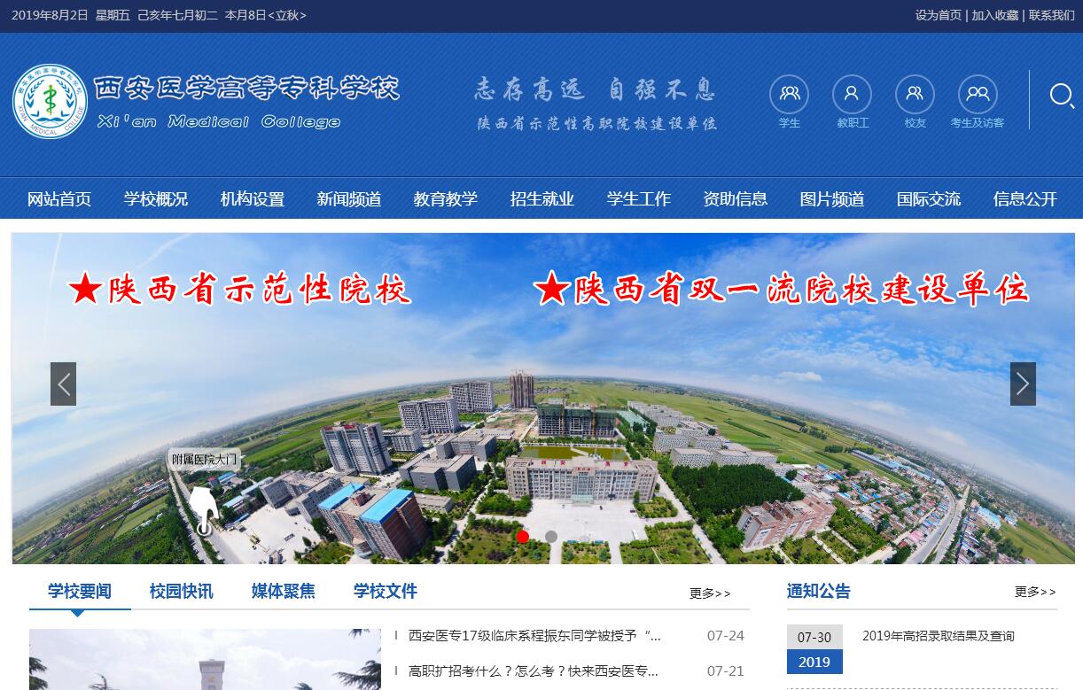 | 网站简介: 西安医学高等专科学校是经国家教育部批准设立的一所全日制普通高等专科学校。学校位于西安市秦渡镇,占地783亩,建筑面积约42.4万平方米,现有各类在校生15000余人。学校先后被确定为国家卫生职业技能鉴定站、国家紧缺人才培训基地、全国首批临床医学(3+2)卓越医生培养计划试点高校、陕西省示范高职院校和陕西省双一流学院建设单位。 |