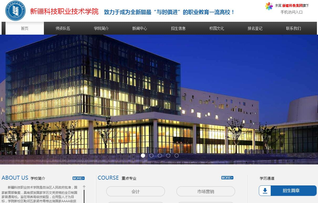 新疆科技职业技术学院是自治区人民政府批准, 国家教育部备案,具有颁发国家学历文凭资格的全日制国家普通高校。学院新校区毗邻五家渠市青格达湖国家AAAA级旅游风景区,校园环境优美。现有教职员工143人,专任教师94人,其中硕士研究生以上学历的教师25人,高级职称10人,实训指导教师25人。学院教学设备完善,基础设施完备。有多媒体语言教室、计算机教室、图书馆、电子阅览室、形体室、电气自动化实训室、工商管理实训室、计算机网络与安全管理实训室及会计电算化实训室等现代化教学活动设施,为学生提供了优质的教育资源及轻松愉快的学习环境。学院采取军校化管理模式,构建平安校园,注重对学生生存能力、生活能力、学习能力、就业能力、发展能力的五大能力培养,旨在培养高级技能型、应用型人才为目标,为学生成功人生奠定坚实基础,为“富民固边”做出贡献。学院实行军校化管理模式,严格按照“六化”标准:“仪表军人化、宿舍军营化、训管军校化、出操军训化、用餐军队化、考勤军纪化”对学生的一日生活进行常规管理。学院采用“理实一体化”的教学模式,同一时间,同一地点,同步进行教学。使课堂与车间为一体,理论教学和实践为一体,让学生按照教学大纲的要求进行理论与实践相结合的教学模式进行学习。学院实行中高职融通,中职学生在毕业当年通过三校生考试,优秀中职生通过推荐,可直接进入高职(大专)阶段学习。10%的优秀专科毕业生经推荐可参加升本考试,符合条件的可升入本科学习,其余学生可通过我院其它方式继续学习深造,成绩合格者可获本科毕业证书及学士学位证书。让每一位学生都实现提升高学历层次的理想。学院专门设立了就业指导办公室,与疆内外上百家企业建立了良好的合作关系,签定了校企合作协议,建立人才培养基地,实施个性化人才培养。学院立足区域经济发展,提供优质人才服务保障,先后为乌鲁木齐市北新建材、中华联合、新疆众和公司、五家渠市工商局、审计局、旅游局及工业园区等单位推荐了优秀的实习生及毕业生,就业口碑受到了用人单位和社会各界的一致好评。