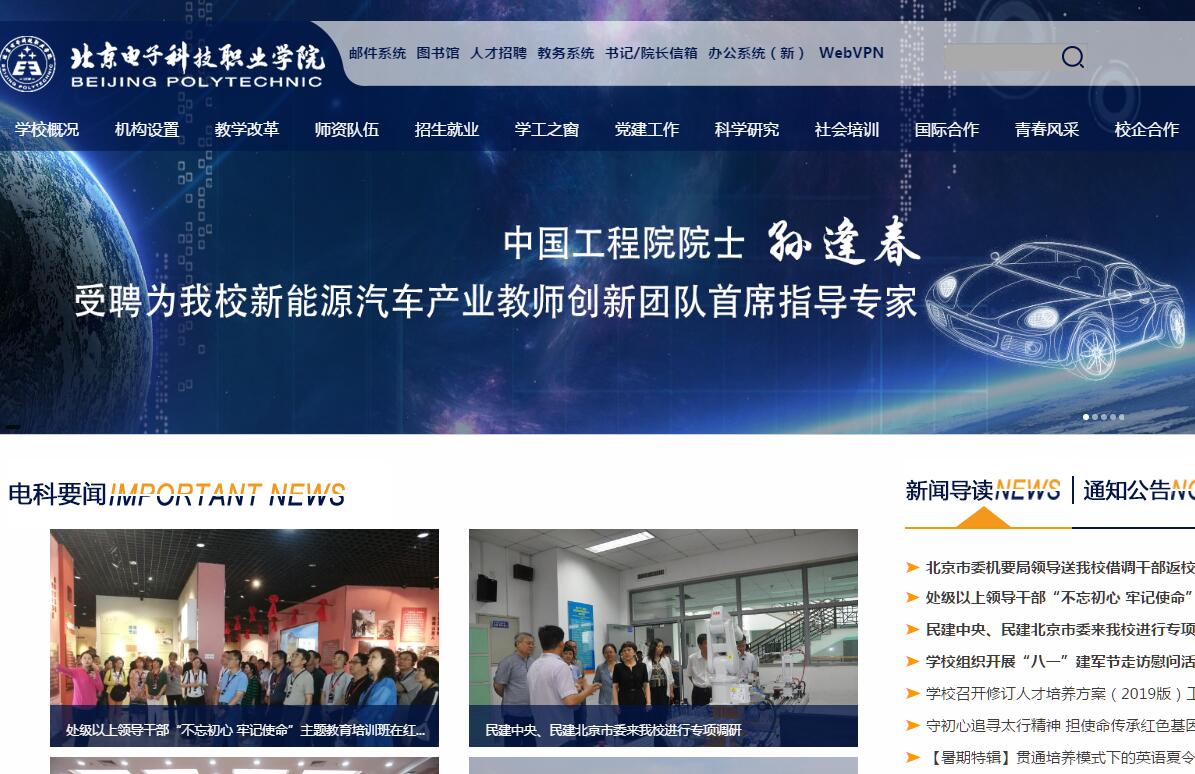 北京电子科技职业学院建校于1958年,是国家首批独立设置的高职学院,是全国百所高职示范校之一,是全国职业教育先进单位、国家高等职业教育综合改革试验区建设单位,是全国首批百所现代学徒制的试点院校之一。学校率先启动高端技术技能人才贯通培养改革试验,是首都职业教育排头兵。学校位于北京经济技术开发区凉水河畔,占地807亩,建筑面积32.6万平米,固定资产总值19.59亿,具备良好的办学条件、完善的基础设施,为学生营造了优越的学习生活环境。学校坚持以服务为宗旨、以就业为导向,围绕职业教育的发展与改革,确立了“立足开发区,面向首都经济,服务京津冀,走出环渤海,培养适应现代制造业和现代服务业需要的高技术技能人才”的办学定位。学校校训是“求实、创新、厚德、重艺”。学校坚持“人才培养高端化、校企合作品牌化、教育标准国际化”的“三化”战略,形成了独具特色的“产学协同”培养高素质技术技能人才的新模式、新方法,全面提升了人才培养质量和服务区域经济社会发展的能力。多年来坚持聚焦高新技术产业、现代制造业、现代服务业,开设有机械与电气类、汽车与交通类、艺术与设计类、电子与信息类、食品与生物类、经济与管理类六大类44个专业,实施全日制高等职业教育、贯通培养教育、成人本科学历教育等多层次教育,建校以来已累计为社会培养高素质技能人才10万余名。学校现有全日制在校生6860人,教职工927人,拥有国家级教学团队、北京市优秀教学团队、学术创新团队和专业创新团队8个;全国优秀教师5人,北京市优秀教师21人,北京高校学术创新人才、北京市教学名师、北京市职教名师16人,技能大师工作室3个。学校引进行业大师和企业技术骨干担任兼职教师,聘请多名外籍教师来校任教,每年派出多名教师出国培训进修。学校高度重视科技创新,努力实现科技为社会服务,近几年来教师以第一作者身份在核心期刊和三大检索上发表、收录论文728篇,正式出版著作、教材300部,获得发明和实用新型专利110项,软件著作权11项。学校主持或参与国家自然科学基金项目、国家科技计划项目和北京市自然科学基金项目以及省部级、市教委科研项目等共计76项,承担来自企业和社会的横向课题191项,为126家企业开发新型产品,攻克技术难关。人才培养方面,学校积极探索了“产学一体、实境再现、能力递进”的人才培养模式,在人才培养上突出“高端”和“创新”,构建了订单班、职业教育分级制、现代学徒制、火箭军士官生、3+2中高职衔接、胡格模式等多样化的人才培养模式,探索出工学结合的教学体系模型,系统设计课程体系,实施以工作过程为导向的理实一体化课程教学,提高人才培养质量。学校构建基于职业技术技能和能力目标的课程体系,从职业出发,系统设计“平台递进、模块并行、通识贯通、工作导向”的课程结构,以职业能力培养为主线,构建基于职业技术技能能力目标的课程体系,实现职业素养、理论知识、实践能力和创新能力的全程并重培养。整个课程体系呈现“1贯通、4迭代、1全程”的逻辑关系。“1贯通”是通识课程,贯通文化知识素养培养;“4迭代”是通用技术平台、专业技术平台、专业技术和专业方向课程,实现迭代递进的技术应用能力培养;“1全程”是专业实践与创新实践环节,全程蕴含综合素养、职业软技能和“一技之长”的培养。贯通培养方面,学校创新贯通培养,促进特色发展。作为首批高端技术技能人才贯通培养项目试点院校,学校与北京市第三十五中学、北京工业大学等五所本科院校以及国外应用技术大学联合实施七年制贯通培养,集示范高中、示范高职、国内外应用型大学的优质资源和特色,合作国内外优质品牌企业,深度改革教学标准、教学内容、教学方法和教学管理,促进职业教育与产业转型升级的融合对接,培养适应世界经济一体化新趋势和首都产业技术进步和城市管理现代化需要的高端技术技能人才,开辟了贯通人才培养的新路径。目前,高端技术技能人才贯通培养试验有内培、外培、高精尖创新人才培养、北京学院和中外国际学院五个项目类型。学校创新贯通培养项目工作机制,打造优质师资团队,突出职业教育特色,系统设计课程和培养目标,全面加强学生的思想政治教育,强化实践育人、文化育人,将职业文化和职业素养教育、工匠精神融入教育教学全过程,重视培养学生的动手实践与创新能力、健康体魄、健全人格、阳光心态和国际视野,着力提升学生的基础文化素养、身心健康素养和职业素养,努力为首都经济社会发展培养高端技术技能人才。校企合作方面,学校立足开发区,面向首都区域经济,创新体制机制,积极与行业企业合作,搭建了“政校行企”共享资源、共育人才、共谋发展、互惠共赢的合作机制平台。学校面向北京市高技术制造业和战略性新兴产业发展,牵头组建了北京现代制造业职业教育集团;与北京亦庄生物医药园等知名企业合作组建校企合作联合体十余个,实现学校、园区、企业三方联动互动,产学研一体融合发展。学校与企业实施订单培养。学校与北京奔驰、捷豹路虎、SMC(中国)、博世力士乐、西门子(中国)、招商局物流集团、大唐电信、北京地铁、京港地铁、北京邮政、北京菜篮子集团、中航工业赛维航电等多家现代化知名企业合