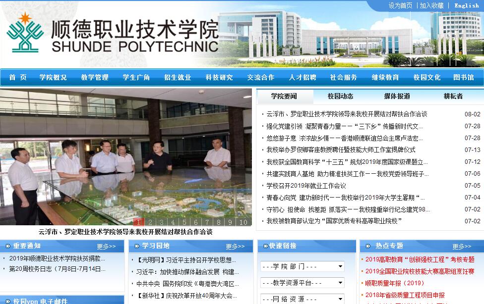 顺德职业技术学院成立于1999年3月,是经国家教育部批准成立、广东省人民政府领导管理、省市共建、顺德区政府投资兴建的地方高职院校。经过多年的建设发展,学校已成为国家示范(骨干)高等职业院校、广东省示范性高等职业院校、广东省一流高职院校建设单位。学校环境优美、设施良好、制度健全、管理科学,是莘莘学子求学成才的理想之地。先后获得“全国职业教育先进单位”、“全国绿化模范单位”、“全国节能型公共机构示范单位”、“广东省安全文明校园”、“广东省依法治校示范学校”等荣誉称号或奖励,为区域经济社会发展培养一大批高素质技术技能人才做出了积极贡献。学校的前身是1994年12月成立的顺德永强成人学院。2002年7月,顺德师范学校(1924年成立)和顺德成人卫生中等专业学校(1958年成立)合并到顺德职业技术学院。2002年,学校迁入位于德胜东路的新校园。2005年12月,学校以优秀成绩通过国家教育部高职高专人才培养工作水平评估。2008年7月,学校被教育部财政部确定为国家重点培育高等职业院校立项进行建设,并于2010年通过验收。2009年9月,学校被广东省教育厅财政厅确定为广东省示范性高等职业院校建设项目立项建设单位。2010年12月学校被教育部财政部确定为“国家示范性高等职业院校建设计划”骨干高职院校第一批立项建设单位,并于2013年11月以优秀成绩通过验收。2016年,学校被广东省教育厅确定为广东省一流高职院校建设单位。学校现设有10个二级学院(机电工程学院、电子与信息工程学院、应用化工技术学院、医药卫生学院、设计学院、经济管理学院、酒店与旅游管理学院、人文社科学院、外语学院、马克思主义学院)。学校共有专业49个,其中国家教育改革试点专业2个(制冷与空调技术、家具艺术设计)、中央财政支持重点专业2个(工业设计、烹饪工艺与营养)、广东省示范性专业8个(数控技术、汽车检测与维修技术、制冷与空调技术、电子信息工程技术、应用化工技术、家具艺术设计、会计、工商企业管理)、广东省重点专业3个(物流管理、酒店管理、应用英语)、广东省重点建设专业3个(园林技术、工业分析技术、机电一体化技术)、第一批省级一类品牌建设专业2个(制冷与空调技术、家具艺术设计)、第二批省级二类品牌建设专业5个(计算机应用技术、药学、金融管理、展示艺术设计、数字媒体艺术设计)。学校获国家高等教育教学成果奖4项,广东省高等教育教学成果奖23项。共建有国家级精品课程12门,国家精品资源共享课立项建设项目9门;省级精品课程22门,广东省高职教育精品开放课程5门,广东省高职教育精品在线开放课程4门,广东省精品视频公开课1门,广东省精品资源共享课19门。学校办学条件良好,教学环境优良。学校建筑面积超过57万平方米,固定资产总额超过12.36亿元人民币, 教学、科研仪器设备总值3.12亿元。拥有校内实训基地19个,实验实训室197个,其中中央财政支持实训基地1个,省级重点实训基地9个。学校有校外实训基地541个,其中省级大学生校外实践教学基地13个。学生文化体育设施齐全,建有高标准的田径场、篮球场等各类场馆。学校共有21个科研平台,4个技术服务平台。科研平台中以学校为第一申报的平台有16个,其中省部级6个,市厅级12个。获国家自然科研基金项目11项(含主持7项)、主持获得教育部人文社科项目9项、省自然科学基金项目12项,省哲学社会科学项目20项。横向项目累计到账经费达到了4475.32万元。省部级及以上的科研奖7项。获专利授权388件,其中发明专利授权85件,实用新型专利247件,累计有34项发明专利实现了转化。全校教职工总数924人,其中高级职称263人。现有专任教师730人。有国家级教学团队1个、省级教学团队6个,国家级教学名师2人、省级教学名师5人、广东省“特支计划”教学名师4人,南粤优秀教师6人,广东省“千百十工程”省级培养对象7人,广东省高等学校优秀青年教师培养计划培养对象6人,广东省高等职业教育专业领军人才培养对象5人。学校全日制在校生15703人,成人教育在读学员2915人。获国际奖项德国红点奖1项;国家级教学成果奖4项,省级教学成果奖23项;全国性职业技能竞赛一等奖120个、二等奖198个,位居全国全省前列。2016年,获评全国高职院校创新创业示范校50强。2017年高考招生,我校在顺德区以外录取的新生,高考成绩100%高于全省二本分数线,顺德区内考生分数线也接近全省二本分数线。学校每年毕业生供不应求,初次就业率连续多年高于98%。2014年,获评全国职业院校就业竞争力示范校。学校国际化发展坚持“引进来”与“走出去”相结合,与英国、美国、澳大利亚、德国、台湾、香港等国家和地区的40多所高校和机构保持了友好合作关系。与马来西亚UCSI大学合作共建的马来西亚UCSI大学顺峰烹饪学院,是中国高等教育在海外建立的第一个烹饪学院,开创了中国烹饪高等教育走向世界的先河。与世界酒店管理知名学府——香港理工大学酒店及旅游业管理学院合作,联合培养高水平酒店管理专业人才。2017年,国务院侨办批准在我校设立“海外惠侨工程—中餐繁荣基地”(国内仅有3家),这是对我校近年来餐饮教学及面向国内外的餐饮文化交流活动成效和影响的充分肯定,为我校烹饪专业教学及中国烹饪学院建设赢来了更大国际化发展空间和机遇。