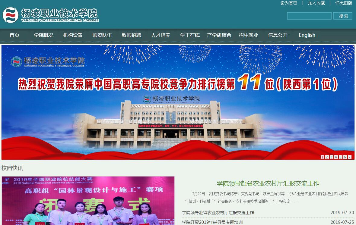 杨凌职业技术学院(英文:Yangling Vocational and Technical College,简称:杨凌职院)是一所省属全日制普通高等学校。1999年经国家教育部批准,由原国家级重点中专陕西省农业学校、陕西省水利学校和省部级重点中专陕西省林业学校合并组建,学院历史可以追溯到1934年于右任先生和杨虎城将军创建的国立西北农林专科学校附设高职。建校84年以来,共培养各类专业技术人才21万多名,为陕西乃至西北地区经济社会发展做出了重要贡献,先后荣获省级以上奖励60多项。在首届全国高职高专“优质校”建设与评价论坛会议发布的《中国大学及学科专业评价报告(2018)》中,位列全国1386所高职院校竞争力排行榜第11名,稳居全国高职教育第一梯队。学院地处素有八百里秦川美誉的关中平原,是我国农业硅谷、全国第一个国家级农业高新技术产业示范区——杨凌的主要驻区单位。东距西安60公里,西距宝鸡80公里,陇海铁路、西宝高铁和连霍高速公路、西宝中线贯通东西,交通便利。学院占地1630亩,校舍建筑面积49万平方米,固定资产8亿元,教学科研仪器设备值2.7亿元。校园网出口宽带5.2G,校园无线wifi全覆盖。拥有现代化、生产性校内实验实训中心、基地220个,校外实习基地171个,校外产学研示范基地11个。馆藏纸质图书114.86万册,其中电子期刊8621种。学院现有各类在校生2万余名,其中全日制在校生19269名。现有教职工908人,其中教授70名、副教授306名,具有“双师”素质专任教师490名,外聘兼职教师569名。有国家级教学团队1个,省级教学团队10个,国家和省级突出贡献专家、劳动模范9名,陕西省特支计划教学名师2人,国家级、省级教学名师17名,各类学会评选教学名师23名,国内外访问学者9名,省级师德标兵3人,师德先进个人4名,陕西省普通高校青年杰出人才1人,陕西省蜂业产业技术体系首席科学家1人,陕西省蜂业、梨、莓类、花卉等产业体系岗位专家4人。教师先后主、参编正式出版教材500多种,公开发表论文2600多篇,其中核心期刊1100多篇。获得国家和省部级教学及科研推广成果奖43项,地厅级科研成果奖28项,培育小麦、花椒等新品种8个,专利36项。学院科研、教研项目、经费、奖项及项目等多年来居全省高职院校首位。学院设有16个分院(部),8大类63个高职专业,3个本科联办专业。有中央财政支持建设的专业6个,国家骨干专业17个,省级“一流”建设专业19个,省级综合改革试点专业6个;中央财政支持建设的实训基地4个,省级示范性实训基地6个。主持国家专业教学资源库3个,参加国家级专业教学资源库13个,主持省级专业教学资源库3个,建成国家级精品资源共享课3门,省部级和行指委精品课程27门,院级精品资源课96门。获国家级、省级教学成果奖27项。设有全国大学英语、计算机等级考点。设有陕西省中职校长培训基地、陕西省中职骨干教师培训基地、陕西省阳光工程培训基地等7个基地,建有华北水电学院等5所本科院校函授站。创办有《杨凌职业技术学院学报》《高职教育研究》等刊物。学院坚持走“教学、科研、推广”三结合之路,依托“百县千企联姻工程”和“中国杨凌现代农业职业教育集团”两大平台,不断深化校企合作、产教融合。与省内外142个县(区)政府、1332家企业建立长期友好合作关系。建有163个校外实训基地,6个大学生协同创新中心,122个学生顶岗实习和社会实践基地,69个教师实践锻炼基地,60多个企业订单班、13种优秀学生奖学金;举办有“中国水电十五局水电学院”“陕建集团建筑见习学院”等10多个校企合作学院。在全省建立产学研基地13个,探索形成了技术服务型、基地示范性、科技包村型、专家大院型和企业带动型五种农业高职院校产学研示范推广模式,彬县基地被农业部确定为“农业科技创新与集成示范基地”。聚焦精准扶贫,在麟游县、太白县、旬邑县建立2个产学研一体化示范基地和1个网络电商平台,实施10余个特色产业扶贫项目,形成了职教扶贫高职范式。重视国际合作,与澳大利亚、德国等7个院校建立了友好合作关系;招收有俄罗斯、哈萨克斯坦、乌兹别克斯坦、吉尔吉斯斯坦等外国留学生;引进荷兰朗蒂斯教育集团现代农业技术课程资源;开展对“一带一路”沿线国家的农业实用技术培训和农业科技项目建设,在哈萨克斯坦设立现代农业技术培训中心;加入《悉尼协议》,开展国际专业认证研究与实践;与新西兰林肯大学、新西兰商学院开展“2+1+2”专升硕留学生培养计划。学生工作坚持“教育科学化,管理规范化,服务亲情化”的工作思路,创新实施“四位一体”人才培养方案,注重德技并修,以学分为导向,使学生德、智、体、美、劳全面发展落到实处。以“十大节庆主题教育”品牌为引领,把文化教育、德育教育、个性化教育、行为养成教育与学生的校园文化活动、日常学习生活紧密衔接,全面提升学生的综合素质和核心竞争力。近五年,学生参加各类职业技能大赛获得国赛奖项380多项次,毕业生就业率稳定在96%以上。形成了以大中城市为中心、覆盖全国、辐射国外的就业基地网络,建立了以中国水利水电集团、陕西建工集团、西北电力建设集团、中铁集团等国有大型企业为引领的60多个就业集团企业基地。学院获“全国普通高等学校毕业生就业工作先进集体”“陕西省示范性高等学校毕业生就业创业指导服务机构”等称号。“十三五”