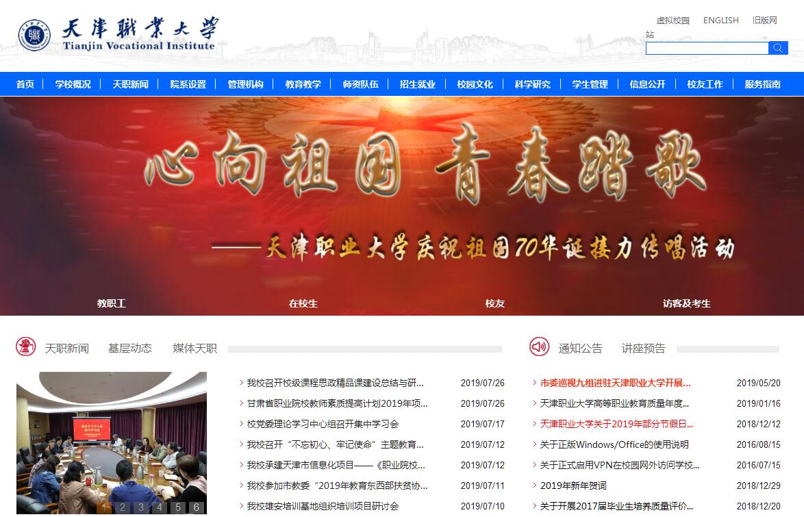 天津职业大学始建于1978年,前身为南开大学第二分校、天津大学化工分校,是全国最早举办职业教育的高等职业院校之一,也是天津市办学规模最大的一所综合性高职院校。学校为首批28所“国家示范性高等职业院校建设计划”立项建设单位,是全国重点建设职业教育师资培养培训基地、天津市滨海新区技能型紧缺人才培养基地。学校坚持“服务为本,应用为根,质量立身,卓尔不群”的办学理念,秉承“育德育能,力实力新”的校训,发扬“勤奋、求实、团结、创新”的校风,立足天津、面向全国,积极投身于国家现代职业教育改革创新示范区建设,努力办好国内领先、人民满意的高等职业教育。天津职业大学目前为“一校两区”办学格局,分主校区和海河园校区,建成建筑面积约44.54万平方米。现有教学科研仪器设备总值已达3.07亿元(生均 1.8万元)。图书馆藏书83.1万册,中外文期刊资料1300余种,中外文数据库79个,资源总量约26T。天津职业大学下设10个学院和3个教学部。积极探索职业教育体系建设,与天津科技大学、天津商业大学、天津职业技术师范大学联合开设6个本科专业,培养应用型、高端技能型人才。现有在校生1.7万人,其中专科生16000余人,应用型本科生900余人。自建校以来共培养毕业生110000余名,为天津乃至全国经济社会发展做出了重要的贡献。天津职业大学拥有一支“师德高尚、结构合理、素质优良、专兼结合”的“双师型”师资队伍。现有教职工956人(其中,专任教师579人,正高职称69人),拥有国家级优秀专业教学团队2个、天津市优秀专业教学团队1个,国家高层次人才特支计划教学名师、国家教学名师1人,天津市教学名师6人,享受国务院政府特殊津贴专家4人,国家级技能大师1人,国家级烹饪大师1人,全国优秀教师1人,全国技术能手6人,教育部高校示范马克思主义学院和优秀教学科研团队1个,全国高校思想政治理论课教师影响力提名人物1人,天津市技术能手12人,全国黄炎培杰出教师4人,全国师德标兵、天津市德业双馨十佳教师1人,天津市突出贡献技师1人。1名教师两破世界吉尼斯记录。天津职业大学坚持教学立校,教学建设成绩斐然。主持获得国家级教学成果一等奖2项、二等奖2项,天津市级教学成果一等奖10项、二等奖14项。由我校教师主编的40种教材入选“十二五”职业教育国家规划教材建设。学校入选教育部首批现代学徒制试点单位和全国职业院校养老服务类、装备制造类、旅游类示范专业单位,拥有中央财支持重点建设专业10个、央财支持实训建设项目4个、天津市财政支持重点建设专业25个,国家精品课程14门(其中国家级精品资源共享课13门)。眼视光技术、酒店管理、包装技术与设计等3个专业获批国家专业教学资源库建设立项。天津职业大学坚持科研强校,科研工作成果丰硕。“十二五”以来,建有全国职业院校增材制造技术应用中心、天津市包装生产线技术工程中心、天津市科技成果转化中心、学生科技创业服务平台等多个科技研发平台,拥有应用技术研究中心11个、协同创新中心4个,校企研发中心、校校基础研究基地若干个。教师获得各类纵向课题立项464项(其中省部级以上项目立项188项),横向课题立项164项(其中横向科研经费引进5000余万元)。学校自2009年起一直是天津市专利试点单位,专利授权1205项(其中发明专利授权45项),2017年专利授权数位居天津市所有高校第4名。教师在重要期刊发表论文861篇,人均发表核心期刊论文数位居全国高职院校前列。天津职业大学坚持服务兴校,主动服务国家重大发展战略。先后建设“雄安新区培训基地”、“西南培训中心”、 “应用技术研发中心(西南)”、“蓟州区新型职业农民培训基地”等,与政府、行业企业开展师资、职业技能培训和应用技术开发等多种合作;承担教育部任务定点帮扶云南红河、新疆和田职业院校,筹建天津职业大学威县分校等精准扶贫工作,在专业建设、人才培养、师资培训、科研开发等方面帮扶成效显著。为区域经济社会发展提供人才支撑和智力支持,“十二五”以来完成各类社会培训16.8万余人次,各级各类鉴定5.2万人次,承担天津市“职业培训包”项目97个培训包的开发任务。天津职业大学深化产教融合、校企合作,与天津空港经济区建立区校企理事会,政校行企多方联动在人才培养、技术创新、就业创业、社会服务、文化传承等多方面开展深度合作。联合天津市民政局、福老基金会等养老机构,创新老年服务与管理等专业试点现代学徒制人才培养模式;建设汽车专业教育集团等4个专业型职教集团,引企入校,林肯、百胜等世界五百强企业在校内建设技术培训中心,在校外建设实训基地,创新校企双主体育人模式;参与滨海新区职业技能公共实训中心建设,服务高端装备制造业。天津职业大学充分利用区域与自身优势,深化国际教育交流与合作。先后与美国、法国、英国、澳大利亚、新加坡、韩国、日本、俄罗斯等国家和香港、台湾地区有关院校建立友好校际关系,进行合作办学、师资培训和留学生教育。天津职业大学围绕立德树人根本任务,持续深化社会主义核心价值观教育,形成培养学生“学会学习、健康生活、人文底蕴、科学精神、责任担当”六大核心素养的学生素质教育体系。通过构建“四三”工作模式,培育“新职百工”,打造新时代又红又专、既专