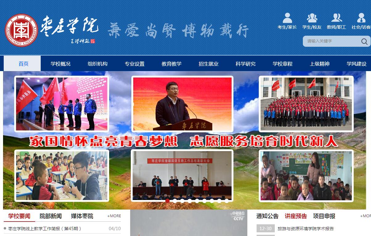 枣庄学院坐落在山东省枣庄市市中区,是山东省属全日制综合性普通本科院校。其前身为1971年建立的枣庄市教师进修学校,1984年经山东省人民政府批准成立枣庄师范专科学校,2004年5月经教育部批准改建为全日制普通本科院校,更名为枣庄学院。学校秉承“兼爱、尚贤、博物、戴行”校训,坚持以习近平新时代中国特色社会主义思想为指导,全面贯彻党的教育方针,坚持“办学以教师为本、教学以学生为本”的理念,围绕内涵发展、质量提升主线,明确应用型人才培养的定位,服务地方,特色发展,为区域经济社会发展提供人才、智力、科技支撑,全面提高教育教学质量和办学水平,社会声誉和综合实力稳步提升。学校目前占地1142亩,校舍面积41万平方米,规划建设的新城校区占地1885亩,规划建筑面积79万平方米。固定资产总值9.08亿元,实验教学中心18个,其中实验室分室316个,教学科研仪器设备总值1.7亿元。图书馆馆藏纸质文献144.2万册,电子图书197万种,电子期刊45213种。学校面向全国25个省(市、自治区)招生,全日制普通本专科在校生18000余人。学校现有教职工1166人,专任教师813人,教授67人、副教授252人,博士209人。学校双聘院士1人、“千人计划”特聘专家1人、国家“百千万人才工程”专家1人,山东省及枣庄市“有突出贡献中青年专家”23人,省级教学名师、省级重点学科首席专家等7人,外籍教师9人,专兼职博士生导师、硕士生导师30余人,山东省首批“高校黄大年式教师团队”1个。另有国家千人计划、泰山学者等特聘教授近百人。学校设有教学院(部)23个,普通本科专业57个,专科专业38个,形成了文学、理学、工学、管理学、教育学、历史学、经济学、法学、艺术学等学科协调发展的学科专业格局。其中省级特色专业8个、省级优秀教学团队3个、省级重点学科4个、省级精品课程23门,获批国家级本科专业综合改革试点专业1个,山东省高水平应用型重点建设专业(群)1个,培育专业(群)2个,自筹专业(群)1个。学校深入推进教育教学改革,在近几届教学成果奖评审中,获国家级和省级教学成果奖10余项,其中国家级二等奖1项、省级一等奖4项。学校积极推进向应用型大学转型发展,以产教融合、校企合作引领应用型人才培养模式改革,先后与中兴、惠普、曙光等国内外知名企业开展校企合作办学,先后成立了“中兴通讯学院”“曙光大数据学院”“智能制造学院”。教育部主推的六个产教融合促进计划项目“中兴通讯ICT产教融合创新基地”“数据中国百校工程”“凤凰教育高校数字媒体产教融合创新应用示范基地”“绿色中国双百计划”“中美产教融合+高水平应用型高校建设项目”“互联网+中国制造2025”“科学工作能力提升计划(百千万工程)”先后落户学校。产教融合、协同育人工作走在了全国高校的前列,受到教育部专家的充分肯定。学校连续3年获得“山东省企校合作培养人才先进单位”荣誉称号,连续两年获得“山东最具办学特色本科院校”称号。2015-2018年有1921人考取硕士研究生,总体考取率达到38.17%,其中578人考取中国科学院、985和211院校研究生,占考取人数的30.10%。2015年、2016年和2017年毕业生年终就业率分别为93.2%、93.4%、95.3%,就业率持续上升,毕业生质量受到用人单位的好评。学校注重科学研究对教学水平提升的促进作用,建有山东省院士工作站及各类省级以上教学、实验、科研平台15个。学校是山东省硕士学位授予立项建设单位,山东省首批研究生联合培养基地,与天津大学激光与光电子研究所联合培养博士研究生,与聊城大学等高校联合培养硕士研究生。近年来先后承担了国家重点研发计划项目、国家973科研项目、国家社科基金、国家自然科学基金、全国教育规划课题、国家出版基金资助项目、国家星火计划项目等国家级和省部级高层次科研课题共280余项,企事业委托的横向课题和专项课题130余项;发表学术论文5000余篇,其中SCI、EI、CSSCI收录600余篇;出版专著、教材170余部;获得国家专利成果110余项;获山东省社会科学优秀成果奖一等奖1项、二等奖1项、三等奖15项;获山东省高校优秀科研成果奖等地厅以上科研奖励220余项。学校坚持以服务谋支持、以贡献促发展,主动服务区域经济社会发展。建有11个校级或校企共建科研机构,出台了服务地方经济建设和社会发展行动计划,搭建了枣庄市信息化、工业化融合促进中心、太赫兹工程技术研究中心、石榴工程技术研究中心等服务地方科研机构和创新平台。学校启动了化学化工研发、机械制造研发等服务地方的重点项目,承担了太阳能电池及光伏电源系统生产线建设项目、枣庄市化工企业自动化控制及安全连锁改造工程项目,加入山东省煤化工产业技术创新战略联盟并成为理事单位,为校企合作育人、合作发展奠定了重要基础。学校不断扩大对外交流,推进国际交流与合作。与韩国、日本、英国、美国、加拿大、澳大利亚、新西兰等国家以及台湾地区的50所高校建立友好关系,开展了学分互认、学生交换等项目。特别是近年来,学校以世界语教学与研究为载体,与中华全国世界语协会联合建设了世界展陈面积最大、亚洲唯一的世界语博物馆,搭建了广泛的国际合作与交流平台,学校国际化水平和社会影响力进一步提升。学校先后荣获“山东省党建和思想政治工作先进高等学校”“山东省思想政治
