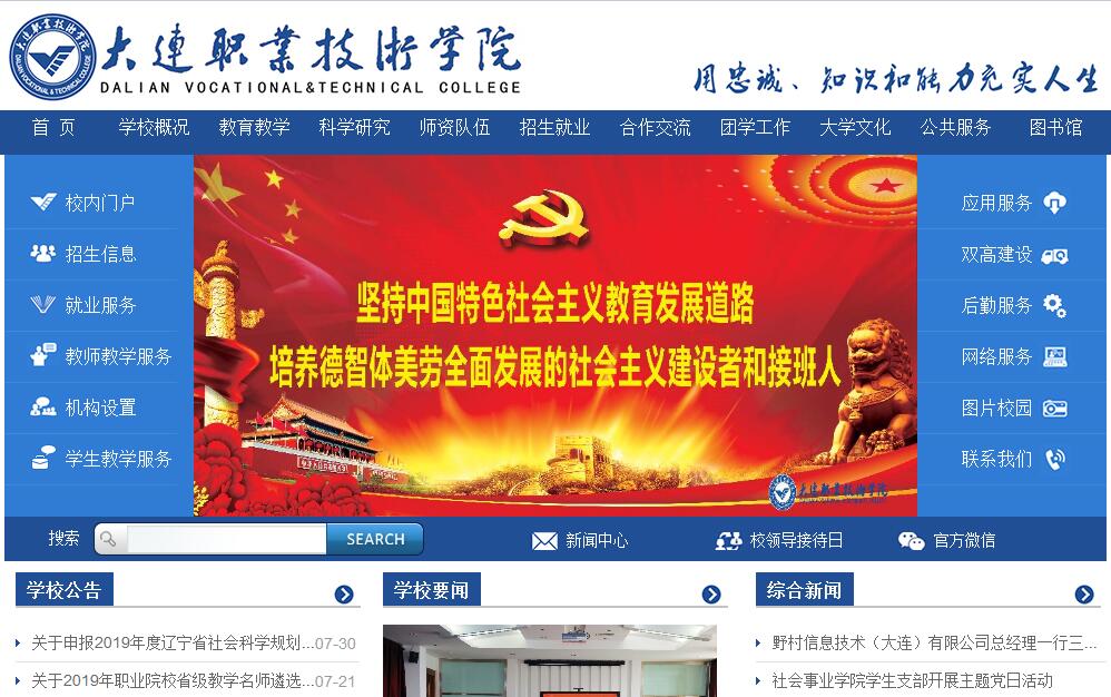 大连职业技术学院是大连市人民政府直属的全日制普通高等职业院校,其前身为大连管理干部学院(始建于1979年),1999年经教育部批准改制为大连职业技术学院,开始走上高等职业技术教育之路,2001年大连工业学校和大连师范学校并入学校。学校是全国百所“国家示范性高等职业院校”之一。2018 年,学校成功跻身辽宁省高水平现代化高职院校和高水平特色专业群立项建设单位。学校现有夏家河子、南关岭和普湾三个校区,总面积为930534平方米,其中夏家河子校区占地228136平方米,建筑面积144604平方米,南关岭校区占地104400平方米,建筑面积59204平方米,普湾校区597998平方米,建筑面积327659平方米。学校现有仪器设备总值2.8亿元,生均科研仪器1.4万元,固定资产总值5.9亿元。学校现有藏书总量85.6万册。学校实现有线网络和无线网络全覆盖,总出口带宽达到4.3G。学校设有机械工程学院、电气电子工程学院、汽车工程学院等12个学院和1个教学部,开设涵盖装备制造、电子信息、财经商贸、旅游、公共管理与服务等12个专业大类的65个专业(方向),现有在校生专业(方向)数55个,拥有以数控技术、应用电子技术、汽车检测与维修技术、物流管理、老年服务与管理专业、涉外旅游、商务日语专业为龙头的国家级示范专业7个,现有国家级教学改革试点专业1个、辽宁省品牌专业13个、大连市示范性专业2个,国家“高等职业学校提升专业服务产业发展能力项目”2个,“对接产业集群省级职业教育示范专业”6个,辽宁省高水平特色专业群立项建设项目4个。学校获得了国家海事局签发的船员教育培训资质。学校现有全日制学生10834人,教职工726人,其中正高级职称56人、副高级职称215人,一支“会教能做、专兼结合”的“双师型”教师队伍基本形成,来自企业、具有企业实际工作经验的专任教师超过教师总数的35%,成为实践课程教学的主要力量。学校现有省级“技能大师工作室”1个,省优秀专家1人,省级教学名师9名,省级专业带头人8名,省级优秀骨干教师12名,省级优秀教学团队10个。近五年,学校教师在全国职业院校信息化教学大赛中获一等奖2个,二等奖10个,三等奖6个。在辽宁省信息化教学大赛中获一等奖29个,二等奖43个,三等奖41个。学校建有集学生实训、技能鉴定、社会服务等功能于一体的现代装备制造技术、现代电子技术、现代汽车技术和现代服务业等17个理实一体实训中心、191个实训室(区),其中现代装备制造技术实训中心、老年养护实训中心、软件技术实训基地是中央财政支持的国家级“职业教育实训基地”。现有汽车检测与维修专业(群)创新型实训基地、动漫设计与制作专业(群)创新型实训基地、电气自动化技术创新型实训基地等三个“辽宁省职业教育创新型实训基地”建设项目。现有校外实训基地632个。学校始终坚持准确的发展定位和“以服务发展为宗旨、以促进就业为导向”的办学理念,坚持“质量立校、人才强校、文化兴校、特色亮校、依法治校”的发展战略,综合办学能力、社会服务能力和人才培养质量不断提高,已为地方经济社会发展输送了5万余名各类技术技能人才。学校坚持以专业建设为龙头,以课程建设为核心,紧密结合职业岗位标准系统开发课程体系和教学内容,全面实施素质教育,坚持教学过程与生产过程相对接,坚持系统培养和双证书教育,促进了学生综合素质与职业能力全面发展。学校不断深化教育教学改革,积极创新各具特色的人才培养模式。近几年,学校累计获得省级以上教学成果奖33项,承担省级以上教研教改课题25项。学校教师主编的27本教材入选“十二五”职业教育国家规划教材。学校始终将校企合作定位于战略高度。通过实施“一十百千”计划,校企合作模式不断向宽领域、深层次和高水平迈进。与英特尔、固特异、埃森哲、大商集团、上海通用汽车、大众变速器、奇瑞汽车、东风日产等国内外知名企业进行深度融合,合作企业逾千家,累计组建订单班200余个。与格劳博机床(大连)有限公司组建订单班,推广德国“双元制”人才培养模式,开展现代学徒制试点。学校牵头成立了大连装备制造职教集团和大连服务贸易(外包)校企联盟。学校以社会主义核心价值体系为引领,以“校园文化节”、“读书季”等系列校园文化活动精品为载体,兼顾融合企业文化,学生的思想道德修养、人文素养和综合职业能力全面提高,学校毕业生就业率连年稳定在90%以上,新生录取分数线持续名列省内同类院校前列。近五年,学生在全国职业技能大赛中获得一等奖5个,二等奖16个,三等奖15个,在辽宁省职业院校技能大赛中获得一等奖40个,二等奖64个,三等奖61个。学生在“挑战杯—彩虹人生”全国职业学校创新创效创业大赛荣获一等奖2个、三等奖4个。在“挑战杯—彩虹人生” 辽宁省职业学校创新创效创业大赛获得特等奖1个、一等奖5个、二等奖6个、三等奖7个。学校科研和社会服务能力不断提高。近五年来,承担省市级科研课题202项,校级立项科研课题194项,承担对外技术服务项目179项,获得专利授权241件,大连市社会科学进步奖3项,学校教师累计发表论文1284篇,其中核心期刊和检索收录类论文246篇,出版著作56部。 学校主动承担公益和社会责任,开展普惠制培训、职业技术类师资培训及成人教育,提供33个职业或工种的初、中、高级的技能鉴定和认证