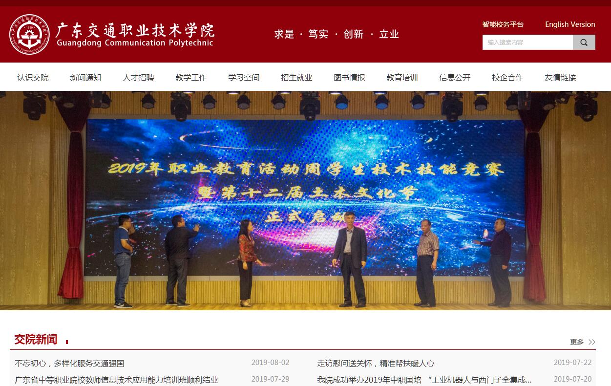 广东交通职业技术学院创办于1959年,1999年经教育部批准,由广东交通学校、广东省航运学校合并组建而成,是一所省教育厅主管、行业特色鲜明、工科为主的综合性高等职业院校,迄今已有60年办学历史。学院坚持立足交通、服务粤港澳经济与社会发展,注重培养具有创新精神的技术技能人才。学院荣获国家教学成果一等奖1项,二等奖2项;2004年,以“优秀”等级通过教育部高职高专人才培养水平评估;2013年,以“优秀”等级通过首批国家骨干高职院校建设项目验收; 2016年,获入选广东省一流高职院校建设计划立项建设单位、广东省大学生创新创业教育示范学校;2016-2018年,连续三年荣获“全国高等职业院校服务贡献50强院校”、2018年获全国高等职业院校“教学资源50强院校”;先后荣获全国职业教育先进单位、全国交通系统先进集体、广东省文明示范单位、广东交通教育科技先进单位、优质省级职教师资培养基地等光荣称号。学院扎根南粤大地,服务“一带一路”,目前有三个校区,占地面积1000余亩,学院全日制在校生14000余人,现有39个专业,涵盖土木工程、汽车机械、船舶驾驶、轨道交通、智能交通、运输管理、机电设备、电子信息、商贸等领域。拥有国家级教改试点专业2个、国家骨干高职院校重点建设专业6个、中央财政支持高等职业学校提升专业服务能力建设专业2个、全国职业院校示范专业2个、省级示范性高职院校重点建设专业9个、省级重点专业18个、省级示范性专业6个、省级高职教育一类品牌专业2个、二类品牌专业12个,国家精品课程2门、国家级精品资源共享课程1门、省级(国家教指委)精品课程17门、省级精品资源共享课17门、省级精品在线开放课程7门;拥有145个设备先进的一体化多功能校内实训教学场所,43个政校企共建校内实训基地和培训基地,532家紧密型校外顶岗实习基地,其中中央财政支持职业教育基地1个、省级公共实训中心2个,省级高等职业教育实训基地10个,省级大学生校外实践基地12个,为学生专业技能培养提供了良好的实训条件,毕业生获取中级以上技能证书或职业资格证书年均超99%;拥有一支高素质“双师结构”师资队伍,教授、副教授、高级工程师比例达33%,具有硕士、博士学历的专任教师比例约占62%,专任教师双师比例达85%。拥有广东省危化品运输车辆安全监控工程技术研究中心、广东省船舶自动化工程技术研究中心和广东省既有桥梁检测与维修加固工程技术研究中心,近三年,学院共承担各类教学、科学研究及技术服务项目500余项,先后有3个项目研究成果达到国内先进水平、3项成果达到国内领先水平、1项成果达到国际先进水平,,新增专利168项、计算机软件著作权83项,主编或参编专业标准、行业规范3部;学生参加技能竞赛获国家级奖项149项,省级奖项264项。优质的教育资源、教学质量以及交通行业的深厚渊源吸引了广大考生,成为众多考生首选报考的高职高专院校,毕业生就业前景广阔、就业通道顺畅,就业率连续多年保持在99%以上。学院始终面向区域经济与社会发展,积极拓展社会服务功能。设有交通运输行业职业技能鉴定站、省属职业技能鉴定所等9个鉴定机构,具有75项专业技能鉴定资格,可开展11个工种的培训鉴定;是交通运输部公路水运试验检测专业技术人员职业资格考试广东省考区承办单位;拥有中国企业联合会主办的“653工程教学基地”、城市轨道交通“双师型”教师培养培训基地、广东省职业教育师资培训基地、广东省专业技术人员继续教育基地等。近三年,学院面向行业和社会共培训和鉴定各类人员10万多人次,组织职业(执业)资格考试9万多人次。学院秉承“求是、笃实、创新、立业”的校训精神,坚持“内涵发展、质量立校,开放融合、服务兴校”的办学理念,主动服务“交通强国”和粤港澳大湾区建设新需求。全力推进体制机制改革创新,加快现代职业教育体系建设,解放思想、凝心聚力、锐意进取,努力把学校建设成为行业领先、国内一流、有一定国际影响的技术应用型高等职业院校。