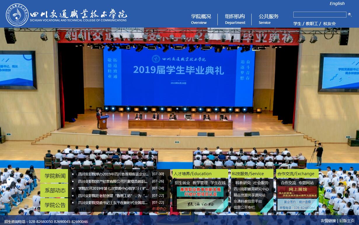 四川交通职业技术学院是公办全日制普通高等学校,隶属于四川省交通运输厅,始建于1952年。学院是国家示范性高等职业院校、四川省高端技术技能型本科试点院校、全国首批现代学徒制试点单位、全国职业院校就业竞争力示范校、全国职业教育先进单位、全国文明单位。学院占地1033亩,全日制在校生13000余人。设有道路与桥梁工程系、汽车工程系、运输工程系、航运工程系、信息工程系、建筑工程系、机电工程系、经济管理系、人文艺术系、轨道交通工程系、公共课教学部和思想政治理论课教学部12个教学系部。开设本科专业2个,专科专业35个,其中中央财政重点建设专业6个、国家级交通运输示范点专业2个、省财政重点专业10个。现有教职工806人,其中教授、教授级高级工程师、研究员30人,副教授、高级工程师、副研究员和博士研究生150余名,有省级教学团队4个,享受国务院特殊津贴专家1人,中组部“万人计划”教学名师1人,四川省优专家1人、全国模范教师1人,四川省学术和技术带头人1人,四川省学术和技术带头人后备人选2人,四川省教学名师3人,四川省五一劳动奖章获得者1名,交通运输部交通职业教育专业带头人5人、交通运输部职业教育教学名师2人。图书馆藏书120万册,教学仪器设备总值1.67亿元,固定资产5亿元。建有国家和省部级实训基地3个,生产性实训基地5个,校内实训面积近19万平方米,校外实训基地超过200个。学院设立的奖学金有:国家奖学金、国家励志奖学金、学院奖学金、社会及企业奖学金。家庭经济困难的学生可申请国家助学金和助学贷款。学院立足交通,面向市场,服务社会,已形成“引名企入校园,融专业入社会,育高素质人才”的办学特色,积聚了丰富的就业资源,形成了由国有、民营、外资企业构成的就业资源库,就业率始终保持在96%以上,学生以素质全面,专业扎实等特点受到社会各界及用人单位的普遍赞誉,用人单位对毕业生满意率达97%。2005年以来,连续被四川省教育厅评为“四川省普通高等院校毕业生就业工作先进单位”。四川交通职业技术学院以“敬德修业、拓道致通”为校训,发扬“爱岗敬业,严谨治学;循循善诱,诲人不倦”的教学理念,正努力建设“行业领先、全国一流、国际可比“、具有鲜明交通运输行业特色的优质高职院校。