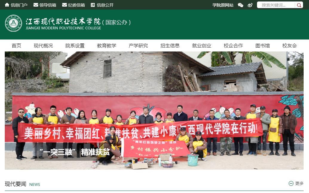 江西现代职业技术学院隶属江西省国资委,现有东西两个校区,建筑面积44.2万平方米。下设信息工程、商务、机械、建筑工程、设计、环境与能源(材料)、旅游与航空七个二级分院和一个中专部,有从中专到本科各级各类在校生18000余人。专任教师近千人,其中副高以上职称教师174人,并涌现出了全国、全省“五一劳动奖章”获得者、全国优秀教师、全省劳动模范等先进典型。近年来,学院弘扬“精诚团结、学用结合、善谋实干、知难而进、创新发展”的“现代精神”,坚持解放思想,实干创新,强化内涵,特色发展,学院进入健康快速发展轨道。2010年被教育部、财政部确定为国家骨干高职院校立项建设单位,2013年以“优秀”等级通过教育部、财政部组织的专家验收。学院建有150个校内实训基地,各类实训室两百余个,教学仪器设备总值1.5亿元。在省内高校率先建成宿舍空调和空气源热水系统,并建设了覆盖校园各重点部位的“天网”监控系统;建成教学、学工、图书、办公四大信息化平台,校园基本实现“数字化”和“一卡通”。学院有央财重点支持专业5个,省级特色和省级示范专业16个,省级人才培养模式创新实验区4个;建成国家精品(共享)课程2门、省级精品课程51门;获省级教学成果奖4项。院毕业生双证书率、年底就业率均在90%以上,先后被评为全国农村青年转移就业先进单位、全国普通高校毕业生就业工作先进集体(全省十年来唯一获此荣誉的高职院校)。学院坚持学历教育与职业培训相结合,积极推进人才培养模式改革,与72家企事业单位联合,成立了校企合作理事会;立足建材行业特色,面向先进制造业,与中国建材、中锐华汽、中兴通讯等250余家国内大型企业建立了长期稳定的校企合作关系。五年来,学院为企业、学校、社会开展各类培训5万余人次,完成技能鉴定4万余人次,学院职业技能鉴定站被评为国家首批示范职业技能鉴定站。2011年1月,以江西现代职业技术学院为龙头,联合24家企事业单位和2个工业园区,组建了“江西现代职业教育集团”,并落实了法人地位。面向未来,学院将坚持举“国资旗”,走“国资路”,进一步突出行业办学特色建设,注重调动政、行、企、民、校多主体协同作用,完善“合作办学、合作育人、合作就业、合作发展”的紧密型办学机制;深化教学方法改革,重点加强实践教学,发挥创新创业培训以及技能竞赛在人才培养中的作用,逐步建立能力和素质并重的综合评价体系;充分发挥江西现代职业教育集团合作平台功能,彰显“人才培养、科技服务、师资锻炼、岗位实践、就业创业”的五位一体集团化办学特色,争创集团化办学品牌。