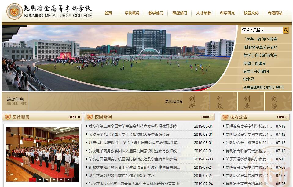 昆明冶金高等专科学校是一所历史悠久、特色鲜明,以工为主,工、管、文、商、艺并举的全日制公办普通高校,是国家示范性高等职业院校、云南省高水平高职院校建设项目院校、云南省优质高职院校建设单位。学校始建于1952年,长期积淀形成优良的工科办学传统和浓郁的工程文化氛围,工程应用特色鲜明,形成了丰富的优质工科办学资源,与行业企业和区域经济社会发展的结合度较高,为社会培养了10万余名毕业生,取得了显著的办学成效。办学条件优。学校占地1244.43亩,现有莲华、安宁两个校区。设有16个二级学院,现有全日制大专生19000余名,教职工近千名,拥有国家级和省级教学团队、国家“万人计划”教学名师、云岭学者、云岭教学名师、省级教学名师等一批优秀教师。教学仪器设备先进,图书资源充足,教学资源丰富,每个专业均建成体系化的校内外实训基地。拥有13个省级示范实训基地,实习实训条件处于国内同类院校的领先水平,为培养学生实践动手能力提供保障。内涵建设强。学校持续推进教育教学改革,近年来获省级以上质量工程建设项目160余项,国家级教学成果一等奖1项,二等奖3项,省级教学成果特等奖1项、一等奖5项、二等奖4项。现有国家重点支持建设示范专业6个,国家提升专业服务产业能力建设专业2个,省级重点、特色专业13个;国家级精品课程4门,全国教指委精品课程10门,省级精品课程21门。近年来,学校不断扩大国际合作交流,与德国、加拿大、澳大利亚以及东南亚等国的院校和企业开展多种形式的合作办学。学校不断深化产教融合、加强校企合作,引入企业资源、设备、技术和人员开展合作办学,校企合作覆盖学校所有专业。学校坚持以生为本,大力推进技能文化育人,将技能文化作为校园文化的重要组成部分,将每年4月确定为“技能文化月”,营造尊重技能、学习技能、苦练技能、热爱专业的浓厚氛围,大力提升学生综合素质,在全国、全省技能大赛中,学生个人、团体获奖均处于同类院校领先水平。连续两年承办并参加全国职业院校技能大赛测绘赛项、工程测量赛项获得一等奖,荣获教育部“2017年全国职业院校技能大赛突出贡献奖”表彰。招生就业好。学校得到广大考生和家长的广泛认可和信任,省内普高录取分数线居云南省高职高专院校前列;学校积极拓展国有大中型企业批量就业,促进小微企业稳定就业,确保本土化就业增量,积极推进国外省外就业。毕业生就业率始终保持在同类院校领先水平,先后荣获教育部“全国高校毕业生就业工作先进单位”,全国毕业生就业典型经验50强高校、云南省就业典型经验10强高校等表彰奖励,连续十三年获得云南省高校就业工作一等奖。社会声誉高。学校积极服务社会、服务企业,不断深化产教融合,着力提升支持产业发展的服务能力,深化人才培养模式改革,加强校企合作,加强校风教风学风建设,提高高素质技术技能人才培养质量。学校被评为全国职业教育先进单位、全国精神文明建设先进单位、国家技能人才培育工作突出贡献奖单位、云南省首批深化创新创业教育改革示范高校,云南省校风、教风、学风示范学校等,赢得了“冶金矿业高技能人才的摇篮”“云南高职教育排头兵”等社会赞誉,社会给予毕业生“做人诚、做事实、有闯劲”的良好评价。在历年的全国高职院校综合排名、学科竞赛排名、办学满意度测评中,学校连续保持云南省高职院校第一名,跻身全国领先行列。根据《2018中国高等职业教育质量年度报告》,学校荣获2017年高等职业院校教学资源50强、高职院校国际影响力50强。办学定位明。奋进新时代,筑梦新征程。学校将认真贯彻落实党的十九大精神,进一步融入和服务国家及云南省发展战略,继续以“提高办学水平,提升办学层次”的“双提工程”奋斗目标为引领,积极推进高水平高等职业院校和高水平专业建设,大力推进提质创优争一流,努力建成高水平高职院校和优质高职院校,推动学校发展新跨越,书写好新时代学校发展“奋进之笔”的新篇章,为经济社会发展作出新的更大贡献!