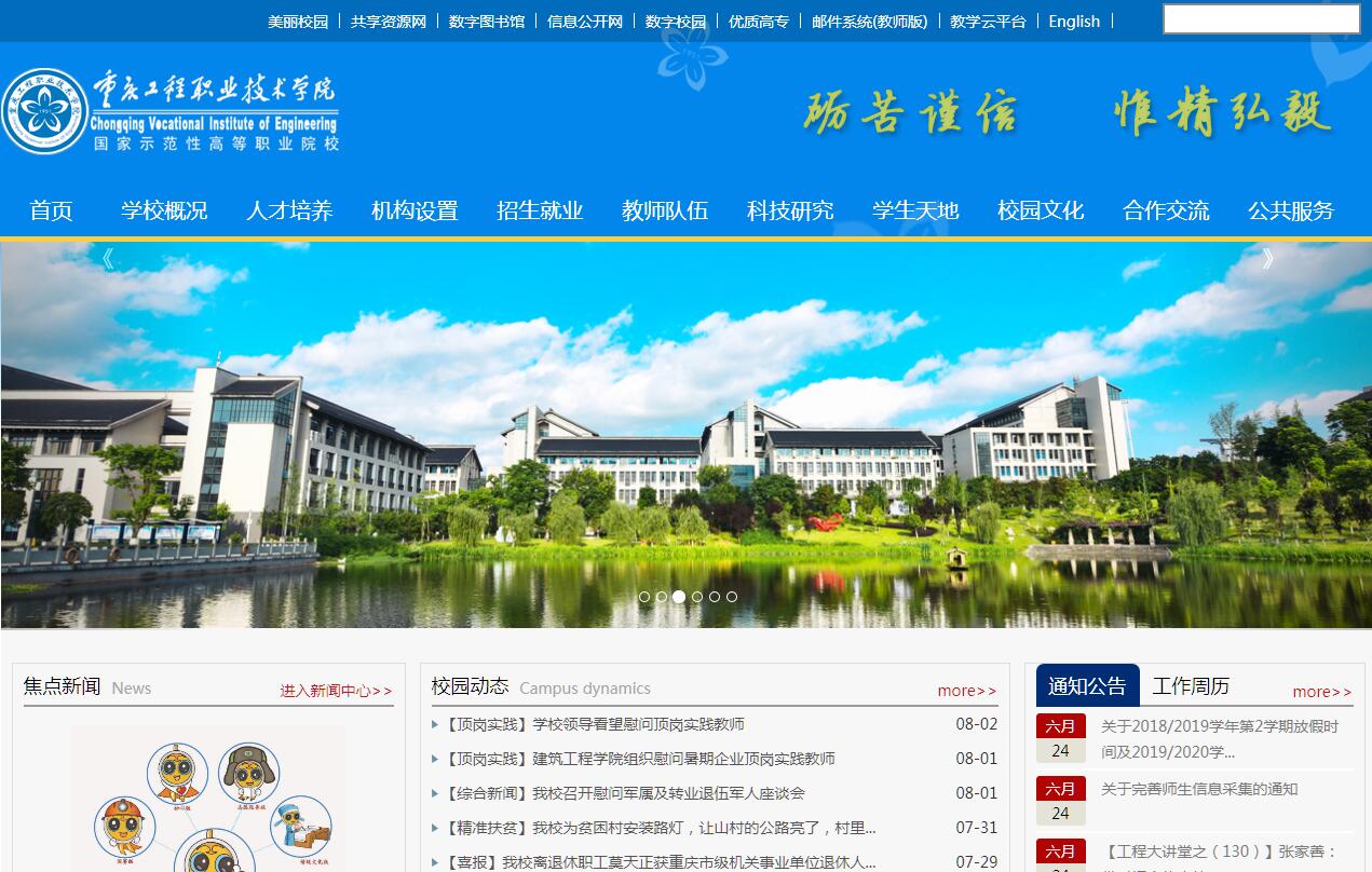 重庆工程职业技术学院是一所由重庆市人民政府举办,重庆市教育委员会主管的全日制普通高等职业学校。学校始建于1951年,1998年起举办高等职业教育,2001年升格为高等职业院校,2010年建成国家示范性高等职业院校。学校坚持“以学生为主体、以素质为核心,以质量求发展、以特色创品牌”的办学理念,秉承“砺苦谨信·惟精弘毅”的校训,坚守“和谐敬业·求真务实”的校风、“德正学高·兼容并包”的教风、“立身笃行·见贤思齐”的学风,立足“以智能装备制造业和信息技术产业为主体,以建筑业和服务业为两翼,坚持服务煤炭和地测行业的专业体系”的发展定位,致力于培养“开拓、务实、奋斗、奉献”的复合式创新型高素质技术技能型人才。学校设有矿业与环境工程学院、机械工程学院、地质与测绘工程学院、建筑工程学院、信息工程学院、财经与贸易学院、电气工程学院、艺术与设计学院、继续教育学院9个二级教学院和马克思主义学院、基础教学部、体育与国防教学部3个教学部,建有国家级重点专业8个、国家级精品资源共享课3门,国家级教学成果奖1项。有各类校内实训基地(室)200个(中央财政重点支持建设的专业实训基地8个、实训室21个),生产性实训基地8个,有稳定的校外实习基地261个。图书馆藏纸质图书91万余册,电子图书36.9万余册,电子专业期刊近2万种。建成共享型专业教学资源库云综合平台,各种视频、课件、虚拟实训容量达10T,用户达1.1万人。学校地处被誉为“帅乡”之称的重庆江津区,校园占地面积1300余亩,校舍建筑面积36.62万平方米,现有全日制在校学生14200余人,成人及其他高等教育学生4000余人,外国留学生60余人。随着高铁江津北站和轻轨5号线滨江新城北站的开通,学校的交通条件将更加便捷通畅。学校现有教职工700余人,其中教授(含教授级高级工程师)75人(博士生导师1名,硕士生导师6名),副教授(含高级工程师、高级会计师等)187人;博士45人;“双师双能”型教师410余人;有380余名行业企业技术专家、能工巧匠组成的兼职教师队伍。学校有国家级教学团队1个,国家级专家16人,重庆市市级教学团队7个,重庆市市级专家65人。学校聘请了中国工程院院士刘人怀教授担任学校名誉校长、中国科学院院士宋振骐教授、中国工程院院士宁津生教授等16名著名专家学者担任客座教授。学校坚持贯彻党的教育方针,坚持立德树人、强化思想引领,注重培养学生职业精神、职业技能和创新创业能力,促进学生全面可持续发展。开设有覆盖智能装备制造业、信息技术产业、建筑业和服务业等产业的9个专业大类49个高职专业,与重庆师范大学、重庆科技学院联合举办5个本科专业。学院所有专业与重庆6+1支柱产业、战略新兴产业和江津五大产业集群高度对接。毕业生就业率、就业质量保持高水平,2018届毕业生初次就业率98.54%,比重庆市高职院校初次就业率平均值高出4.9个百分点。学校坚持走产教融合、校企合作之路,依托地方优势产业,提升服务区域经济发展的能力。学校被重庆市教委确定为整体向产教融合型深化的高校;积极推进“政行企校”五方共建平台和各类校地、校企合作平台建设,与市内外300余家单位建立了稳定合作关系;组建了重庆测绘地理信息职业教育集团,开展集团化办学;率先与中兴通讯公司、新大陆集团联合开展混合所有制办学。学校以特色优势、优质资源服务行业企业技术进步和转型升级。建有重庆市高职院校首个院士工作站——“刘人怀院士工作站”;建有省部级工程研究(技术)中心、煤矿安全培训中心、矿业工程应用技术推广中心、现代教育应用技术推广中心、重庆市煤矿安全设备工程技术研究中心和国家职业技能鉴定所。博士、教授企业工作站30余个。学校是国家建设行业紧缺人才培养基地、国家矿业人才培养基地、重庆市信息技术软件人才培养实训基地和重庆市高技能人才培养基地。年均科研和技术服务项目金额超过1500万元,年培训达到2万余人次。学校发起成立了中泰职教联盟,是中泰职教联盟理事长单位,与泰国、马来西亚、老挝、乌兹别克斯坦、白俄罗斯等近20个“一带一路”沿线国家国开展海外留学生培养和技术服务,现有全日制留学生60余人。经国家教育部备案,与澳大利亚堪培门技术与继续教育学院合作举办中澳高等教育专科项目涉外会计专业(中澳班)。与美国、英国、澳大利亚、韩国等国家高校建立了长期校际交流机制,在专业合作、课程认证、职业资格认证、教师培养、学生交流、学历提升等方面开展国际交流与合作。学校是国家示范性高职院校,获得全国教育系统、能源系统“职业教育先进单位”“教育部首批教育信息化建设‘优秀’试点单位”全国煤炭教育“突出贡献奖”“全国高职院校服务贡献50强”“2016全国高职院校创新创业50强”等荣誉称号。获得“重庆市职业教育工作先进单位”“重庆市教育信息化先进单位”“重庆市文明单位”“新中国成立60周年重庆教育功勋特色高职院校”“重庆市大学生就业示范基地”“重庆市大学生创业示范基地”等荣誉称号。建校以来,为国家培养了10万余名专业人才,多数毕业生已成为企事业单位技术和管理骨干,在重庆、四川、云南、贵州的大型煤炭企业中层以上技术和管理干部中,我校毕业生占70%以上,被誉为西南地区煤炭行业的