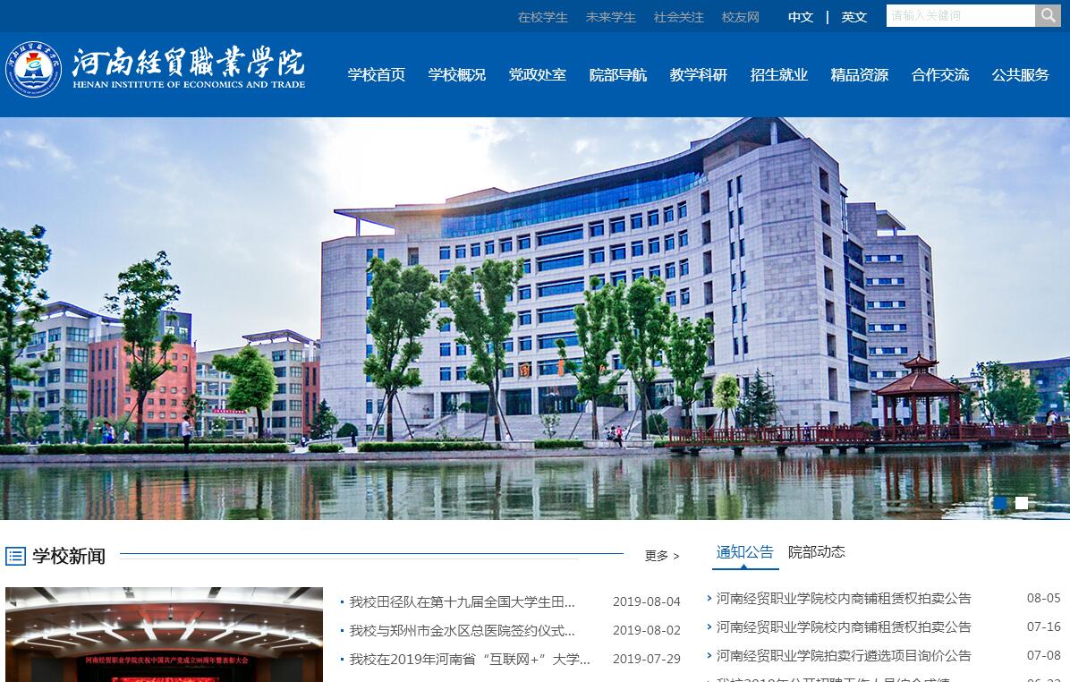河南经贸职业学院是由河南省政府批准、国家教育部备案、直属于河南省教育厅的一所高等职业院校,坐落在风景秀丽、文化底蕴丰厚的中原历史名城、河南省省会——郑州市郑东新区龙子湖高校园区。学校占地843亩,建筑面积45万平方米。现设有财税金融学院、会计学院、商务学院、工商管理学院、外语旅游学院、电子信息学院、计算机工程学院、工程经济学院、艺术设计学院、国际(继续)教育学院等10个二级学院和社科、体育2个教学部。另设有河南省示范性软件职业技术学院1个,中外合作办学项目4个,与华北水利水电大学联合举办应用型本科专业3个,在校生23000多人。学校以商科类专业为主,实行经、管、工、文、艺多科类协调发展,培养.动手能力强、具有良好职业道德的高素质技能型人,开设有财经商贸大类、电子信息大类、文化艺术大类、交通运输大类、土木建筑与水利大类、旅游大类、教育与体育大类、公共管理与服务大类、新闻传播大类等共54个专业(专业目录),其中,环境艺术设计专业(软装陶艺)为全国职业教育民族文化传承与创新示范专业,计算机应用专业、艺术设计专业为中央财政支持的实训基地;会计电算化、计算机应用技术、装潢艺术设计、电子商务、应用电子技术、国际经贸与贸易、投资与理财7个河南省专业综合改革试点专业;会计电算化、计算机应用技术、电子商务、装潢艺术设计、物流管理、财务管理6个专业为河南省特色专业建设点;电子应用技术实训基地、物流管理实训基地为省级示范性实训基地;电子商务专业为河南省中职师资培训基地;《管理学原理》、《实用英语》、《图形图像应用技术》、《思想道德修养与法律基础》、《会计综合实训》、《实用酒店英语》等6门课程为河南省精品资源共享课程;国际贸易教学团队、会计电算化教学团队、电子商务教学团队、计算应用教学团队、商务英语教学团队等5个教学团队为省级教学团队。学校坚持“质量优先、内涵发展”的战略,按照“依托重点、办出特色、突出优势、打造名牌”的建设要求,努力打造服务河南区域经济发展的财经商贸专业群、航空经济专业群等,围绕河南省高等院校教学质量工程建设项目,突出专业内涵建设,始终走在全省高职院校前列。学校办学条件优越,拥有功能齐全的综合教学楼、多媒体楼、实验楼、图书馆、学术报告厅、阶梯教室等;建有计算机校园网、多媒体教学网、电子阅览室和计算机中心等现代化设施等;建有财务会计实训中心、财税金融实训中心、现代商务实训中心、物流管理实训中心、电工电子技术实训中心、计算机应用技术实训中心、艺术设计实训中心、航空实训中心、旅游实训中心、新闻与文秘实训中心、工程造价实训中心、数字语音实训中心、学生创业创新综合实训中心等13个全真虚拟实训中心;功能完备、设计先进的图书馆,现有藏书114.9万册,开通中国期刊全文数据库、维普中文科技期刊镜像站、中国专利数据库等多个电子资源站点,为广大师生提供了良好的学习环境。学校以就业为导向,以改革为动力,强化技能培养,突出职教特色,先后推行了“竞争上岗、动态聘任、末位淘汰、以绩计酬”、“百分制考核”等人事分配制度改革,在全省教育系统首家引入了ISO国际质量管理体系。学校按照“校企合作、工学结合”的人才培养模式,注重学校对接地方产业、专业对接行业企业、教师对接职业岗位,通过“订单培养”、“分层次教学”、“三级技能竞赛”和“双证书培养”等为企业事业单位输送了大量“用得上、留的住”高端技能型人才,通过“学历提升工程”、“双师素质工程”、“职称晋升工程”构建了一支理论水平高、实践能力强的优秀教学团队,通过建立“学生评教”、“教师评学”、“第三方评教”等独具特色的教学质量监控体系,保证了人才培养质量稳步提升。学校特别注重加强学生就业安置工作,专门成立有就业指导办公室,通过开设就业指导课、举办就业讲座、开展“订单教育”等切实可行的措施,为学生就业出谋划策,搭桥铺路,学校毕业生就业率高达98%以上。近年来,学校先后被评为全国职业教育先进集体、全国模范职工之家、全国商业培训先进单位、河南省示范学校、河南省文明单位标兵、省五一劳动奖状、河南省最具影响力的十佳职业学校等荣誉称号百余项。学校先后被批准为国家优质高等职业院校建设单位、国家级语言文字规范化示范校、河南省首批示范性高职院校、河南首批品牌化示范院校、河南省示范性数字化校园单位、河南省示范性软件职业技术学院试点单位和河南省大学生创业教育示范校。全国政协副主席王文元、省人大.、省政协、省教育厅领导等先后多次到校视察,对学校的办学理念、规范管理给予高度评价。《新华社内参》、《中国教育报》、《光明日报》、《河南日报》、《河南电视台》、《郑州日报》、《郑州电视台》、《郑州教育台》、《河南商报》、《大河报》、《河南教育》等新闻媒体对学院事迹多次给予报道。