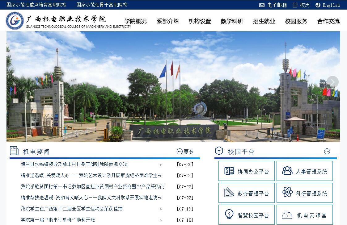 广西机电职业技术学院始建于1958年,坐落在“中国绿城”广西首府南宁市美丽的相思湖畔、邕江之滨,是经教育部批准成立的一所公办全日制普通高等职业院校,隶属广西壮族自治区工业和信息化委员会,是全国首批、广西首家国家示范性骨干高职院校,全国高职高专院校人才培养工作水平评估优秀学院,国家示范性高职建设重点培育8所院校之一,金砖国家工商理事会中方技能发展工作小组成员单位(全国唯一一所高职院校)。学院占地776亩,校舍面积32万平方米,固定资产3.8亿元。现有全日制在校生1.3万多人,是广西第一所全日制在校生超过万人的高职院校。毕业生初次就业率连续15年保持在90%以上,毕业生就业质量逐年提高,用人单位对毕业生综合评价的满意度达到98%以上,位居广西高职院校首位。学院现有专兼职教师698人,双师素质教师比例达到91.5%,其中教授、副教授、高级工程师等高级职称教师达教师总数的33.6%;具有研究生学历的教师达教师总数的56.5%。其中有广西五一劳动奖章获得者3人,自治区教学名师3人,广西技能大奖获得者5人,广西技术能手13人,广西五四青年奖章获得者1人,广西“高校优秀人才资助计划”入选5人,广西创新人才培养教学团队3个,自治区级优秀教学团队6个。学院还汇集知名企业中的国家技术能手和广西技术能手,在校内组建了4 个技能大师工作室,拥有了一支“专业带头人+骨干教师+兼职型能工巧匠”的结构合理的专兼职教学科研团队。学院紧扣广西及北部湾经济发展和产业布局,动态调整和优化学科专业体系,积极打造具有竞争力的特色优势专业。学院现设有10个教学部门,50个高职专业,其中,国家级教改试点专业2个,中央财政支持重点建设专业2个,全国职业院校装备制造类示范专业2个,全国职业院校交通运输类示范专业1个,国家示范性高职骨干重点建设专业及专业群6个,全国机械行业技能人才培养特色专业3个,广西教改试点专业4个,广西优质专业14个,广西特色专业9个,服务北部湾经济区开放开发专业21个,服务做大做强做优广西工业专业23个,服务社会主义新农村专业8个,自治区示范特色专业5个。学院拥有国家精品课程1门、教育部教学指导委员会精品课程1门、自治区精品课程14门、自治区级教学成果奖12项。目前,学院教学仪器设备总值达1.3亿元,拥有22个在同类院校中装备最优、规模最大、功能最全的校内实训中心、158个实训实验室和21个职业技能培训鉴定中心,是国家高技能人才(机电项目)培训基地、国家技能型紧缺人才培训基地、中国模具人才培训基地、中央职业教育数控技术实训基地、IT职业技术教育工程定点院校、广西中职师资培训基地等国家级和省级职业培训基地。已在广西玉柴机器、上汽通用五菱、广西华银铝业等区内外近500家企业建成校外实训基地,并在柳州、玉林、桂林、北海等广西产业集群优势区域设立了校企合作工作站。2005年,学院在全国同类高校中率先同时通过GB/T19000质量管理标准和GB/T28001职业健康安全管理标准认证,按该标准建立健全了一套完整的教育质量监控保障管理体系,加强了教育质量和安全稳定工作的过程控制,实现了教育教学质量的稳步持续提高,管理成效明显。学院始终坚持“以人为本,规范管理,办好人民满意的高等职业教育”的办学质量方针,以学生需求为根本,深化教育教学改革,全面提升学生综合素质和就业竞争力。学院学生在国际、国内、区内各级各类职业技能比赛中屡获大奖,在广西同类高职院校中处于领先地位。学院以服务社会为己任,充分发挥国家示范性骨干高职院校的示范引领作用,带动广西乃至西部地区职业教育的发展,并辐射至东盟地区。面向社会以及东盟国家有针对性地开设各种职业资格培训、鉴定及各种短期培训;为企事业单位提供直接技术服务;与东盟国家30多所院校建立合作交流关系;与国内10余所职业院校结成了对口支援关系。学院先后被评为首批广西高端应用型本科人才联合培养改革试点单位、广西首批示范性高职院校、自治区文明单位、自治区和谐学校、广西职业教育先进单位、广西高技能人才培养培训突出贡献奖、广西高校就业工作先进单位、全区普通高校毕业生就业创业工作“突出单位”,广西高校安全文明校园、全国机械行业文明单位、全国绿化模范单位、教育部高校校园文化建设成果优秀奖。九万里鲲鹏正举,北部湾风生水起。站在新的历史起点,全院师生员工将继续秉承 “自强弘毅 知行合一”的校训,以一流的教育服务,一流的人才培养模式和一流的师资力量,培养一流的应用型高级技术人才高技能人才,将学院建成地方技能型高水平大学。