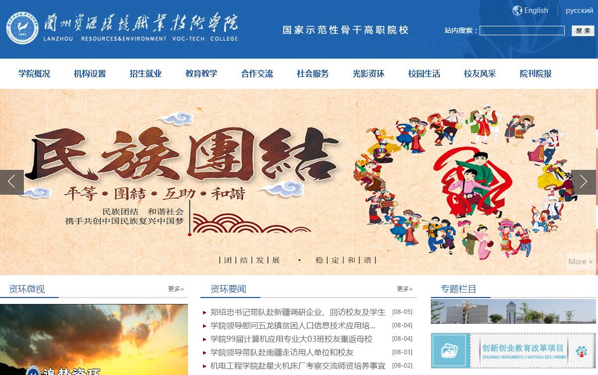 兰州资源环境职业技术学院于2004年经教育部备案、甘肃省政府批准成立,其前身是隶属于中国气象局的原国家重点中专兰州气象学校(始建于1951年)和隶属于甘肃省煤炭工业局的甘肃煤炭职工大学(始建于1984年)。学院是一所以气象、采矿、安全、地质、冶金、水利、测绘、信息、珠宝等专业群为主要特色的高等职业院校。建校以来,资环人艰苦奋斗,开拓进取,不断深化创新教育教学理念、办学体制机制和人才培养模式,发展质量和效益创造了甘肃高职教育的“资环模式”,学院的办学历程成为甘肃高职教育敢为人先和艰苦创业的“一面旗帜”。2011年,被教育部、财政部确定为国家骨干高职院校;2012年,被解放军总参谋部、教育部确定为全国首批11所定向培养士官试点院校,被教育部确定为教育信息化试点单位;2014年,荣获第四届黄炎培职业教育奖;2015年,被教育部确定为全国首批现代学徒制试点单位;2016年,被甘肃省政府确定为“双一流”大学项目建设院校,被教育部认定为“国防教育特色学校”;2017年,被甘肃省人民政府、国家应急管理部(原国家安全生产监督管理总局)确定为省部共建院校,被省教育厅确定为甘肃省优质高职院校项目建设单位。2018年,被教育部遴选为全国职业院校实习管理50强院校。在多年的办学实践中,学院秉承“艰苦奋斗·永不放弃”的办学精神,凝炼形成了“和谐教育”的办学理念、“品质至上”的校训、“求真务实”的校风、“立德树人”的教风和“知行合一”的学风。目前,正努力朝着建设充满活力、内涵丰富、设施完善、特色鲜明、国内一流、具有良好示范效应的高水平高等职业院校的目标迈进,力争建成“和谐校园、绿色校园、人文校园、特色校园、创新校园、示范校园”。设有安全工程系、地质工程系、气象系、机电工程系、水电工程系、信息工程系、冶金工程系、测绘与地理信息系、环境与化工系、民族工艺系、财经商贸系、基础部(体育艺术教学部)、安全监管监察学院、图文信息中心、马克思主义学院、继续教育部(国际交流与合作处)等16个教学及附属单位,办公室、组织部、人事处、宣传部(统战部)、监察室、审计处、教务处(教师工作部)、招生工作处、就业工作处、计划财务处、科技处(校企合作办公室)、学生工作处(学生工作部)、团委、后勤管理处、基建处、保卫处、国有资产管理处(招投标管理办公室)、产业管理处、教学督导室、工会等19个党政群团机构。学院以培养专业带头人和中青年骨干教师为重点,建立起了一支具有现代教育观念,师德高尚、数量充足、结构合理、素质优良、充满活力的师资队伍。其中省级教学名师5人,1名教师获全国“三八”红旗手称号,2名教师被评为省级劳模,6名教师获省级园丁奖,1名教师获全省“三八”红旗手称号,7名教师获省级青年教师成才奖,2名教师荣获甘肃省青年地质科技奖。专业课教师中“双师”素质教师比例在90%以上。2011年以来获省级教学成果一等奖7项、二等奖5项,2014年以来获国家级教学成果二等奖3项,主持国家级专业教学资源库1项。学院主要面向全国气象、民航、煤炭、地质、安全、冶金、水利、化工、珠宝等行业培养高素质技术技能型人才,学生就业主体单位为部队、国有大中型企业、大型民营企业和事业单位。毕业生一次性就业率连续多年排名全省高职高专院校前茅,2012年被省政府表彰为全省就业先进工作单位,荣获2014年全国职业院校就业竞争力示范校称号。普通高职在校生13000余人,成人学历教育2000余人。学院始终坚持社会服务导向,重视技术转移和科技成果转化。近年来,学院不断深化科研体制机制改革,大力加强与政府职能部门以及行业企业合作,组建成立科技创新团队和协同创新中心,抢抓产业发展新机遇,服务地方经济社会和中小企业发展。现设有具备国家二级安全培训资质的安全监管监察学院,甘肃省中小微企业人才精准服务平台、甘肃省大学生海外就业服务中心、甘肃省人力资源市场兰州资源环境职业技术学院分市场、中国气象局干部培训学院甘肃分院、兴陇兰州牛肉拉面国际商学院、国家级专业技术人员继续教育基地、国家高等职业院校专业骨干教师培训基地、国家安监总局宣教中心甘肃安全宣教培训基地、甘肃省公务员培训基地、甘肃省第八国家职业技能鉴定所等社会服务机构,每年为社会、企业提供各类专业培训10000余人次。