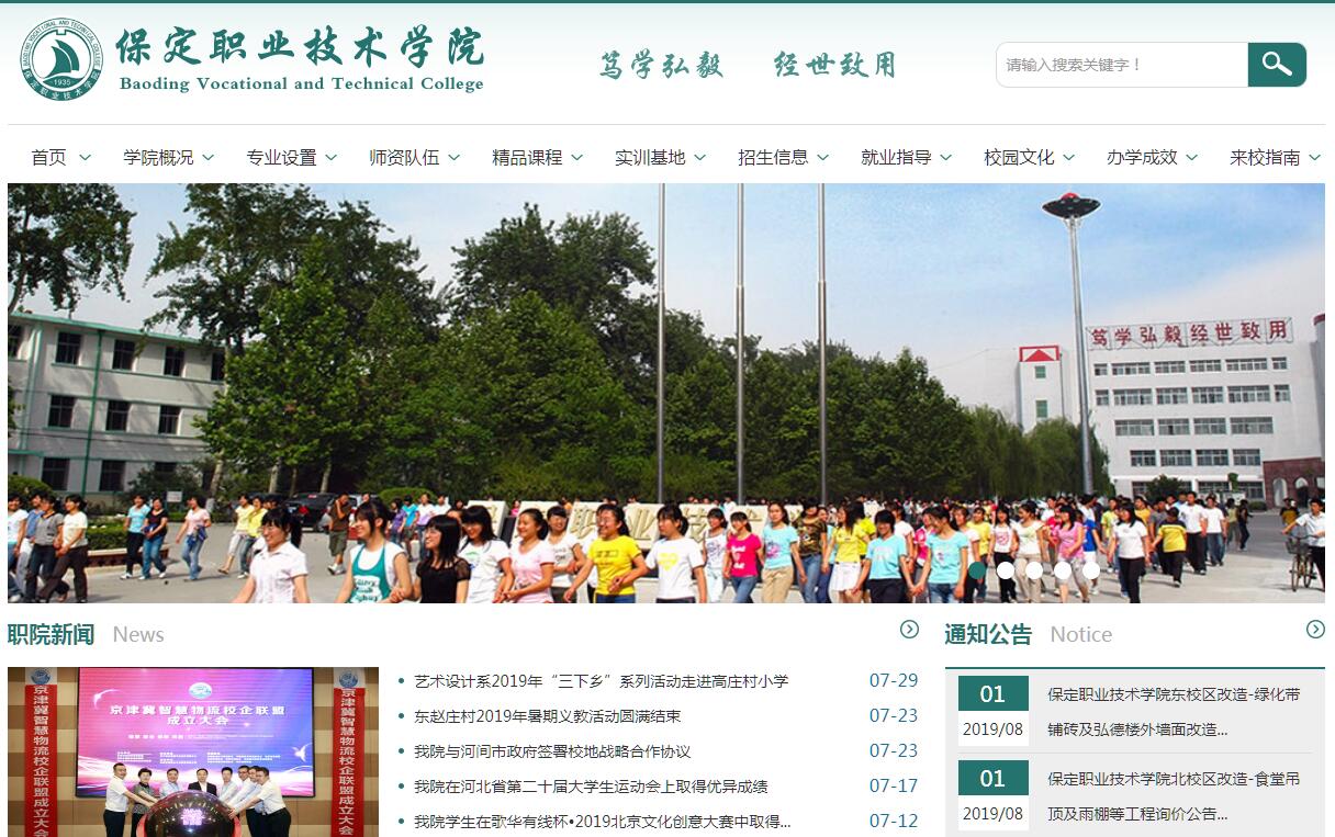 保定职业技术学院是一所国办综合类全日制普通高等职业学校,座落于历史文化名城保定市。学院前身始建于1935年,具有83年悠久的办学历史。学院现有全日制在校生10400余人。现有专任教师490人,其中教授49人,副教授154人,博士2人,硕士308人,全国优秀教师2人,河北省有突出贡献的中青年专家2人,入选省新世纪“三三三”人才工程7人,省教学名师4人,省优秀教师4人,市新世纪学术技术带头人22人,市名师12人,“双师型”教师占80%以上。学院设有农林与生物工程系、畜牧兽医系、建筑工程系、机电工程系、计算机信息工程系、经济管理系、商务技术系、贸易与旅游管理系、艺术设计系、传媒艺术系10系和马克思主义学院以及基础教学部、体育教学部、现代教育技术部3部,开设农林牧医、先进制造、电子信息、建筑施工、财经商贸与服务、艺术设计与传媒等6大专业群40余个专业。拥有国家骨干专业2个、省教改示范专业3个、国家精品资源共享课程2门、省精品课程10门。建有先进制造、电子信息、财经商贸、现代农业、现代服务业、艺术设计、影视传媒等12个校内实训中心130余个实训室。与长城汽车、保定-中关村创新中心、中铁物流、中国网库、保定智慧农业联盟、大北农集团、保定广播电视台、保定市广告协会等多家知名企事业单位合作建设校外实训基地百余处。学院建有“国家职业技能鉴定所”“河北省农业职业技能鉴定总站培训鉴定基地”“河北省电子信息行业特有工种职业技能实训基地”“全国网络与信息技术培训认证IT专业技术水平测评基地”“全国电子商务工程师(CEBE)认证考试管理中心”“全国物流信息管理师(CLIA)认证考试管理中心”“全国国际贸易职业资质认定培训考试机构”等12个职业技能鉴定或培训考评机构,在校内可对31个工种进行直接鉴定。社会已开展职业资格考试的专业学生全部参加考试,通过率90%以上。学院被中国高等职业技术教育研究会院校双证书工作委员会确定为高等职业教育国家职业资格教学改革试点院校。学院以立德树人为根本,以服务发展为宗旨,以促进就业为导向,坚持走内涵式发展道路,人才培养及各项工作获得了社会的广泛认可,毕业生就业率连续多年保持在95%以上。2018年,传媒艺术系主任田建国教授主持的《高职广播影视节目制作专业人才培养模式探索与实践》喜获国家级教学成果二等奖。学院连续多年代表河北省参加全国职业院校职业技能大赛,获得一等奖2项、二等奖2项、三等奖8项。2010年代表河北省参加全国职业技能大赛高职学生组3项赛事,荣获动物外科手术赛项一等奖、计算机网络组建与安全维护赛项三等奖、汽车维修与故障排除赛项优胜奖。2011年参加全国职业技能大赛高职组4项赛事,荣获信息安全技术应用赛项一等奖,荣获机器人技术应用、植物组织培养、新城疫抗体测定赛项三等奖。2012年参加全国职业院校职业技能大赛,荣获城疫抗体测定项目三等奖、信息安全管理与评估赛项二等奖、计算机网络应用技术赛项三等奖。2013年参加全国职业院校技能大赛荣获信息安全赛项二等奖、高职组“东方美食”杯中餐主题宴会设计大赛三等奖。2017年全国职业院校技能大赛高职组“信息安全管理与评估”赛项三等奖。近几年,我院师生参加国家级竞赛,获特等奖3个、一等奖18个、二等奖39个、三等奖29个、优秀奖30个;省市级竞赛,获特等奖11个、一等奖93个、二等奖129个、三等奖150个、优秀奖56个、最佳创意奖3个,有3部学生作品入选创意设计作品全国巡展。卢艳颖同学被授予“第五届河北省道德模范提名奖”“保定市第五届道德模范”“保定好人”称号。2018年经河北省教育厅批准学院牵头成立河北省现代物流职业教育集团,担任理事长单位。学院被教育部遴选为职业院校教育信息化试点(全省2所试点高职院校之一),被保定市人民政府确定为“保定市职业技术教育龙头学校”,被教育部、交通部确定为“全国汽车运用与维修专业领域技能型紧缺人才培养培训基地”,被河北省劳动社会保障厅、河北省教育厅确定为河北省高校首批“就业训练基地”,学生工作部被教育部评为“全国高等教育学籍学历工作先进集体”,被河北省招生委员会评选为“河北省普通高校招生工作先进集体”,被河北省教育厅评选为“河北省普通高校毕业生离校前就业工作先进集体”,学院大学生就业指导与服务中心被遴选为“河北省普通高校示范性就业指导中心”。学院立足保定、面向京津冀和雄安新区,围绕先进制造、电子信息、经贸物流、文化创意、现代农牧业和现代服务业等区域主导产业,建设高素质技术技能人才培养基地、高级工和技师培训考核基地、职业教育“双师型”教师培养培训基地和新技术应用推广中心,创办“省内一流、国内先进、富有特色”的综合性高职院校。