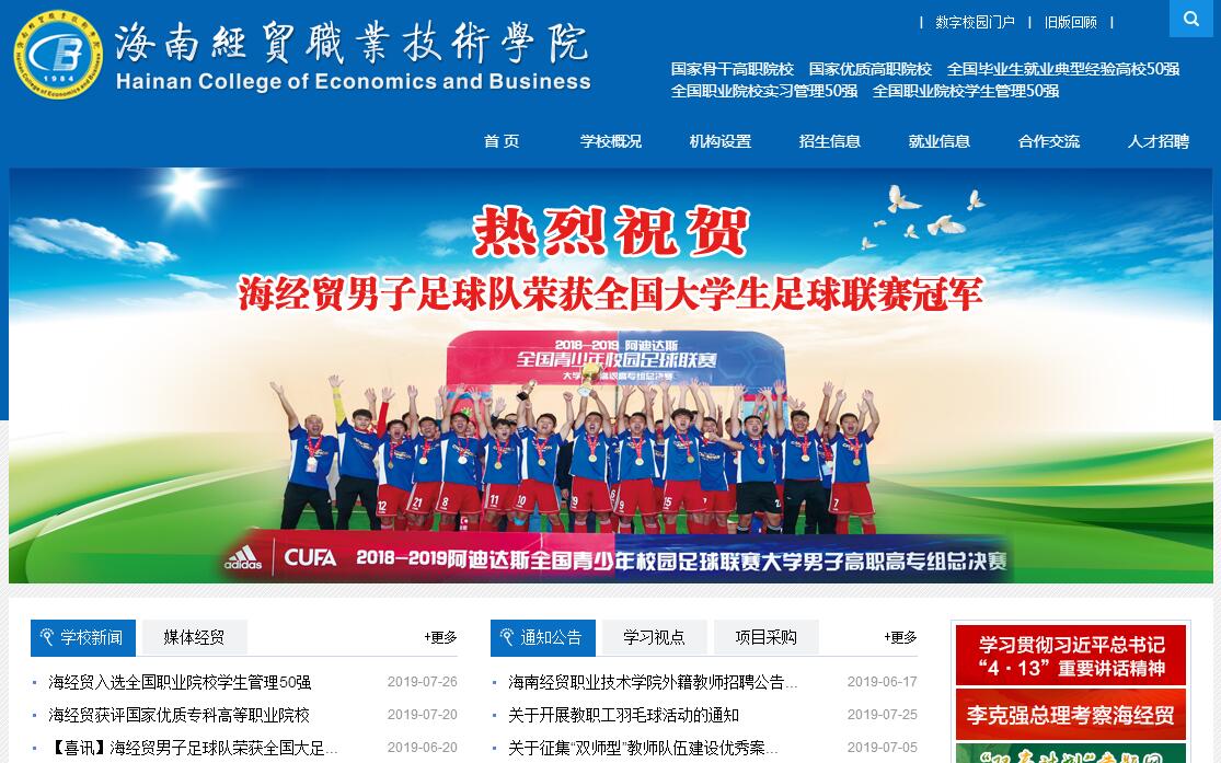 海南经贸职业技术学院创建于1984年,是一所以培养财经类高素质技术技能型人才为主的国有公办高校,是国家骨干高职院校、全国职业院校魅力校园、全国职业院校就业竞争力示范校、全国毕业生就业典型经验高校、全国职业院校实习管理50强、全国高职高专院校竞争力百强学校、全国高职院校创新创业工作先进单位、全国职业教育先进集体。学校坐落于海口市江东新区,占地面积1032亩,建筑面积36万平方米,设施齐全,环境优美,是治学求知的理想之地。学校设有财务管理学院、工商管理学院、工程技术学院、旅游管理学院、人文艺术学院、国际教育学院、马克思主义学院、继续教育学院和创新创业学院等9个二级学院,39个专科专业(方向),4个联合培养本科专业,在校学生9000多人。教职工500多人,其中校内专任教师370多人,高级职称教师近170人,博士、硕士学位的教师近70%,“双师”型教师超过85%,还有来自海内外高校、政府机构、企事业单位的200余名兼职教授和客座教授。学校坚持立德树人,以服务学生、服务发展为宗旨,以促进就业创业为导向,坚持以学生为中心、以质量为生命的办学理念,着力培养职业精神和职业技能高度融合、全面发展的高素质技术技能型人才。加强和改进思想政治工作,构建“一组一学一院一会一坛一团一网一堂一服一地”的“十个一”思想政治工作格局;实施双主体、双课堂、双导师,突出培养学生职业能力的“三双一突出”人才培养模式。近五年,学校毕业生就业率均在94%以上,多次被评为海南省高校毕业生就业工作优秀单位;学生在全国职业技能大赛及各赛项中多次荣获团体和个人一、二、三等奖。学校坚持合作发展,深入开展校企合作。实施两个“三进”,即企业、企业家、企业优秀文化进校园和学生进企业、教师进行业、学校进社会;努力提高“三力”,即学生的就业创业竞争力、教师的行业企业影响力、学校的社会社区贡献力。建立校外实践基地近200个,校内实践基地90多个,定向或订单式人才班20多个,聘请校外职业发展指导师110余名。学校坚持开放发展,积极开展交流与合作,服务“一带一路”国家战略,先后与10多个国家的20多所高校开展国际交流与合作。设有校际交换生、课程培训、学历提升、境外实习就业等国际合作项目。实施校际学分互认、互换、双学籍、双文凭合作;引进国外优质教育资源,融合国外课程培养,学生可通过“2+2”、“2+3”等分段培养方式到国外攻读本科、硕士学位;学生可到阿联酋、新加坡、韩国、马尔代夫等国家实习、就业。学校坚持文化育人,加强校园文化建设,助力学生成长成才。学校男子足球队连续9年蝉联海南省大学生足球联赛冠军,2015年荣获全国大学生足球联赛季军,2018年荣获全国大学生足球联赛亚军;每年评选“经贸自强之星”,树立一批向上向善向好的海经贸青年榜样;青年志愿者服务队连续13年为博鳌亚洲论坛年会提供高水平志愿服务;近50个大学生社团,为学生张扬个性和全面发展提供平台;丰富多样的人文课程和校园文化活动陶冶学生情操、滋养学生心灵。三十余载求索创新,两次创业谱写辉煌。今天的海经贸,正进入第三次创业的大发展时期,全体师生员工齐心协力朝着建设特色鲜明、实力领先的国家优质高职院校的目标奋进。