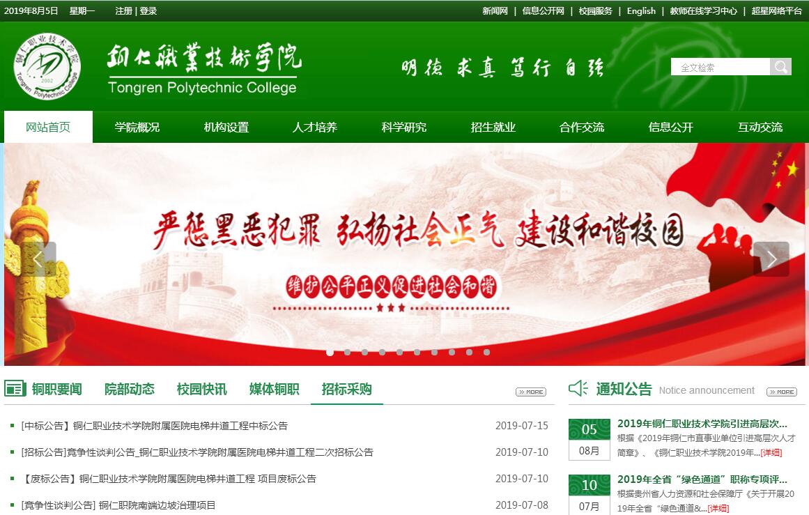 铜仁职业技术学院是2002年6月经贵州省人民政府批准成立的一所公办全日制普通高等职业学院。占地面积1411亩。国家骨干高职院校、中职国家示范学校、“省部共建”高校(国家民委与贵州省人民政府)。学院现有全日制在校学生23730人(其中高职生14383人,中职生8938人,本科生89人、留学生320人),生源来自26个省市自治区以及美国、俄罗斯、老挝、印度尼西亚、越南、尼泊尔、哈萨克斯坦、喀麦隆、卢旺达、肯尼亚、摩洛哥、埃塞尔比亚、厄立特里亚、津巴布韦等26个国家。学院现有教职工869人,其中专任教师680人,专业带头人46人,校外兼职兼课教师520名,正高职称43人,副高职称259人,中级职称300人,博士27人,硕士275人,“双师素质”教师584名。当前我院教授、硕博士、双师素质教师所占专任教师比例均位于贵州省高职院校前列。学院设有农学院、药学院、医学院、护理学院、工学院、经济与管理学院、信息工程学院、人文学院、国际教育学院、继续教育学院以及铜仁市中等职业学校、铜仁市技工学校、铜仁工业学校等13个二级办学分院(校),开设有48个高职专业,其中国家级重点专业4个、省级重点和骨干专业5个。有国家级优秀教学团队1个、省级优秀教学团队4个、省级科技创新人才团队1个、省级大师工作室3个,国家级精品课程1门、国家资源共享课程1门、省级精品课程和开放课程11门。学院拥有“四大高层次科研创新平台”,即博士后科研工作站、民族中兽药分离纯化技术国家地方联合工程研究中心、民族中兽药与生态畜牧业人才基地、贵州省民族中兽药工程技术研究中心。设有国家茶产业体系(铜仁)茶叶综合试验站、贵州省中兽药工程研究中心、铜仁市产业发展研究中心、民族兽药研究所等20个研发机构。有生态农业示范园、药学及药品生产开放性实训基地、NIIT大数据与软件服务外包实训基地等153个校内生产性实训基地,与368个企业、村寨合作建立了实习基地,形成了集“教、学、做、研、推、训、产”于一体的多功能实训基地学院与中南民族大学、大连民族大学、贵州大学、贵州师范大学等十余所国内高校联合办学;与美国阿兰特国际大学、韩国国立交通大学、印度尼西亚甘加马达大学、马来西亚沙巴大学等二十余所国(境)外高校联合办学。学院坚持“立德树人,以技立业,服务社会”的办学理念,秉承“明德、求真、笃行、自强”的校训,弘扬“求真务实、自信自强”的校园精神,紧贴地方产业发展,培养复合式创新型高素质技术技能人才,通过强内涵、提质量、优结构、稳规模,努力建设具有“世界水准、中国特色、铜仁标志”的全国优质高职院校。2011年,荣获“全国毕业生就业典型经验高校”称号。2012年,获批全国事业单位法人治理结构改革试点单位;同年,获批全国首批教育信息化试点单位。2013年,以优秀等次通过“国家示范性高等职业院校建设计划”骨干高职院校建设项目验收;同年,在首届《中国职业教育百强》评选中,跻身全国高职25强。2014年,作为唯一一家高职院校,在全国职业教育工作会议上作典型经验交流发言,张景春院长还受到国务院总理李克强亲切接见;同年,领办的铜仁市中等职业学校顺利通过“国家中等职业教育改革发展示范学校建设项目”验收,学院成为高职、中职国家级双示范院校。2015年,荣登“见证2014——我们眼中的中国职业技术教育亮点”年度学校榜首;同年,国家民委与贵州省人民政府签署共建铜仁职院协议,学院成为南方唯一一所国家民委与地方政府“省部共建”的高职院校。2016年,成为全国职业院校教学诊断与改进工作27所试点院校之一。2017年6月,成为贵州省首批优质高职院校立项建设单位;获批“首批全国新型职业农民培育示范基地”;7月,中国高等职业教育质量年度报告发布,学院荣获“2016高等职业院校国际影响力50强”;9月,成功入选教育部第二批“全国百所现代学徒制试点高职院校”;12月,获批第五批“全国民族团结进步创建示范区(单位)”。2015、2016、2017、2018,连续四年跻身“中国专科(高职高专)院校竞争力排行榜”全国100强,位列贵州省首位。
