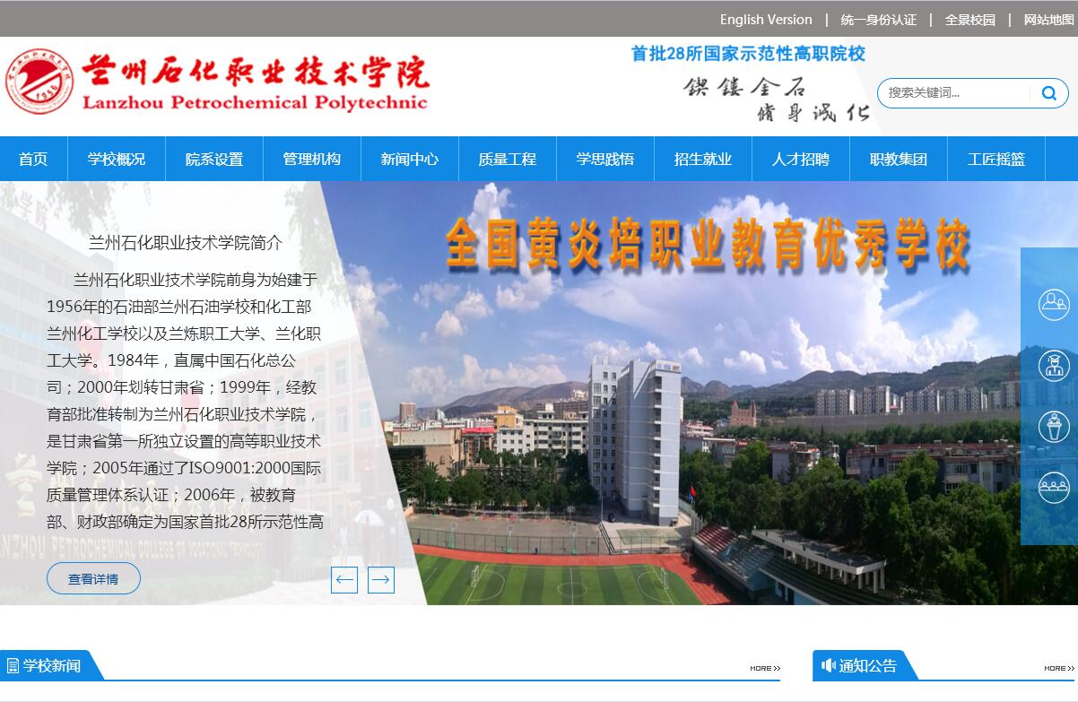 兰州石化职业技术学院前身为始建于1956年的石油部兰州石油学校和化工部兰州化工学校以及兰炼职工大学、兰化职工大学。1984年,直属中国石化总公司;2000年划转甘肃省;1999年,经教育部批准转制为兰州石化职业技术学院,是甘肃省第一所独立设置的高等职业技术学院;2005年通过了ISO9001:2000国际质量管理体系认证;2006年,被教育部、财政部确定为国家首批28所示范性高职院校;2016年,被甘肃省人民政府确定为“双一流”大学项目建设院校;2010年,经甘肃省政府批准,在学院挂牌成立了甘肃工业技师学院。兰州石化职业技术学院是伴随着新中国第一座现代化炼油厂和第一座化学工业基地的开工建设而创建的,跨越了两个世纪,是新中国第一所石油化工行业的职业院校,建校60周年以来,为祖国石化行业和甘肃省地方建设培养了以铁人王进喜为代表的10万余名建设人才,这个学校的历史就是国家石油化工的历史。为国家职业教育发展提供了借鉴和示范,为新中国石油和化学工业建设提供了智力支撑和人才保障,参与并见证了国家工业化建设的全过程,是当时工匠人才培养的“国家队”,是民族工业职业教育的脊梁,被誉为新中国石化职业教育的“共和国长子”和“黄埔军校”。依靠其得天独厚的工业行业背景和办学60年来形成的深厚文化底蕴,为契合“一带一路”、“中国制造2025”等国家重大战略,学校把培养学生专业成才和精神成人有机结合起来,推动行业文化深度融入育人全过程,将职业要求融入专业教育和就业教育之中,全方位提升学生的文化修养和职业素养,着力打造“工匠摇篮”,促使学生事业成功,实现学生更高质量的更好就业,使学生更好地服务于行业和经济社会之所需。按照习近平总书记在全国高校思想政治工作会议上所提出的“为学生一生成长奠定科学的思想体系”的要求,学院着力为高职学生一生成长奠定科学的思想体系,着力培养学生既要专业成才又要精神成人,着力培养学生成为国家急需的工匠人才。学院培养出了全国优秀共产党员、党的十八大代表、十九大代表、全国政协委员、中石化集团首席技师、书写‘石化工匠’传奇的张恒珍以及“堵漏大王”、“钾盐专家”、“用数据说话”、“首席翻译”等一大批专业成才、精神成人的工匠人才。正如中国石油和化学工业联合会常务副书记曾坚等业内行家所言:“兰州石化职业技术学院是全国石油与化工行业社会影响力最大、专业最全、学生人数最多、就业最好的学校,是石油化工职业教育名副其实的‘工匠摇篮’和‘黄埔军校’”。学校位于中国版图几何中心——金城兰州,毗邻被誉为“新中国石化工业摇篮”和“共和国长子”的兰州石化公司,建筑面积30万平方米,建有57个校内实训基地、150个实验实训室,在中石油兰州石化公司等知名企业建有154个稳定的校外实训实习基地。学校资产净值超过7亿元,各类实训实验仪器设备总值1.7亿元。学校现有专任教师635名。其中:教授82名,副教授189名,博士、硕士360名,“双师型”教师322名,兼职教师208名。4名教师获得黄炎培职业教育杰出教师称号;学校老师还获得教育部自然科学奖二等奖、甘肃省自然科学奖二等奖、敦煌文艺奖二等奖、铁人文学奖等;获国家级精品课程1门、省级精品课程25门、省级精品资源共享课程13门。学校现设石油化学工程学院、应用化学工程学院、机械工程学院、电子电气工程学院、信息处理与控制工程学院、汽车工程学院、国际商务学院、人文学院、马克思主义学院、国际教育学院、土木工程学院、印刷出版工程学院等12个二级学院及成人与职业培训学院和石油化工技术等6个研究所(室)、15个企业技术研发中心。学校面向全国27个省、市、自治区招生,可招生专业和专业方向为82个,其中国家示范专业4个、甘肃省示范专业5个、甘肃省特色专业8个。现有全日制在校生14000多名,成人教育和短期培训学员6000余名。近年来,学校坚持“遵循规律,追求特色,产教结合,突出技能”的办学理念,积极探索高等职业教育规律,大力推进教育教学改革,毕业生一次性就业率连续10年超过96%。学校获得“全国文明单位”“全国职业教育先进单位”、“全国黄炎培职业教育优秀学校”“全国毕业生就业工作‘星级示范学校’”“2009年中国十大最具特色高职院校”“2010中国十大最具就业力高职院校”“全国高职院校思想政治工作创新示范案例50强”、“全国高职院校社会服务贡献50强”“甘肃省2017年思想文化工作创新提名奖”“中国石油和化学工业文化建设先进单位”“全国高职高专院校科研工作先进单位”“甘肃省教育系统先进单位”“甘肃省职业技术教育先进集体”“甘肃省毕业生就业工作先进集体”“甘肃省思想政治工作先进集体”“首届甘肃十大杰出职业院校”等荣誉称号。