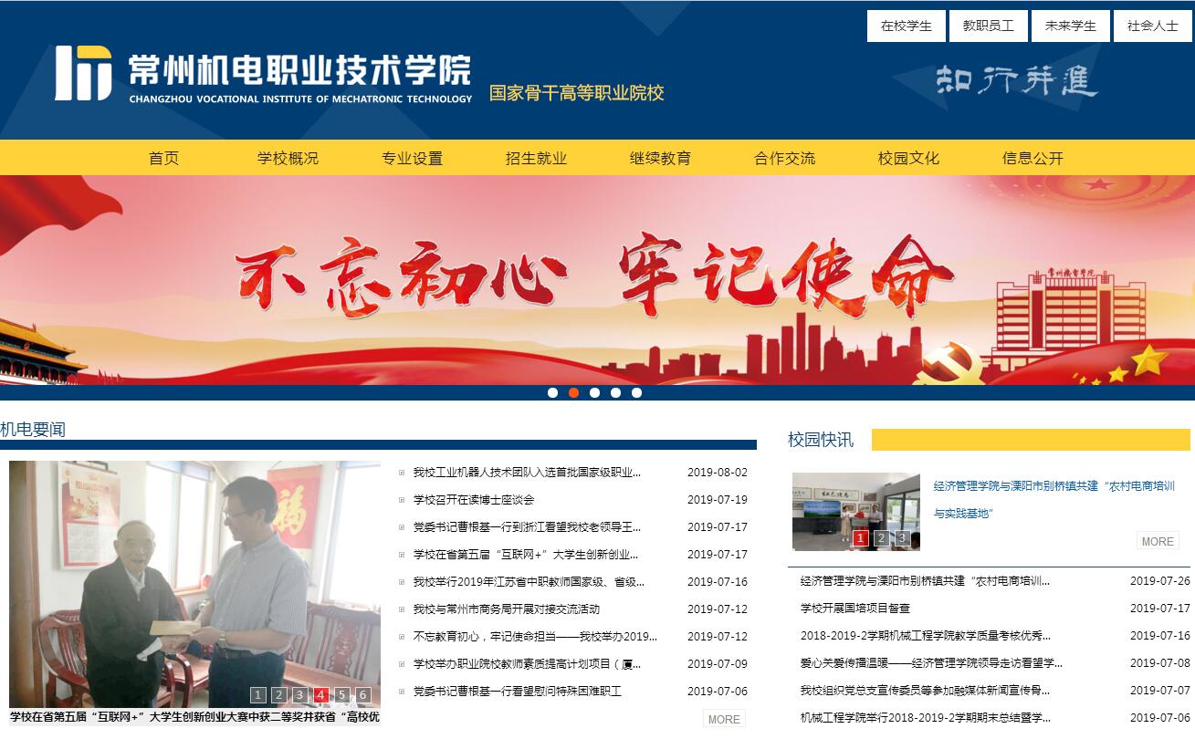 常州机电职业技术学院,是一所省属公办全日制高等职业院校,创办于1963年,原名常州市机械职业学校,现坐落于常州科教城。2002年,学校独立升格为高职院校,隶属江苏省教育厅。2010年,学校成为国家示范(骨干)高职院校;2018年,学校成为江苏省高水平高职院校建设单位。学校占地面积942亩,建筑面积30多万平方米,现有全日制在校生10000余人(规模12000人),教职工700余人。学校秉承“知行并进”的校训精神,坚持“以人为本、崇尚技术、开放共享、追求卓越”的办学理念和“就业导向,使每个学生成才;持续改进,让一切客户满意”的办学质量方针,大胆创新办学体制机制,深化教育教学改革。学校创新“四方三层、内园外站、共建共赢”校企合作办学模式,组建由政行企校四方代表成员组成的校企合作理事会,打造“内园外站”校企合作平台,建立“跨界互动、合作发展”的紧密型校企合作办学机制,形成产教融合的“苏南”模式。2014年牵头成立“全国机械行业现代农机装备人才培养联盟”、“全国机械行业工业机器人与智能装备职业教育集团”等全国性职教集团,推进产教深度融合,提高办学吸引力,打造职教品牌。学校根植产业,服务地方,形成“以装备制造产业类专业为核心、制造业服务类专业为支撑”的专业格局,开设专业45个。学校设有9个二级学院(机械工程学院、电气工程学院、模具技术学院、车辆工程学院、轨道交通学院、信息工程学院、经济管理学院、创意设计学院、国际教育学院)、3个部(文化基础部、专业基础部、体育部)和马克思主义学院、继续教育学院等14个教学部门。学校主动对接区域产业发展需求,建有工业设计、先进机械制造技术、智能装备技术、物联网与制造业信息化、汽车技术与服务、供应链服务等六大特色专业群。学校深化“三合一、全过程”工学结合人才培养模式改革,实施“做中学”、“做中教”教学模式,构建“多元主体、双线并进、三化管理”教学质量保障体系,建有教育部全国职业院校装备制造类示范专业点2个,江苏省高等学校品牌专业2个、省高等学校特色专业3个、国家骨干高职院校重点建设专业5个、央财重点支持建设专业2个、省示范性高职院校重点建设专业3个、全国机械行业特色专业4个、省重点专业群4个、省高校品牌专业工程一期项目2个、省高等职业教育高水平骨干专业5个。目前,学校有33个专业信息资源库和59门课程教学子资源库,其中“职业教育工业机器人技术专业教学资源库”为“国家职业教育专业教学资源库”并已通过验收,另有国家职业教育专业教学资源库课程子项目5个。学校重视师资队伍建设,坚持把建设一支结构合理、治学严谨、素质优良、富有活力的师资队伍作为重中之重。学校有专任教师498人,从行业企业聘用兼职教师350余人。专任教师中,高级职称210人,占专任教师的42.17%;硕士以上学位的教师375人(其中,具有博士学位教师54人),占专任教师的75.30%;具有双师素质的教师440人,占专任教师的88.35%。教师中,有江苏省教学名师3人,江苏省突出贡献中青年专家1人,江苏省“333工程”培养对象10人,江苏省六大人才高峰资助对象2人,常州市831高层次创新创业人才培养对象2人,国家级教学团队1个,江苏省优秀教学团队3个,江苏省“青蓝工程”优秀教学团队2个,江苏省“青蓝工程”中青年学术带头人5人,江苏省“青蓝工程”优秀中青年骨干教师25人。学校以每个学生成才为办学己任,自2005年起开展ISO9000质量管理贯标认证工作。作为常州及江苏省智能装备技术人才的重要培养基地,每年为区域输送近4000名毕业生,毕业生初次就业率保持在98%以上,就业岗位专业对口率达85%以上,用人单位对学校毕业生的满意度达96%以上。近年来,学生在全国职业院校技能大赛中获一等奖16项,涌现了“江苏省大学生年度人物”徐辉、全省大学生职业规划大赛总冠军何睿杰等一批典型学生。学校打造公共技术服务平台,创建“多方位、立体化”的社会服务体系,建有机器人及智能装备应用技术研究中心、物联网与制造业信息化工程技术研发中心等国家级、省市级科技平台20个,获“江苏省科技工作先进高校”称号。学校大力推进继续教育,年社会培训近20000人次,获“江苏省高技能人才培养示范基地”称号。学校“常州机器人及智能装备应用技术研究中心”获科技部立项,成为当年国家创新基金项目主持单位中唯一一所高职院校。学校《数字化经编装备及智能化管理系统》项目,获中华全国工商联合会科技进步一等奖。学校拓展中外合作办学项目、建立国际师资培训机构、互访交流、聘请优秀外教等方式,提升国际化办学水平。近年来,学校与国际知名企业开展合作订单培养,开设机电一体化技术专业中德“双元制”班,开展“中德合作机械制造专业引入胡格教学模式”项目,建立“机电-亚龙国际师资培训中心”,开发国际合作培训项目。学校完成了校园网络扁平化和无线网络改造,形成万兆主干、千兆桌面的IPv4/IPv6双栈的校园网络架构,实现了多运营商互联网接入,校园总出口带宽达10G。校园有线和无线网络覆盖全部教学、办公、生活等区域。虚拟仿真教学软件在专业教学中得到广泛应用,教师信息化教学能力普遍提升。近年来,学校获信息化教学大赛全国二等奖1项、三等奖3项,省级一等奖7项,二等奖16项。学校