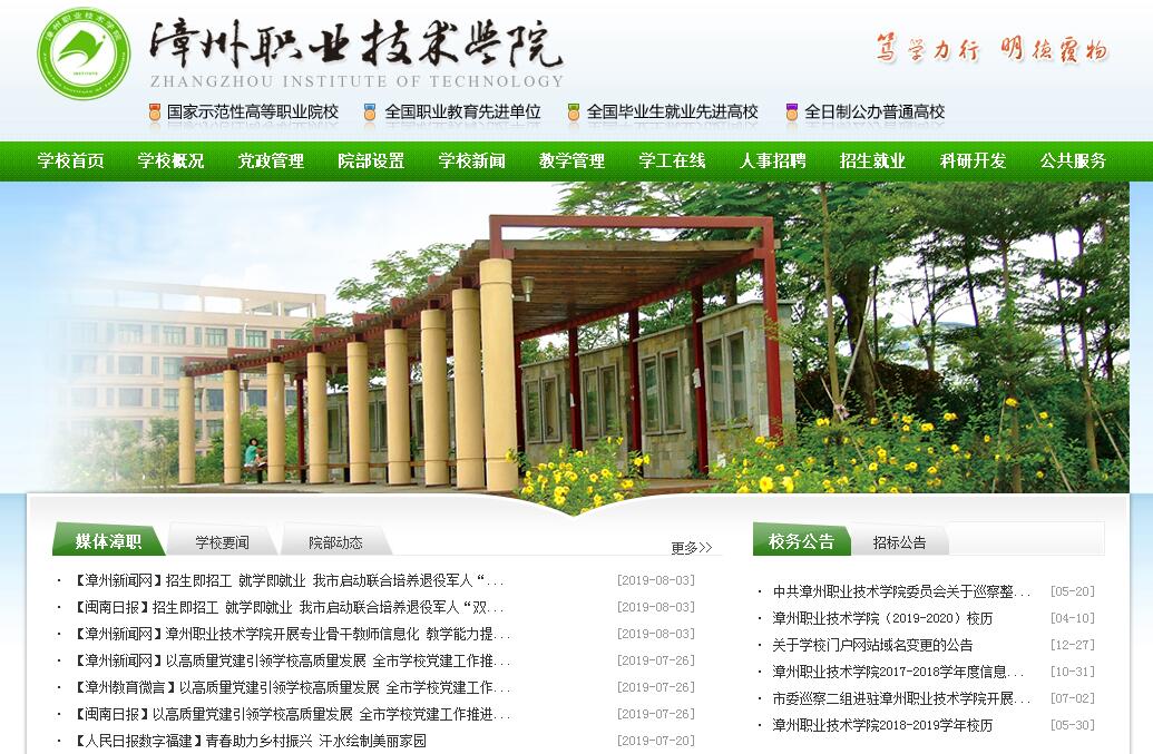 漳州职业技术学院前身为创办于1984年的漳州职业大学,2002年4月,经福建省人民政府批准,更名为漳州职业技术学院。学校是漳州市人民政府举办的一所全日制公办普通高职院校,现有专兼职教师900多人,其中高级职称教师230多人,“双师”素质教师640多人;全日制在校生近1.3万人。设置有10个二级学院和公共教学部、思想政治理论课教研部、成人教育部等教学单位;开设了应用电子技术、计算机网络技术、食品加工技术、物流管理、数控技术、建筑工程技术等50个以工科为主,文、经、管应用科类协调发展,紧密对接区域经济发展的高职专业。学校现有国家示范性重点专业6个,国家提升专业服务能力建设专业2个,省级精品专业7个,省级示范专业12个,省级高校创新创业教育改革试点专业3个,福建省高职院校专业建设质量评价位列全省第一的专业18个;高等职业学校骨干教师国家级培训基地1个;全国高校职业发展与就业指导示范课程1门,省级精品课程29门,省级高校创新创业教育改革精品资源共享课程4门,“十二五”职业教育国家规划教材8本,特色工作页19本;省级高职教学改革综合试验项目2个,省级教育改革试点项目6个,省级高校教学改革研究项目5个;国家级现代学徒制试点1个,省级现代学徒制项目7个,省级“二元制”改革专业2个;省级教学团队7个,省级教学名师10名,省级专业带头人16名;国家级教学成果奖二等奖1项,省级教学成果奖特等奖2项、一等奖3项、二等奖6项。2004年以来学校学生获全国数控技能大赛等国家级职业技能竞赛三等奖及以上达220多项,获省级职业技能竞赛三等奖及以上达500多项。近年来,学校先后承办了2个“国赛”项目、50多个“省赛”项目,获得“国赛”一等奖8个,二等奖27个,三等奖43个;“省赛”一等奖114个,二等奖80个,三等奖47个。中央财政支持的实训基地7个,省级财政支持的实训基地6个,构建了基于工作过程系统化的课程体系,建有电子、食品加工、数控、物流、计算机网络技术、汽车等生产性实训基地及校外实习基地410多个,配置纸质图书93.4万册,教学仪器设备总值1.4亿元。拥有福建省规模最大、鉴定工种最全、鉴定人数最多,并具有高级技师鉴定资格的国家职业技能鉴定站,鉴定项目和鉴定工种涵盖了学校所有专业领域。学校不断拓宽办学渠道,与加拿大、德国、新加坡等国家及台湾地区有关技职院校和行业协会,在联合办学、师资培训、先进教育理念、管理理念、课程及职业资格标准引进等方面开展了实质性合作,并率先在全省建立戴姆勒奔驰铸星教育项目,进一步提升办学能力。在漳州市政府的重视牵头下,学校以内涵建设为主线,积极探索校企深度合作,与华为技术有限公司、福建龙溪轴承(集团)股份有限公司、福建万利达集团、福建紫山集团股份有限公司等200多家知名企业合作,成立了由政府、企业与学校三方参与的“漳州市校企合作委员会”,大力推行订单培养和工学结合,先后在19个专业实施订单培养,在每个专业实行“工学交替”人才培养。迄今已为社会输送了5万多名适应生产、建设、管理、服务第一线需要的“下得去,留得住,用得上、干得好”的技术技能人才,为区域经济建设做出了积极的贡献,人才培养质量受到用人单位和社会的普遍欢迎。学校办学成效受到上级领导部门和社会各界的充分肯定和赞扬。2002年获福建省职业教育先进单位;2003年被确定为全国承担数控技术应用专业技能型紧缺人才培养培训工作的90所高职院校之一;2004年成功通过高职高专人才培养工作水平优秀评估,2015年通过高等职业院校人才培养工作第二轮评估;2005年获全国职业教育先进单位;2007年10月被教育部、财政部确定为“国家示范性高等职业院校建设计划”立项建设单位,2010年6月顺利通过国家级验收;2010年4月被教育部评为“全国毕业生就业典型经验高校”;2012年6月被教育部确定为全国重点建设职业教育师资培养培训基地;2014年5月获评第四届“黄炎培职业教育优秀学校奖”。学校在“2012-2016年全国普通高校竞赛评估结果(高职组)”中位居全国高职高专院校第18位;在杭州电子科技大学中国科教评价研究院(CASEE)、武汉大学中国科学评价研究中心(RCCSE)、中国教育质量评价中心和中国科教评价网联合发布的“2018-2019年中国高职高专院校竞争力排行榜”中排名第90位。