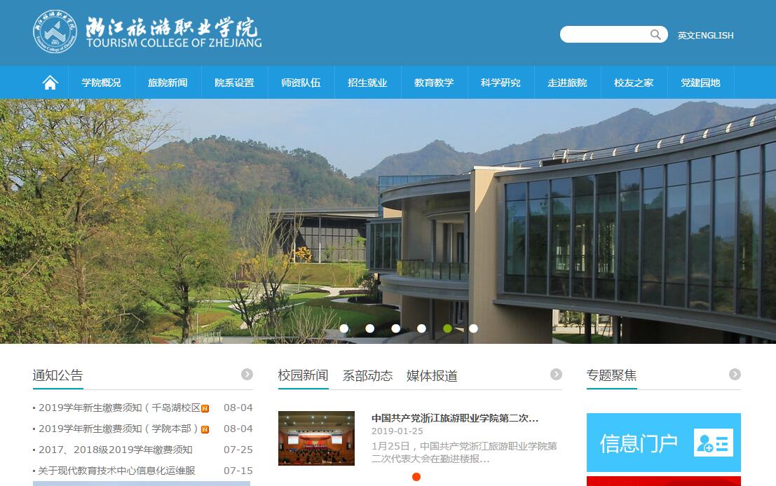 浙江旅游职业学院是由文化和旅游部与浙江省人民政府共建的一所公办高等旅游院校。学院坐落于中国历史文化名城、风景旅游胜地——杭州,拥有萧山、千岛湖两大校区,共占地1080亩,总建筑面积约27万平方米。校园内碧草如茵,楼宇隽永,两大校区分别与钱塘江、千岛湖交相辉映,萧山校区为国家4A级旅游景区,千岛湖校区依山傍湖,尽享5A级景区资源,是理想的求知圣地。学院前身为1983年创建的浙江省旅游职工中等专业学校,2000年升格为浙江旅游职业学院。学院现为全国唯一一所旅游类国家示范性骨干高职院校,唯一一所国家旅游标准化示范院校,同时也是第一所通过联合国世界旅游组织旅游教育质量认证的旅游院校,教育部第一批教育信息化试点优秀单位。2017年被确定为“浙江省高职优质校建设单位”。浙江旅游职业学院是一所特色鲜明的旅游类高职院校,学院设有酒店管理系、旅行社管理系、旅游规划系、外语系、艺术系、烹饪系、工商管理系、社科部、千岛湖国际酒店管理学院、国际教育学院、继续教育学院等11个系(部、院),开设有酒店管理、导游、烹调工艺与营养、空中乘务等28个与旅游业密切相关专业,其中国家骨干重点建设专业8个,中央财政支持建设专业2个,世界旅游组织旅游教育质量认证专业11个,教育部现代学徒制试点专业3个,全国职业院校旅游类示范专业点2个,省级示范重点建设专业4个,省级优势专业7个,省级特色专业13个。浙江旅游职业学院紧紧围绕旅游办专业、围绕旅游育人才、围绕旅游搞科研、围绕旅游强服务,积极探索育人模式,建成并投入使用中央财政支持职业教育实训基地1个、省级实训基地13个,其中省“十三五”高等职业教育示范性实训基地6个,建有浙江旅游博物馆、浙江省智慧旅游体验中心,拥有中国旅游研究院旅游标准化研究基地、浙江省旅游智库、浙江省乡村旅游应用技术协同创新中心、浙江旅游科学研究院、浙江省旅游发展研究中心、浙江旅游培训中心、浙江省旅游标准化技术委员会以及浙江省旅游统计数据中心等机构平台,设有旅苑酒店、旅苑国际旅行社、旅苑会展公司等“旅苑”品牌系列“校中店”。校企合作方面,学院先后与省内50多个旅游重点县(市、区)和开元旅业、乌镇旅业等180多家国内外知名企业签订合作协议,与宋城集团、艺龙集团等企业共建企业制学院9个,形成以省部共建为重点、局校共建为支撑、“1+6”校企(地)合作工程为平台的多方联动式办学机制。2016年起,连续三年被评为全国“高等职业院校服务贡献50强”。浙江旅游职业学院秉承“励志、惟实、博爱、精致”的校训,致力于打造国际化的教育环境和高品质的教学团队。学院为浙江省国际化特色高校建设单位,全省第一所具有招收外国留学生资格的高职院校、全国首批“中美高素质技能型、应用型人才联合培养百千万交流计划”项目院校。现设有非独立法人中外合作办学机构——中澳国际酒店管理学院,在莫斯科成立的中俄旅游学院是浙江高校在俄罗斯设立的第一所境外办学机构,不断深化“开放多元、互融共建、文化分享”的国际化办学机制。学院与瑞士洛桑酒店管理学院、澳大利亚威廉•安格理斯学院、英国谢菲尔德哈勒姆大学、意大利ALMA国际餐饮学院、俄罗斯国立旅游与服务大学、韩国顺天乡大学、台湾高雄餐旅大学等18个国家和地区的40多所高校建立长期稳定的合作关系,与美国迪斯尼公司、阿联酋迪拜豪华酒店集团、意大利歌诗达邮轮集团、日本温泉饭店等80余家全球顶尖旅游企业建立紧密型合作关系,每年出国(境)留学、研修、实习、访问的学生占毕业生总数的10%以上,同时招收来自韩国、日本、俄罗斯、荷兰等国留学生近百名,聘请外籍教师30余名,85%的一线教师与管理者有国(境)外学习培训、考察访问经历。2017年、2018年连续两年被评为全国“高等职业院校国际影响力50强”。截至2018年10月,学院现有全日制在校生12256人,教职员工560名,其中拥有副高以上职称教师148名,“双师型”教师占90%以上。其中教育部高职高专教学指导委员会专家2名,国家旅游业青年专家5名,省级教学指导委员会专家6名,浙江省学科带头人1名,浙江省高职高专专业带头人22名。学院拥有国家级教学团队1个,省级教学团队2个;国家社科基金项目2项,省部级科研课题114项;国家级教学成果奖1项,省级教学成果奖8项;国家级精品课程3门,国家级精品资源共享课程2门,省级精品课程19门,省级在线精品开放课程5门。“互融为和,克己为礼,业精于勤,功成于进”。浙江旅游职业学院将继承与发扬“和礼勤进”的旅院精神,走“依托行业、产学结合、接轨国际”的特色发展之路,致力于培养有社会之责任、敬业之精神、博爱之胸怀、国际之视野的旅游英才,努力建设成一所国内一流、国际知名的优质高职院校,着力打造旅游教育的“中国品牌”和“中国服务”人才培养的摇篮。