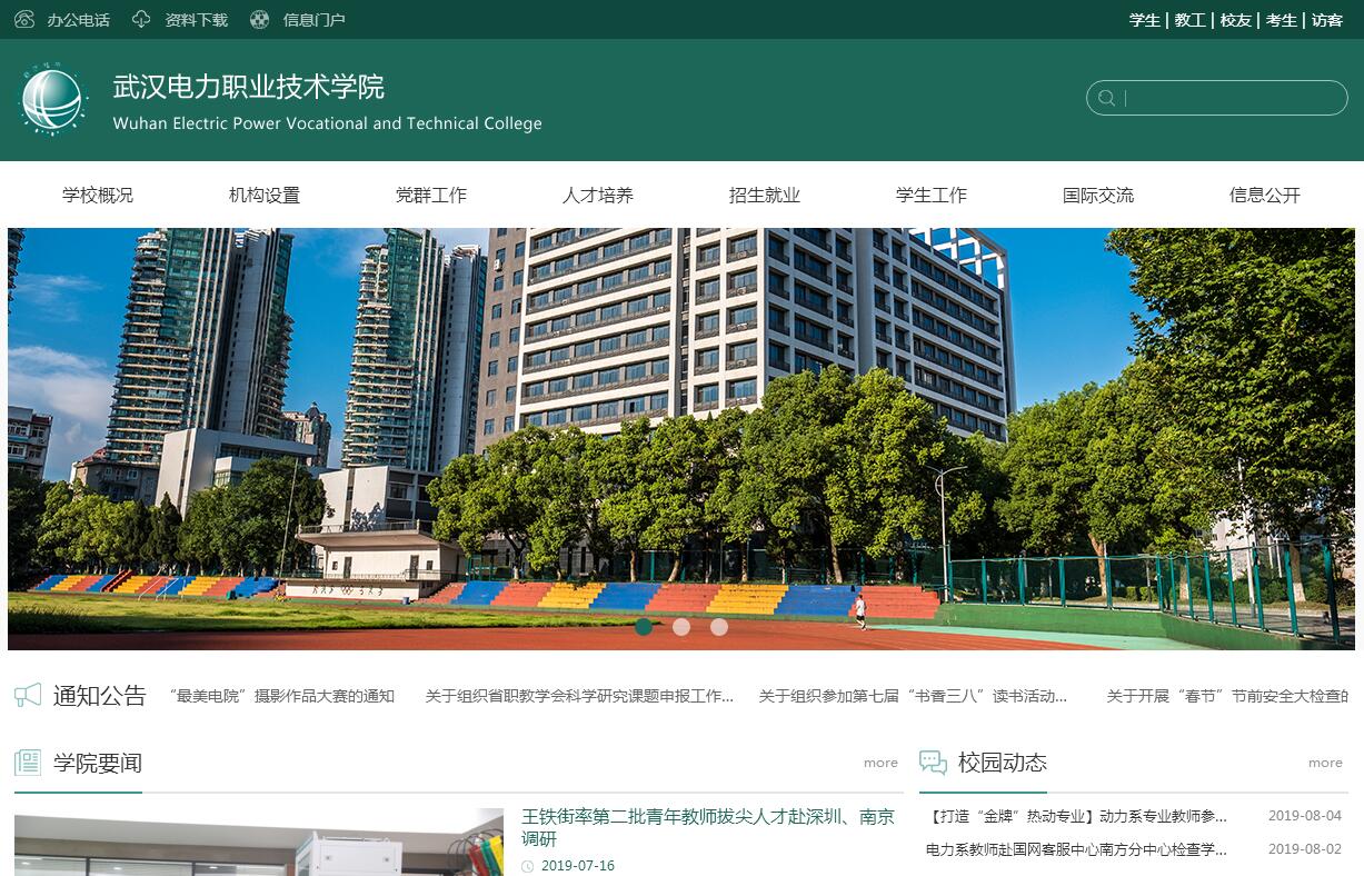 武汉电力职业技术学院创建于1953年,前身是武汉电力学校。1958年更名武汉电力专科学校。1960年筹建湖北电力学院并招收了第一届本科生。1962年更名武汉电力学校。1980年获得第一批“国家重点中专”称号,是湖北省和全国电力行业中专的“龙头”院校。2002年升格为武汉电力职业技术学院。65年来,学院为国家电力工业和地方经济发展输送了6万余名毕业生,享有“湖北电力黄埔”之美誉。学院认真贯彻党和国家的教育方针,坚持正确的办学方向,紧跟电力工业的发展步伐,走出了一条根植行业、教培互举、科学发展、特色鲜明之路。当前及今后一个时期,我院的发展目标是:以服务发展、促进就业为办学方向,努力建设成为专业特而精深、培训强而精优、校园小而精致、队伍齐而精良、管理细而精益、职工安而知进、文化久而弥新的现代高职院校。学院占地249亩,校园建筑面积20.9万平方米,固定资产总值3.71亿元(不含土地)。建有各类多媒体教室76间、公共机房12间。教学用计算机3117台(生均1.3台),馆藏图书42.81万册(生均183.9册),校内实训实习设备总值1.17亿元(生均5.02万元)。办学资质过硬 学院是“湖北省示范性高职院校”和“全国高职高专院校人才培养工作水平评估优秀学校”,同时也是“国家高技能人才培养示范基地”、“湖北省高技能人才培养示范基地”、“国家电网公司高技能人才培训基地”、“全国电力系统仿真培训基地”和首批国家职业技能鉴定示范站所。学院在职职工387人,其中专任教师202人。本科及以上学历人员194名,占教师总数的96%;各类中、高级职称人员178名,占教师总数的88%;副高以上职称86人,占教师总数的42.6%;“双师”型教师139人,占教师总数的68.8 %。另外,从企业聘请专兼职培训师89人。目前,学院有实践经验的专兼职教师占专业教师总数的78.4%。学院设有电力工程系、动力工程系、机电工程系、建设及管理系、信息工程系和环境工程系等6大专业系部,以及思想政治课部和基础教学部两个公共课部。开办高职专业26个,近年实际招生的9个专业中,国家央财支持重点建设专业2个、省级重点专业5个、省级新型(支柱)产业计划项目专业1个、省级品牌专业1个、特色专业2个;国家级精品资源共享课2门、国家级精品课程2门、省级精品课程9门;实训基地32个、实训室98个,其中国家央财支持实训基地2个,国网公司实训基地3个,省级重点实训基地4个,校外紧密型实训基地77个,实训基地骨干专业覆盖率100%;毕业生就业率已连续五年97%以上,居湖北省同类院校榜首;年培训量20万人天,年技能鉴定考证4万人次。先后荣获“全国文明单位”、“全国职业教育先进单位”、“全国就业50强”、“全国职工教育培训示范点”、“全国模范职工之家”、“国网公司文明单位”、“湖北五一劳动奖状”、“湖北省最佳文明单位”等荣誉称号。