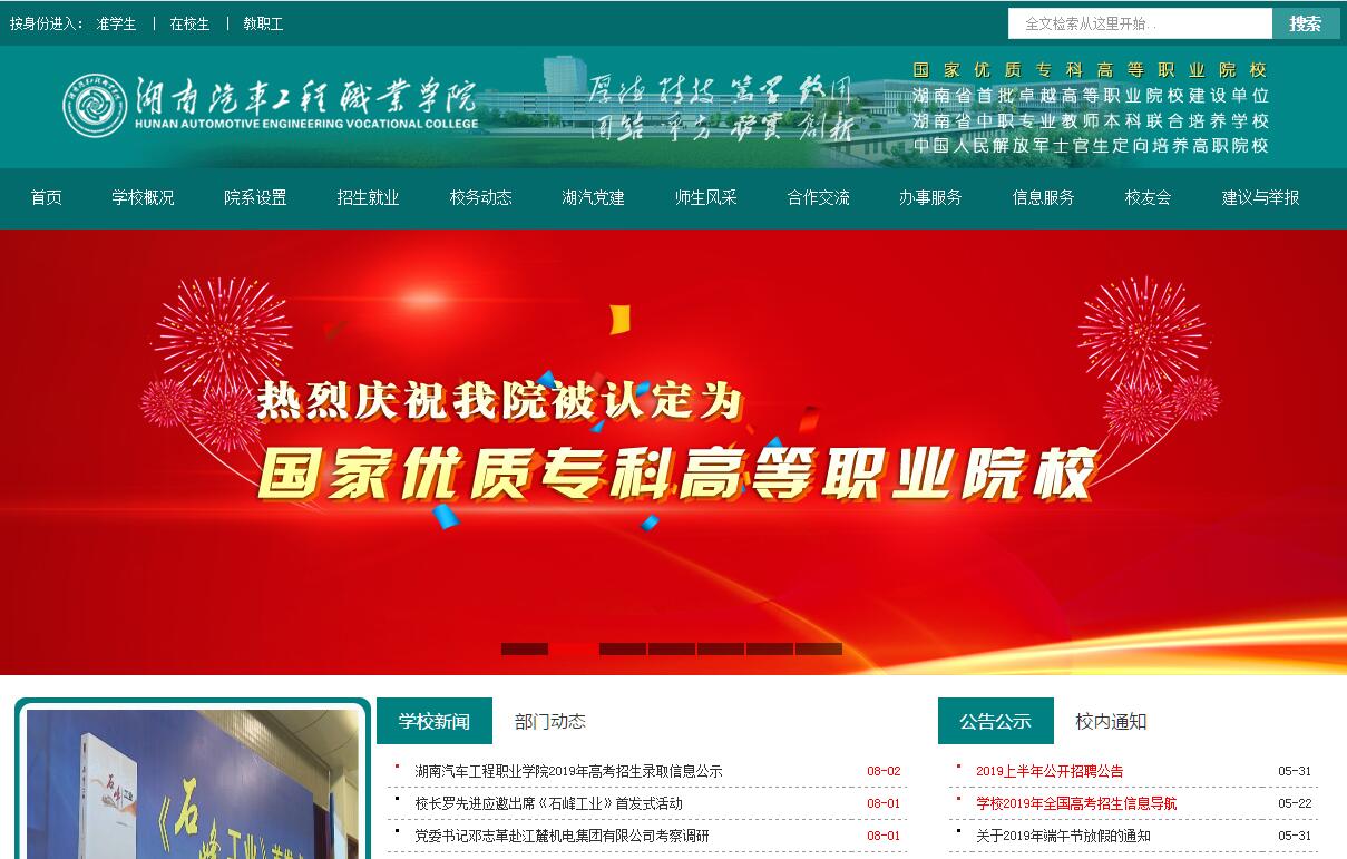 湖南汽车工程职业学院于2005年升格为全日制高等职业院校,2008年通过教育部高职高专人才培养工作水平评估并获得“优秀”等级,2009年获评“湖南省文明高等学校”,2010年、2016年获评“湖南省文明单位”,2011年立项湖南省示范性(骨干)高职院校,2012年获评全国职业院校魅力校园,2013年成为株洲市政府和中国汽车工程学会共建院校,2014年获评全国职业教育先进单位,2015年入围全省首批8所省卓越高等职业技术学院立项建设单位和6所本科中职专业教师联合培养高职院校,2016年成为全省4所士官生定向培养高职院校之一,2018年获评湖南省“十大平安”系列创建示范单位。学校坐落于株洲市红旗北路,毗邻沪昆高速和长株高速,交通便利,环境优美,总占地面积1055亩,校舍建筑面积30万平方米,建有12个校企合作生产性实训基地、109个实训室和98个校外实训基地,馆藏纸质图书69万册、电子图书32万册,总资产4.5亿元。建设中的新校区坐落在长株潭两型社会云龙示范区,按照现代、绿色、集约、共享理念规划设计,承山而建,傍水而起,山林书院,鸟翠墨香,形成了三山两水的景观格局,一环串五区的功能布局体系,“生态聚落”化的建筑组团。这座现代简约、工业气质的生态海绵校园已于2018年9月正式启用。学校现有在职教职工632人,专任教师446人,双师素质教师比例为82.04%,硕士及以上学位教师比例为58.1%,高级职称比例为45.5%。拥有享受国务院特殊津贴专家、全国黄炎培职业教育杰出校长邓志革,国家级教学名师尹万建,全国职业院校教学名师张璐青,国家“万人计划”教学名师朱双华,全国黄炎培职业教育杰出教师侯建军、雷久相、欧阳波仪,湖南省师德标兵黄敏雄、全省高校辅导员十大年度人物陈珊、朱鹊飞等先进典型。立项汽车类专业国家教学资源库1个、备选3个,全国职业院校示范专业点2个、省级职业教育重点建设项目19个。荣获汽车类专业职业教育教学成果奖国家级二等奖2项、省级奖励12项。有汽车类国家教学名师1名、“万人计划”教学名师1名、职业院校教学名师1名。2011年-2018年,连续8年荣获全国职业院校技能大赛汽车类专业奖项,其中2018年获得一等奖4个,获奖数量居全国第16位、湖南省第1位。学校获得国家级教学成果奖2项,省级教学成果奖9项,承担国家级课题7项、省市科研项目百余项,出版教材和专著百余部,在省级以上刊物上发表论文千余篇;每年为企业提供技术服务与咨询百余项,为行业、企业和农民工开展实用技术培训服务4万余人次。学校着力推进产教融合、校企合作,在校内建立了人工智能科技创新平台、全省高职院校首个院士工作站——李德毅院士湖南汽车工程职业学院工作站,与北京智尊保汽车科技有限公司联合打造了无人驾驶科技成果转化平台——智能驾驶联合实验室,与湖南立方新能源科技有限责任公司联合打造了新能源汽车协同创新平台——新能源汽车研究所,与腾讯公司联合打造大数据产学研一体服务平台——腾讯互联网学院,与株洲汽车博览园联合打造株洲大学生创新创业平台——中国(株洲)动力谷众创空间,形成了内涵发展、融合发展和特色发展的开放平台。学校坚持“对接产业、工学结合、提升质量、推动职业教育深度融入产业链,有效服务经济社会发展”的办学思路,牢牢把握“立足汽车行业、服务汽车产业、培养汽车人才、打造汽车品牌”的发展方向,深度融入汽车产业链,主动对接汽车前、后端产业。相继被确认为国家技能型紧缺人才示范性培养培训基地、中央财政支持的职业教育实训基地、湖南汽车制造业高技能人才培养培训基地、湖南省服务外包与电子商务人才培养基地、湖南省旅游教育培训示范基地、湖南省教育科学学科研究基地;与中外名企共建有特斯拉英才培训项目、宝马汽车售后英才教育(BEST)项目湖南教学中心、保时捷汽车PEAP项目教学中心、上海通用汽车ASEP项目湖南教学中心、博世汽车技术教学合作院校和博世诊断中心、北京汽车售后服务人才(BSEP项目)培养培训中心、上海大众SCEP项目、长安福特STWP项目、沃尔沃英才培训项目、安卓学院、德马吉多轴数控加工中心、齐配集团人才培养培训基地等校企育人基地。学校学生近几年在全国和全省专业技能大赛中屡创佳绩,获得一等奖89人次、二等奖169人次、三等奖147人次。其中,2015年同时获得汽车电气系统检修项目、云计算技术与应用赛项2个一等奖;2016年同时获得汽车营销、信息安全管理与评估赛项2个一等奖; 2017年同时获得汽车营销、嵌入式技术与应用开发赛项2个一等奖。2011年至2017年,学校连续七年获得湖南省职业院校技能竞赛高职组团体二等奖以上荣誉。升格高职以来,学校先后向社会输送2万余名高素质技术技能人才,涌现出了受到李克强总理亲切接见的“数控专家”彭博、北京智尊保汽车科技有限公司董事长杨华军、湖南省劳动模范邹毅等大批优秀毕业生。学校先后获得“全国职业教育先进单位”“全国职业技术学校就业指导先进学校”“全国教科文卫体系统先进工会组织”“全国职业院校魅力校园”“湖南省文明单位”“湖南省职业教育先进单位”“湖南省第二届黄炎培职业教育优秀学校”“湖南省毕业生就业工作先进单位”“湖南省政务公开民主管理先进单位”“湖南省文明高等学校”“湖南省平安学校创建示范单