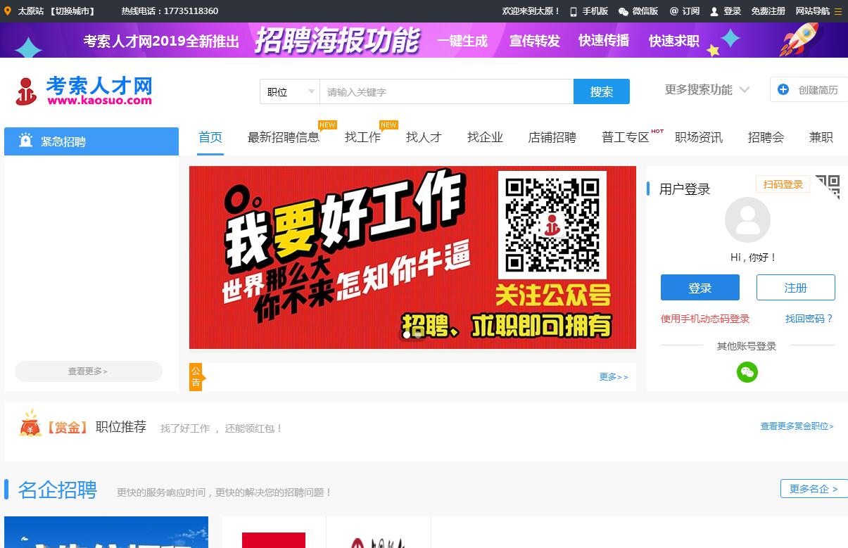 | 网站简介: 考索人才网(ty.kaosuo.com)面向全国,提供2019最新最全最准确的招聘网站信息,为太原企业和求职者提供人才招聘、求职、找工作、培训等在内的全方位的人力资源服务,最新招聘信息,找工作上考索人才网! |