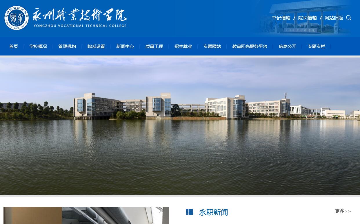 永州职业技术学院是2000年7月经湖南省人民政府批准教育部备案,由零陵卫校和零陵农校合并升格而成。为整合永州教育资源,2003年6月经湖南省人民政府批准,将原零陵商校、零陵师范、零陵工校三所普通中专成建制并入。学院现占地面积3362亩,建筑面积47万平方米,固定资产总值11亿多元,其中,仪器设备1.6亿元,馆藏图书90多万册。在职教职工967人,其中,正高职称68人、副高职称260人;有博士、硕士学位242人,专任教师中“双师”素质教师比例82%。开设了35个高职专业,专业设置涵盖了医学、农学、机械、经贸、信息、建筑、教育等门类,面向全国27个省市区招生,全日制在校学生1.7万人。现有国家级教学团队1个,省级教学团队3个,现有国家职业教育专业教学资源库项目1个,国家级教改试点专业2个,国家重点建设专业6个;有省级精品专业和教改试点专业8个,省级示范性特色专业2个,省级特色专业2个,省级示范性特色专业群1个,国家和省级精品课程19门。国家职业教育实训基地3个,省级生产实习实训基地3个。拥有附属医院、生态养殖场、畅通驾校等三大校内生产性实习实训基地。学院自组建以来,坚持“立足永州,服务三农”的办学定位,致力于为地方经济和社会发展培养高素质、高技能专门应用型人才,走出了一条“以服务求支持,以贡献求发展”的办学新路子,形成了鲜明的办学特色,取得了显著的办学业绩。学院先后荣获全国职业教育先进单位、全国高职高专人才培养水平评估优秀学院、国家教学成果一等奖、湖南省文明高校、湖南省职业教育先进单位、湖南省普通高校就业工作先进单位、湖南省普通高校就业工作“一把手”工程优秀单位、湖南省普通高等学校党建工作先进高校、湖南省普通高校大学生思想政治工作优秀单位、湖南省普通高校大学生心理健康教育先进单位、湖南省首届黄炎培职业教育优秀学院、湖南省普通高校党风廉政建设先进单位、全国普通高校学籍学历管理工作先进集体、湖南省绿化工作先进集体、湖南省高校后勤工作先进集体等多项重大荣誉。2010年10月,学院顺利通过示范院校国家级验收,被确定为国家示范性高等职业院校。