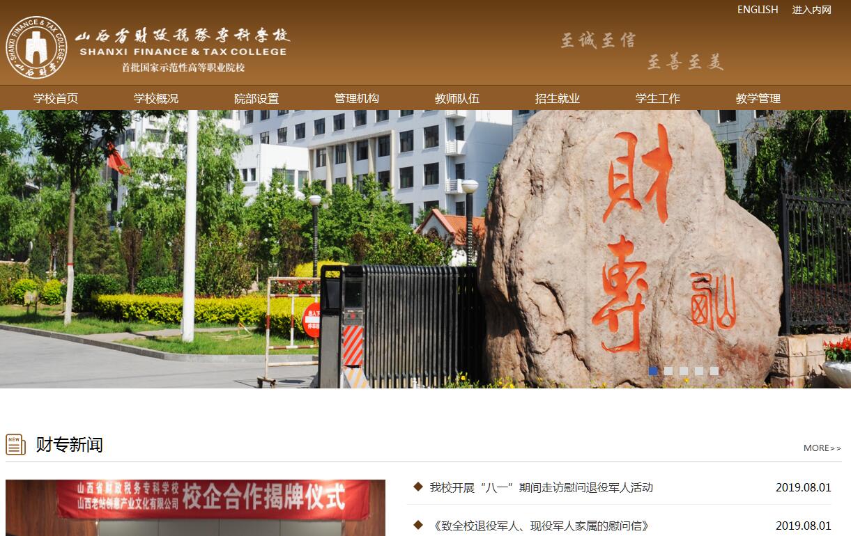 山西省财政税务专科学校坐落在山西省省会太原市,是一所培养高等财经应用型人才的全日制高等专科学校,是首批国家示范性高等职业院校。学校前身是1963年成立的山西会计学校,1985年在其基础上建立了山西省财政税务专科学校,隶属于山西省财政厅。2002年经山西省人民政府批准,学校与太原理工大学联合举办太原理工大学财经学院。学校秉承“至诚至信,至善至美”的校训,坚持“创新驱动、深耕改革、产教融合、强化特色、开放办学、创建名校”的办学思路,遵循“能力本位,工学结合,校企合作,持续发展”的高等财经类职业教育理念,全面提升内在品质和社会影响,不断拓展发展空间,不断增强发展后劲,实现了学校全面可持续发展。学校现面向全国8个省份招生,全日制在校生5822人,函授生239人。建校以来,已向社会输送全日制毕业生55000余人,培养在职干部14万人次。学校设财税学院、会计学院、金融学院、信息学院、商学院、旅游学院、马克思主义学院、公共课教学部、外语教学部、体育教学部、继续教育学院等11个教学机构,开设会计、税务、证券与期货、市场营销、计算机应用技术、旅游管理等23个专科专业,会计学、市场营销、国际经济与贸易、计算机应用技术、金融学等5个本科专业。学校拥有国家示范校重点建设专业6个、国家级教学改革试点专业2个、中央财政重点支持建设专业2个、省级教学改革试点专业4个;国家级精品课程4门,国家级精品资源共享课3门,省级精品课程18门,全国经济类教指委重点建设课程4门,校级精品课程39门。学校位于美丽的汾河西畔,迎泽西大街以南,交通便利,条件优越,占地面积92932.7平方米,建筑面积128328平方米,馆藏纸质图书文献47.44万册(套),教学用计算机1900台,教学仪器设备值4251.85万元,网络计算机教学中心、语音实验室、多媒体教室和校园网等教学设施国内一流。建有会计多功能综合模拟实训室、市场营销综合实训室、证券金融综合实训室、税务综合实训室等38个校内实训基地,8个国家级职业技能鉴定机构,200余个校外实习实训基地和100余个校外产学合作基地。学校师资力量雄厚,学术氛围浓郁,现有教职员工403人,其中教授29人,副教授98人,国务院政府特殊津贴专家1名,“国家高层次人才特殊支持计划”教学名师1名,山西省教学名师1名、山西省青年教育专家5名、山西省“双师型”教学名师10名、山西省“双师型”优秀教师17名、山西省青年教育(教学)专家9名,省级青年教师基本功竞赛获奖者24名。学校拥有国家级优秀教学团队1个,省级优秀教学团队2个;“双师”素质教师133人,占专任教师的70.4%;聘请行业企业兼职教师达100余人,建成了一支基础理论扎实、双师结构合理、专业技能精湛,师德高尚、爱岗敬业、勇于创新的专兼职教师队伍。学校科研成果丰硕,教师发表学术论文、主编部级核心教材、主持省级以上课题等均位列全省高职院校前茅,曾荣获山西省百部(篇)工程一等奖4项、山西省教学成果特等奖2项、山西省教学成果一等奖8项、山西省科技进步二等奖1项等。《高职会计专业国家级教学资源库的研发与应用》项目荣获国家教学成果一等奖,填补了山西省国家级教学成果一等奖的空白。学校先后被评为全国财政教育先进单位、国家级依法治校示范校、全国社会实践先进单位、山西省先进基层党组织、山西省五一劳动奖状、山西省模范单位、山西省文明单位、山西省人才培养工作优秀单位、山西省高校就业工作先进单位等。学校被推选为全国财政职业教育教学指导委员会副主任委员单位、全国高职高专校长联席会议主席团单位、全国高等财经职业教育协作委员会和发展研究中心主任委员单位、中国高等教育学会职业技术教育分会常务理事单位、中国职业技术教育学会财经职业教育专业委员会理事长单位、中国教育会计学会高职院校分会会长单位等。学校被确定为财政部干部定点培训基地、全国财会类师资培训基地、山西省国税系统干部定点培训基地、山西省地税系统干部定点培训基地等。使命呼唤担当,使命引领未来。我们一定要坚持以习近平新时代中国特色社会主义思想为指引,牢固树立强烈的责任意识和使命意识,全力开启新时代山西财专教育事业发展新征程,全面推进高质量高水平的改革型创新型开放型财经类高职名校建设!