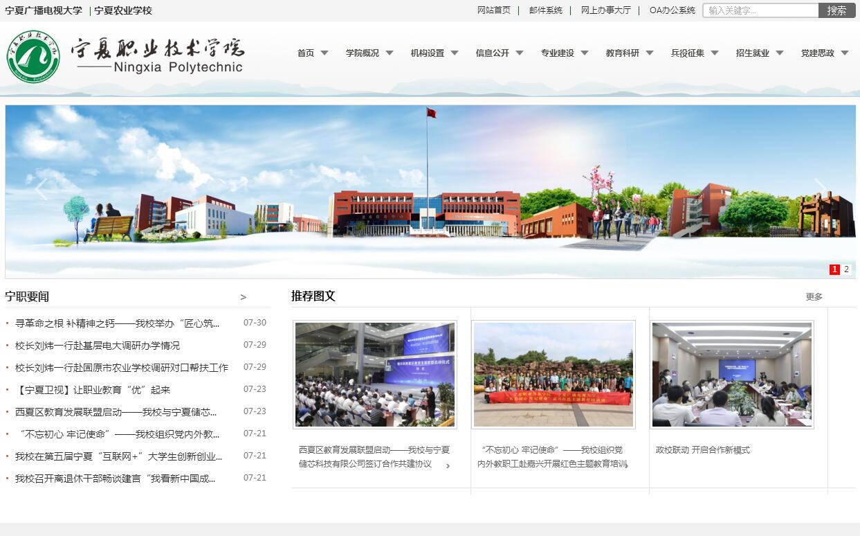 宁夏职业技术学院是隶属于宁夏回族自治区人民政府的一所集现代职业教育与远程开放教育为一体的多门类、多学科的综合性高等学校(另辖宁夏农业学校)。承担着高等职业教育、远程开放教育、中等职业教育、成人学历教育、技工教育和继续教育等多种办学任务。学校由宁夏广播电视大学、宁夏重工业职工大学、宁夏职工科技学院、宁夏机械技工学校、宁夏农业学校、宁夏农垦职工中等专业学校、宁夏轻工业学校7所院校合并组建而成,保留了“宁夏广播电视大学”牌子。学校由三个校区组成:新校区占地1583亩,电大老校区占地37亩,原轻纺校区占地30亩,另建有农科综合实训基地508亩。学校建有校内实训基地12个,常规和虚拟仿真实验实训室113个,校企合作兴建校外实习实训基地170个。建有高水平的中国(宁夏)现代物流、现代农业、智能制造综合职业技能公共实训中心,正在积极筹建现代纺织公共实训中心、现代农业产教融合实训中心,以及宁夏职教园区共享共用培训宿舍楼和中国(宁夏)职业教育国际交流中心。学校现有各类学历教育学生35980名,其中全日制在校学生9244名(含高职学生6184名、中职学生3060名),全区电大2015-2017学年在籍本专科学生26736人。学校位于宁夏银川市西夏区职业教育园区,是自治区第一所国家示范性高等职业技术学院,全国高职高专校长联席会议主席团42所高校成员单位之一,全国文明单位。拥有校内实训基地12个,真实和仿真环境实验实训室113个,校企合作兴建校外实习实训基地136个。学校现有在编教职工709名,副教授、高工以上专业技术人员289名(其中正高职称人员93人),硕士以上学历188名,“双师”素质教师229名。学校坚持人才强校战略,加大高层次人才的引进和培养力度,实施专业领军人才、高精尖人才、国际人才培养计划,聘请了48名在行业企业极具影响力的技能大师作为专业带头人,聘请了300多名行业企业技术能手作为兼职教师,打造了一支“行业专家引领型”的双师教学团队,培养了一大批专业骨干教师、优秀青年教师和优秀干部。涌现出全国劳动模范1名、全国优秀工作者1名、全国“五一”劳动奖章1名、宁夏“313人才”2名、宁夏“塞上名师”1名、宁夏高等学校教学名师5名。学校紧贴宁夏产业发展需求,开设50个专业(方向),涵盖农林牧、材料与能源、化工技术、装备制造、制药、电子信息、财经旅游、现代纺织、艺术设计传媒、健康服务等10大类。其中,建有中央财政支持建设的国家示范专业3个、国家提升专业服务产业发展能力项目专业2个。2011-2017年,学校参加各级各类职业技能竞赛,获得国际赛事奖项1个、获得国家赛事奖项39个、获得行业赛事奖项31个、获得自治区赛事奖项358个。学校坚持文化育人,积极培育和践行社会主义核心价值观,着力构建特色鲜明的文化体系,传承了“开放、合作、包容、发展”的办学传统,确立了“笃信好学、志在生民”的教育使命。经过长期积淀,这些文化基因已经凝聚成为全体师生员工的共同价值追求和行为规范。学校紧紧围绕区域经济社会发展需要,紧盯经济结构调整趋势和产业转型升级方向,优化专业结构,全力推动专业设置与产业需求对接、课程内容与职业标准对接、教学过程与生产过程对接、毕业证书与职业资格证书对接、职业教育与终身学习对接,构建了产教深度融合、学研同步推进的社会服务功能体系,为经济社会发展培养输送了一大批实用型技术技能人才,产生了积极的社会影响。