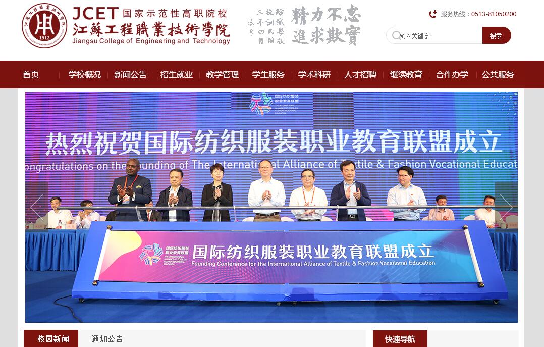 江苏工程职业技术学院是一所省属公办全日制普通高等学校。学校的办学历史可以追溯到1912年由著名爱国实业家、教育家张謇先生创办的我国第一所纺织专门学校,距今已有百年办学历史,具有深厚的文化底蕴,为江苏乃至全国的经济社会建设和发展培养了大量的优秀人才。学校于1999年经教育部批准,独立升格为“南通纺织职业技术学院”,2006年取得了全国高职高专人才培养工作水平评估优秀的成绩,2007年被确定为江苏省示范性高职院校建设单位,2008年被教育部、财政部确定为“国家示范性高等职业院校建设计划”立项建设院校,2011年6月顺利通过国家验收成为国家示范性高职学院,2014年5月,经江苏省人民政府批准,教育部备案,学校更名为江苏工程职业技术学院。2018年被确定为江苏省高水平高职院校建设单位。学校坐落在被誉为“中国近代第一城”的江苏省南通市,处于上海1小时经济圈内,交通便捷,区位优势突出。学校占地面积573232平方米,建筑面积283632平方米。学校教学设施齐全,装备比较先进,教学手段科学,现代教育技术得到广泛运用,基本实现了图书的信息化和电子化。学校设有各类实验、实训室193个,其中企业投资设立并以企业命名的实验(实训)室11个,与企业共建、共享的生产性实训基地14个。拥有中央财政支持的现代纺织技术实训基地、国家级家纺设计师职业资格培训中心、教育部、财政部“网络教育数字化学习资源中心建设”项目职业院校分中心、中国纺织服装高技能人才培训基地、江苏省先进纺织工程技术中心、江苏省家用纺织品与服装工程技术研发中心、江苏省风光互补发电研究技术研发中心、江苏省示范性实训基地、江苏省高等教育人才培养创新试验基地、南通市服装技术创新中心、南通市色织面料设计中心、南通市染整技术公共服务平台、南通风力与太阳能发电技术重点实验室、南通中小企业IT外包公共技术服务平台、江苏省基础课实验教学示范中心、国家职业技能鉴定所,并与海门市人民政府共建海门滨海生产性实训基地。学校与华夏航空工程有限公司合作成立了南通航空培训中心,顺利获得中国民航总局CCAR147飞机维修培训资质和CCAR66飞机维修考点,是江苏省内唯一一所同时获得这两项资质的高职院校,学校和德国库卡集团合作建设了库卡机器人江苏应用与培训中心,是库卡集团华东地区技能人才定点培训单位。学校现有全日制在校学生1万多名,是一所以工科为主体的综合性高校。现设有纺织服装学院、机电工程学院、商学院(社会管理工程学院)、艺术设计学院、建筑工程学院、航空与交通工程学院、信息工程学院等7个二级学院和素质教学部。设置42个专业(方向),传统专业凸现品牌特色,新设专业贴近社会需求,拥有国家示范性高职院校重点建设专业4个、中央财政支持“高等职业学校提升专业服务产业发展能力项目”专业2个、江苏省高等学校品牌专业建设计划一期建设项目2个、江苏省高等学校品牌特色专业10个(含建设点)、江苏省人力资源和社会保障厅“双证书试点”专业1个。学校现建有国家精品课程5门、江苏省高校精品课程5门、教育部高职高专教学指导委员会精品课程3门;入选江苏省高校精品教材10部。学校着力打造一支师德高尚、理念先进、教学水平高、实践教学能力强、专兼结合、结构合理的师资队伍。学院现有专任教师403人,其中具有高级职称的教师约占35%,专任教师中具有硕士以上学位教师约占74%;“双师”素质教师比例达67.94%。拥有国务院特殊津贴专家2人,国家级优秀教学团队1个、国家教学名师1人、江苏省高等学校优秀教学团队2个、江苏省高等学校教学名师2人、南通市教学名师5人、江苏省“333工程”培养对象7人,南通市“226工程”培养对象11人,江苏省“青蓝工程”培养对象7人。此外,学院聘请企事业单位的专家、工程师、技术员、能工巧匠430多人作为兼职教师,构建一支由校外具有工程、管理实践经验的专家组成的,相对稳定的兼职教师队伍,使之成为学院培养高素质技能型人才不可或缺的重要力量。学校弘扬张謇“学必期于用”、“用必适于地”的职教思想,创新高职教育教学理念,不断探索工学结合人才培养模式,积极与企业实行教学、科研、生产等方面优势资源的集成与整合,在办学方向、专业设置、课程开发、师资培养、实验室和实训基地建设、人才培养等方面展开全面合作。学校以服务地方经济社会发展为己任,大力推动“产学研”一体化建设,积极为社会提供培训服务和技术服务,取得了可喜的经济效益和社会效益。学校积极响应教育部对口支援行动计划和江苏省对口支援苏北教育的号召,与新疆、甘肃等省内外高职院校和职教中心开展广泛合作。学校秉持开放办学的理念,与新加坡南洋理工学院结成友好学校,接受荷兰撒克逊大学本科学生来校学习,全日制学历留学生规模不断扩大,常年邀请国外专家学者来校任教和讲学,定期选派教师出国培训,在开展国际合作交流中不断增强办学水平和影响力。学校坚持“以学生为本”的教育理念,实行思想素质、人文素质、科学素质、职业素质“四位一体”的素质教育。学校积极开展“三风”建设,形成了优良的校风和学风。通过推行“学分制”、“弹性学制”、毕业生“双证书制”等制度和专业教师工作室等机制,加