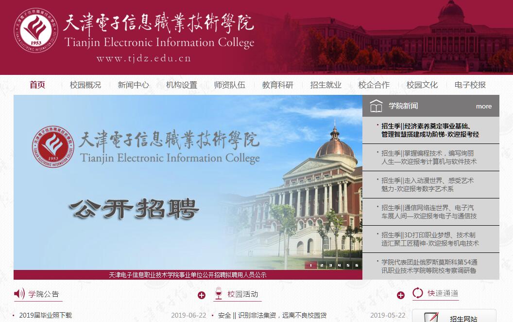 天津电子信息职业技术学院是由天津市人民政府批准成立、经国家教育部登记备案的全日制高等职业技术院校,是国家级示范校。其前身可溯至1953年由原国家第二机械部电信工业局(后改为十局)成立的“二九一技工学校”。1979年7月,学校名称改为“天津无线电机械学校”。2000年1月,天津市教委决定“天津无线电机械学校”与“天津市仪表无线电工业学校”合并,组建“天津电子信息学校”。2001年1月15日,经天津市人民政府批准,“天津电子信息学校”与“天津市职工电子仪表工程学院”合并成立“天津电子信息职业技术学院”。至此,在三校合并的基础上,学院正式成立。沐浴着国家大力发展职业教育的春风,学院近几年取得了快速发展。2007年,学院成为天津市首批示范性高等职业院校。2008学院通过国家示范性高等职业院校立项建设,并于2011年以优秀等级通过验收。2011年学院整体迁入海河教育园区。2012年,学院作为天津市首批高职院校与普通高校联合培养人才试点单位(二本B类),与天津理工大学联手,开设“通信技术”专业,共同开展技术应用型、高端技能型人才培养工作,2016年,首届学生41人顺利毕业,毕业率为100%。学院法定住所地为天津市海河教育园区雅深路4号,邮政编码:300350。当前占地面积498000平方米,规划建筑面积206000平方米,其中一期建成168202平方米,10幢现代化学生公寓,8000平方米学生食堂。学院固定资产总值9.8亿元(含原国营建津机器厂资源),教学科研仪器总值近9千万元,图书馆馆藏图书近62万册,校园网络实现全覆盖。学院当前在校生10091人(其中联合培养本科生160人),下设计算机与软件技术系、电子与通信技术系、数字艺术系、机电技术系、经济与管理系等5个教学系以及体育部、基础部、人文与社会科学教学部3个教学部,当前在办专业35个。学院已建成国家级精品资源共享课4门,近年来获国家及市级教学成果奖5项。学院编制数566人,专兼职教师总数超过500人,在编教职工432人,其中正高职称29人,副高职称168人,“双师型”教师达85%。拥有1个国家级优秀教学团队,2个市级优秀教学团队,2名天津市教学名师。学院实行中国共产党天津电子信息职业技术学院委员会领导下的院长负责制。目前领导班子成员8人,设党委书记1名,院长(党委副书记)1名,纪委书记1名,副院长5名。学院以立德树人为根本宗旨,培育践行社会主义核心价值观,注重学生素质培养,深入开展素质教育。竞技体育在同类院校中领先发展,大众体育开展富有特点;注重引导学生参与社会实践,形成“校园文化艺术节”、“宿舍文化节”、“读书节”、“科技节”等校园文化品牌活动,成立了学生青年志愿者协会、“微公益”社团、“马克思主义研习社”等56个学生社团。学生参与了2012年全国大学生运动会、2013年东亚运动会、2017年全运会、历年全国技能大赛等大型活动的志愿活动。近年来,学院以建设引领型实训基地,打造技术应用协同创新中心为抓手,探索出校企合作、产教融合的有效路径,人才培养质量不断提高,学生就业常年保持较高水平。当前,学院建成4个各具特色的技术应用协同创新中心,并与空中客车(天津)有限公司、大连东软集团、上烟集团天津卷烟厂、中航机电公司、天津地铁、华北高速等众多知名企业,以及中环电子信息集团有限公司下属的国有、合资企业建立了深度校企合作关系,为他们输送了大批优秀毕业生。学院依托中环集团系统内教育资源,探索中职、高职、本科衔接,开展师资队伍共建,取得明显成效。2017年天津市电子信息高级技术学校教师梁嘉伟在学院教授卢勤、杨阳指导下,夺得第44届世界技能大赛信息网络布线赛项金牌,实现我国该赛项金牌零的突破。2016年学院党委被中环集团党委评为“先进党组织”;被市委组织部、市农委等四部门联合授予“天津市结对帮扶困难村工作优秀驻村工作组”;学院获评海河教育园区平安校园建设一等奖;学院安保工作队伍被天津市公安局授予“集体三等功”;学院团委被评为“天津市五四红旗团委”;2016年学院食堂大宗物资统一采购位列天津市高职院校第一位。当前,学院正深入贯彻党的十九大精神,按照天津市关于“职业教育领先发展”的定位和“高等职业院校提升办学能力建设”的具体要求,以立德树人为根本,以服务发展为宗旨,以促进就业为导向,坚持产教融合、校企合作,全面实施提升办学能力建设。“十三五”以来,学院已建设完成通信技术、动漫制作技术、软件技术、计算机网络技术、计算机信息管理、机械制造与自动化、会计等7个紧贴产业发展、校企深度合作的骨干专业。2018年至2020年,继续建设通信技术、动漫制作技术、软件技术等3个优质骨干专业,并构建一流的专业体系,按照市委市政府高等教育“双一流”建设布局,扎实推进“国内一流、世界先进校”建设,为天津打造国家级现代职业教育改革创新示范区,引领国内职业教育发展发挥作用。