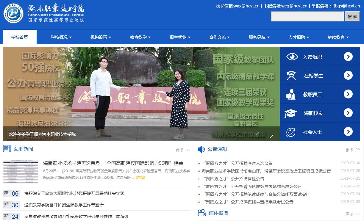 海南职业技术学院创建于2000年,是海南省第一所独立设置公办性质的高职院校,隶属海南省人民政府。2003年通过教育部首批高职高专人才培养工作水平评估;2008年立项建设国家示范性高职院校,2011年通过国家验收,成为海南唯一的国家示范性高职院校;2015年成为全国首批现代学徒制试点单位,2017年、2018年连续两年入选全国高职院校“国际影响力50强”。学校坐落在美丽的海口市中心城区,交通便利,环境优雅,建有功能齐全、设施完善的教学大楼、实训大楼、现代化图书馆、标准型运动场等,馆藏纸质图书、电子图书丰富。学生公寓全部安装空调,校园网络实现WIFI全覆盖。学校秉持“兴琼富岛,育人惠民”的办学宗旨,面向国际旅游业、热带高效农业、互联网产业、金融服务业、文化体育产业等海南重点产业体系,形成了以6个示范重点建设专业、2个教育部重点建设专业、7个省级特色专业为核心的七大专业群。拥有海南省种猪育种工程技术研究中心、药物研究所、大师工作室、珠宝实训基地、汽车技术实训中心等校内实训基地(室)77个,其中中央财政支持建设的国家示范实训基地16个。建成了3门国家级精品课程,1门国家级精品资源共享课程,1个国家级精品专业,18门省级精品课程;并与海南大学、海南师范大学、海南热带海洋学院联合开办了“4+0”联办本科,“3+0”双文凭中加合作办学等项目。学校坚持“动脑动手,尚德尚技”的育人理念,强化学生职业技能和素质培养。近年来,连续三届获得国家级教学成果二等奖3项,海南省教学成果一等奖7项,先后获得各类省市级、全国性和国家级技能竞赛奖项400多个,位列省内高职院校前列。近三年来,学生获得全国及海南省互联网+大学生创新创业大赛1金5银4铜的成绩,名列省内高职院校榜首。学校鼓励开展学生社团活动、各类专业展示、作品展览、技能PK等活动,学生毕业后成为行业企业的管理骨干、技术能手。办学18年来,学校为社会输送了4万多名毕业生,涌现了海口师霖农业开发有限公司(自创)总经理、全国劳动模范吴师,北京京师律师事务所联合创始人、全球合伙人封跃平,海南北汽银建易乐智慧出行科技有限公司(北汽车咖)副总经理、海南易乐物联科技联合创始人乔晗等一批优秀代表。学校师资力量雄厚,建成了拥有1个国家级教学团队、7个省级教学团队、1名国家级教学名师、5名省级教学名师、2名海南省优秀中青年骨干教师、3名黄炎培杰出教师与4名省委省政府直接联系重点专家的教师队伍。聘任了中国工程院院士陈焕春教授担任学校名誉校长。涌现了“全国五一劳动奖章”、“全国教育系统先进工作者”、“全国职业教育先进个人”、 “海南省优秀教育工作者”、“海南省优秀教师”、“全国优秀共青团干部”等一批名师名教。近年来,学校先后与罗牛山股份有限公司、海南省农信社、广东易事特电源股份有限公司、海南呀喏哒雨林文化旅游区、万豪酒店管理学院、达内集团等知名企业开展了多层次的合作,并依托海口罗牛山农产品加工产业园、桂林洋国家热带农业公园等海南省重点园区项目,深入推进校企合作、产教融合,为学生实训、实习与就业创造了优良的条件。目前共建有152个校外实习实训基地。学校重视国际合作办学,先后与法国、美国、加拿大、尼泊尔等国外教育机构开展国际合作,一批学生成功赴欧美国家留学提升。与加拿大荷兰学院合作成立了中加学院,开设有中加双文凭合作办学项目,引进了能力本位教育人才培养模式、教学方法和课程体系。开展了与台湾首府大学交流生项目,招收尼泊尔留学生,并面向老挝、柬埔寨开展教育交流与技术培训,为服务“一带一路”国家发展战略搭建了平台。