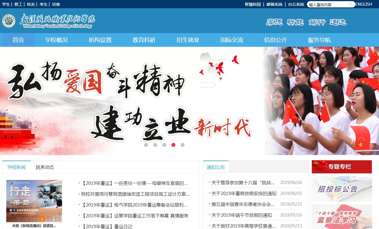 武汉铁路职业技术学院创建于1956年,2001年经湖北省人民政府批准组建高职学院,2004年由铁道部移交湖北省人民政府管理。学校是国家示范性高等职业院校、第六届黄炎培职业教育奖优秀学校、全国高校毕业生就业典型经验高校、高等职业院校服务贡献50强、高等职业院校国际影响力50强、教育部首批现代学徒制试点单位、湖北省最佳文明单位、武汉地区社会治安综合治理优秀单位,获得世界职教院校联盟卓越奖—“学习与就业机会”铜奖、世界职教院校联盟卓越奖——“高等技术技能”银奖。经过60多年的发展,学校现有全日制高职在校生12800余人,教职工600余人,其中具有副教授及以上职称教师近200人。现设有铁道运输管理学院、铁道机车车辆学院、铁道通信与信号学院、铁道工程学院、机械与电子学院、电气与自动化学院、经济与管理学院、医疗与护理学院等8个二级学院,并设有马克思主义学院、公共课部和实训中心。开设专业33个,覆盖了铁路运营管理全产业链。其中国家示范性高等职业院校重点专业(群)4个,央财支持重点建设专业2个,全国职业院校交通运输大类示范专业点3个,教育部现代学徒制试点专业2个,湖北省战略性新兴(支柱)产业专业3个,省级高等职业教育品牌特色专业8个,湖北轨道交通运营职业教育品牌专业5个。60多年的历史积淀,学校确立了“立足铁路、服务湖北、面向社会”的办学定位和“以人为本、开放创新、特色发展”的治校方针,凝练了“厚德、砺能、笃行、通达”的校训,形成了“铁的理想信念、铁的纪律作风、铁的意志品质、铁的担当作为”的铁院精神,走出了“跟着铁路转,联合铁路办,帮助铁路干,乘势谋发展”的特色发展之路。学校在全国高职院校中率先开办城市轨道交通和高速铁路类专业,率先建立国家级高速铁路和城市轨道交通实训基地,并在产教深度融合、校企紧密合作方面积累了实践经验,产生了积极影响。学校毕业生受到社会和轨道交通企业的普遍欢迎,长期以来毕业生就业率保持在96%以上。学校培养了全国道德模范、全国五一劳动奖章获得者刘洋,中国青年五四奖章获得者周啓龙,全国技术能手熊丰,湖北省五一劳动奖章、湖北省青年五四奖章获得者姚婕等一批又一批的优秀毕业生。学校积极参与国际化合作,先后与英国、加拿大、德国、澳大利亚、美国、泰国、肯尼亚、柬埔寨等国家的高等院校和职业教育机构合作,并率先为“一带一路”沿线国家培养高铁专业人才,“中泰联合培养高铁专业人才”项目成为首批中国-东盟职业院校特色合作项目,学校成为世界了解中国高等职业教育的窗口。全体武汉铁院人正以习近平新时代中国特色社会主义思想为指引,不忘初心,牢记使命,着力培养具有“四个自信”的德智体美劳全面发展的中国特色社会主义优秀劳动者和可靠接班人,在建设“优质、高效、和谐、幸福”的武汉铁院新征程中,奋力开拓,砥砺前行。