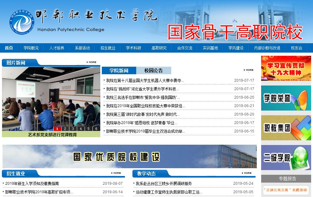 学院始建于1983年6月,原名邯郸职业大学,1984年10月更名为邯郸大学,时任中共中央总书记的胡耀邦同志题写了校名,1997年更名为邯郸职业技术学院。学院占地830亩,全日制在校生8900余人;学院现有专任教师392名,其中教授56名、副教授143名;具有硕士和研究生以上学历者占67%;拥有国家级教学团队1个(建筑工程技术团队),省级教学团队2个(建筑工程技术和机电一体化团队);省级教学名师2人(郭文志、钟芳林),省、市社科青年专家5人,省三三三人才二、三层次17人,享受省、市政府津贴28人。拥有省级技术转移中心(全省高职唯一)和物联网应用、紧固件等市级工程技术研究中心2个。2016年获得世界职教院校联盟卓越奖“高等技术技能”银奖(国内高职院校获得了2金1银3铜)。学院现设有10个系,分别是建筑工程系、机电工程系、电子信息工程系、管理系、经济系、文法系、艺术系、旅游与商贸系、食品与生物工程系、运动与健康系。学院主动适应区域产业结构调整、产品优化升级和人才需求变化,不断调整和优化专业布局结构,研究制定了《重点专业建设管理办法》,紧紧围绕我市主导产业,新调整了三个系、九个专业。目前招生专业51个,其中国家骨干院校重点建设专业4个(建筑工程技术、机电一体化、装潢艺术设计、物流管理),中央财政支持的“高职学校提升专业服务产业发展能力”建设专业2个(金融保险、计算机网络),省级示范专业7个。在课程建设方面,现有国家精品课2门(《地基与基础》《字体设计》),《地基与基础》已升级为国家精品资源共享课程;省级精品课11门。研究制定了《优质专业课程建设管理办法》,已有15门优质课通过验收。研究出台了《教师工作室培养模式管理办法》,首批遴选了9个教学团队。积极开展思政课改革,出台了《思政课改革实施方案》,编辑了《课前5分钟》思政课教案。每年修订《人才培养方案》,按照“工学结合、知行合一”的原则,逐步增加实践教学课时,提高学生实践动手能力。目前,建有校外实习实训基地193个,校内实验实训室和实践基地67个,覆盖了精品钢材、装备制造、食品加工、现代物流、新能源汽车、节能环保六大产业。与大唐移动共建了投资200余万元TD-LTE重点实验室;与河北银隆新能源汽车签署了协议,筹建银隆新能源二级学院;与市科技局、市知识产权局联合知识产权优势企业,共建邯郸知识产权学院。工学结合人才培养模式取得新突破,与新兴能源装备公司、长城汽车集团等500强企业建立了战略合作关系,每年培养输送学生700余人;与阳光集团、美食林集团等企业联办冠名班;与东软集团大连睿创共同开展创新创业教学体系建设、创业教育在线学习平台建设。与台湾建国科技大学等六所院校建立了教师交流、学生交换、学分互认等合作关系,派出教师35人,学生4批45人,合作开展办学项目。2016年,与企业合作开展技术研发项目25项,技术交易额达到600万元,为企业创造经济效益上亿元。近年来,师生共获得国家、省各类职业技能大赛一、二、三等奖200余项。2016年4月,我院被省教育厅确定为国家优质院校建设立项单位后,院党委高度重视,精心谋划,举全院之力,努力创建国家优质专科高等职业院校。成立了以党委书记为组长,院长为副组长的创新发展行动委员会。省教育厅对我院创建工作高度重视,贾海明副厅长专程来学院调研,对我院前期创建工作给予充分肯定。省教育厅先后拨付了900万元项目奖励资金和3000万元项目建设资金,支持学院重点项目建设。一是重点建设省厅确定的建筑工程技术、食品加工技术、机电一体化、装潢艺术设计、物流管理等5个专业和学院确定的计算机网络、电子商务、数控技术等3个特色专业;二是重点推进数控技术和食品加工技术两个生产性实训基地建设,争取了省、市职教集团专项资金1000万元用于设备购置;三是建设银隆新能源二级学院和邯郸知识产权学院。目前,我院与市科技局、市知识产权局联合举办了知识产权学历班,成立了全省首家政校合作的“邯郸知识产权学院”,引进北京同辉等9家专利事务所入驻,正在筹建河北省(邯郸)知识产权服务中心、河北省(邯郸)知识产权快速维权中心和中国专利行政执法审理厅。四是探索现代学徒制试点。食品加工技术专业已被确立为国家级现代学徒制试点单位;五是推进协同创新中心建设。整合我院省级技术转移中心和邯郸市物联网应用工程技术研究中心,建立邯郸市企业技术需求数据库、邯郸市科技成果和专利技术数据库,建设信息技术协同创新中心;六是建立技能大师工作室。与我市国家非物质文化传承人安际衡先生达成合作意向,共建磁州窑技能大师工作室。创新人才培养模式,成立9个教师工作室。七是开展创新创业课程。在市政府支持下,与东软睿创签订了合作协议,市人社局每年支持资金30万元,已开发创新创业课程8门,并举办了邯郸市睿创杯创新创业大赛。学院在省厅确定的重点项目基础上,结合学院实际,自我加压,开展了系列自主项目建设。一是启动运动康复中心项目。二是注重校内实训室建设。三是正在筹建邯郸市建筑行业新技术新工艺新材料展示基地,正在组建邯郸市建筑行业校企合作联盟。四是谋划建设省级众创空间。紧紧围绕邯郸市“十三五”规划确定的精品钢材、装备制造、食品加工、节能环保、新能源汽