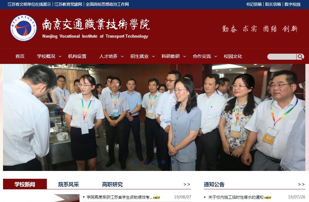南京交通职业技术学院是公办全日制普通高等学校,坐落在历史源远流长、文化底蕴厚重,素有“六朝古都”、“十朝都会”之美誉的南京。学院占地921亩,建筑面积35万平方米,资产总值近13亿元,教学仪器设备总值1.5亿元。学院全日制在校生规模1万余人、继续教育规模5000余人。学院2005年以优秀等次通过教育部高职高专院校人才培养工作水平评估,2008年被确定为江苏省示范性高职院校,2010年牵头组建江苏交通运输职业教育集团,2012年成为国家教育体制改革试点院校、江苏省高等教育综合改革试点院校,2016年成为全国职业院校数字校园建设试点院校,2018年入选江苏省高水平高职院校建设单位。近年来,学院先后荣获江苏省政府高技能人才摇篮奖、省职业教育先进单位、省教学工作先进高校、省高校毕业生就业工作先进集体、省文明单位(校园)、省高校思想政治教育工作先进集体等荣誉称号,多次入选“全国高等职业院校服务贡献50强”“全国高等职业院校国际影响力50强”“全国高校创新人才培养暨学科竞赛50强”。学校办学主要核心指标和综合实力位居全省高职院校第一方阵。立德树人六十余载,成就江苏交通“黄埔军校”。南京交通职业技术学院隶属江苏省交通运输厅,创办于1953年,是新中国成立后江苏首个交通类专门学校,办学历史长、文化底蕴厚。65年的深厚积淀和创新探索,学校硕果累累:国内首个服务全国公路水运工程的基桩检测培训基地,交通运输部支持的国家级现代物流实训基地,华东地区东风标致、东风雪铁龙、长安福特培训中心,全省公路、汽车行业从业人员职业培训、资格鉴定中心等。学校为江苏交通运输行业输送了7万多名高素质技术技能人才,培养了1000余名交通土建类企业总工程师、总经理,60%的全省公路交通建设项目经理和技术骨干、60%的全省交通运输系统财务干部、60%的全省汽车4S店高级管理人员均来自我校,为江苏打造交通建设品牌工程、交通服务品牌项目提供了重要支撑,被誉为江苏交通“黄埔军校”。交通专业国内领先,助推江苏交通率先发展。学院紧密对接“一带一路”、长江经济带、长三角一体化等国家战略,紧紧围绕江苏现代综合交通运输体系建设,重点打造汽车服务、交通土建、现代物流、智能交通、轨道交通和建筑工程等6个专业群。围绕“互联网+”智能交通产业链和地区支柱产业,学校开发新能源汽车运用与维修、智能交通技术运用、航空服务、城市轨道交通通信信号技术等7个交通紧缺专业。学校专业设置与行业发展契合度达70%,专业布局由“陆上交通”向“公、铁、水、空”综合交通运输拓展,为江苏率先建设综合交通运输体系提供了有力支撑。学院拥有全国交通运输职业教育示范性专业2个、国家提升专业服务能力建设专业2个、省级品牌(特色)专业6个、省级品牌专业建设一期工程项目2个、省级高水平骨干专业建设项目5个、省级示范重点建设专业5个,省级重点专业群4个。汽车专业群、交通土建专业群、运输管理专业群办学实力处于全国领先地位。产教融合校企共赢,引领交通职教创新发展。学院牵头组建江苏交通运输职业教育集团、江苏汽车职业教育联盟、南京交通高职教育联合体,是江苏交通运输职业教育教科研中心组组长单位,形成“政校行企”集团化办学范式,引领带动全省交通运输职业教育共同发展。学院先后成立了“江苏交工学院”、“万宇学院”、“康众学院”等10余个校企联合学院,探索实践“双主体”和混合所有制办学,组建了“舍弗勒班”“宏信班”“江苏交工班”等20余个具有现代学徒制特色的企业订单班,辐射带动全省交通运输职业教育创新发展。实施了“4+0”“3+2”“3+3”等11个现代职教体系试点项目,打通了江苏交通职业教育人才成长通道,建立起横向联通、纵向贯通的江苏交通人才培养立交桥。先后荣获国家级教学成果奖2项、省教学成果奖13项,其中一等奖7项。南京交职院建有“江苏省道路交通节能减排工程技术研究开发中心”等省部级和地方科技研发中心6个、“江苏省中小企业交通运输产业公共技术服务平台”等校企协同创新平台3个、“南京育通监理工程有限公司”等校办技术服务机构3个、校企混编科技服务团队6个。建有博士后科研工作站、研究生培养工作站、研究生联合培养基地以及江苏省退役士兵教育培训基地等3个省级培训中心、苏宁培训中心等10个区域性行业培训中心。自2012年起每年承办汽车类专业国家级和省级职业技能竞赛,承担全国交通运输行业汽车、公路水运类等职业资格考试,承办全国、全省公路水运高职路桥、汽车专业骨干教师培训等大型活动。近3年开展技术服务项目近1000项,年均培训25000人次,年均技术服务产值6000万元以上,居全省高职院前列。综合办学实力雄厚,铸就交通人才培养高地。训实习条件先进,建有中央财政支持的实训基地4个、省财政支持的实训基地3个,交通运输部重点支持的实训基地1个、省交通运输厅实训基地7个;校企共建实训基地188个、实习基地105个。师资力量雄厚,高级职称占专任教师比达53%,硕士及以上学位占专任教师比达88.5%,“双师”素质教师占比达88%,拥有国家“百千万名师工程”1人、省部级教学名师16人,省高校优秀教学团队3个,入选江苏省“六大人才高峰”、“333人才工程”、省“青