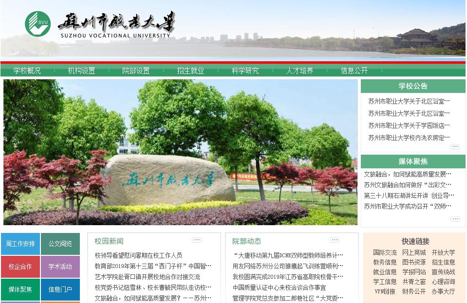 苏州市职业大学是经江苏省人民政府批准、教育部备案,由苏州市人民政府主办的全日制普通高等专科学校,前身为创办于1911年的苏州工业专科学校。自1981年成立以来,秉承“勤、勇、忠、信”的校训,赢得了显著的社会声誉,成为区域品牌院校。学校牢牢把握社会主义办学方向,紧紧抓住立德树人、成就师生根本任务,积极推进教育供给侧结构性改革,加强整体规划,坚持质量为先,坚定精准发展,大力培养“高品德、高技能、高适应”的人才队伍,实现学校发展与地方经济社会协同创新、融合共赢,努力建设全国一流品质院校,并积极实现应用型本科高校的办学目标。学校现有石湖、干将路、潭山和吏舍弄四个校区,占地面积1262余亩,校舍建筑面积49余万平方米,馆藏纸质图书161.67万册,教学科研仪器设备总值3.27亿元。设有12个学院(部),现有涵盖理工、文史、艺术、师范、体育等科类共56个专业,普通全日制在校生1.3万余名。专任教师793名,其中正高职称64名,副高以上职称354名,具有硕士以上学位的教师占专任教师的77.78%;有江苏省突出贡献中青年专家1人,省“六大人才高峰”培养对象3人,省“333高层次人才培养工程”培养对象19人,省“青蓝工程”培养对象36人,省级教学名师1人,省级优秀教学团队2个,省级科技创新团队2个。学校以培养高素质技术技能型和应用型人才为己任,围绕地方产业发展重点和社会对紧缺人才的需求,深入推进教育教学改革,打造人才培养特色。现有教育部重点专业和教改试点专业3个,省“十二五”高等学校重点专业群3个,省级品牌特色专业9个, 省高校品牌专业建设工程一期A类项目1个,省高水平骨干专业3个。省级优秀/精品课程8门次,省级优秀课程群1个,省高等学校精品教材9部,省重点教材7部,教师主参编各类教材300余部。学校建有集教学、培训、服务于一体的校内综合实训基地93个,其中教育部职业教育实训基地建设项目1个,省级实训基地4个;与苏州市吴中区人民政府、苏州市相城区人民政府、苏州市质量监督局等政府部门签订全面合作战略合作协议,全方位、全领域、全过程推进校地深度合作,全面深化产教融合、校地合作。牵头成立苏州市现代装备制造职业教育集团、苏州市现代光电职业教育集团,与阿里巴巴(中国)网络科技有限公司、科大讯飞股份有限公司等著名企业实现了校企深度合作,建有企业(行业)学院16个,校外实训基地369个。学校致力技术技能的积累与服务,坚持将科技创新与培养造就创新型科技人才紧密结合,坚持知识创新、技术创新与成果转化、社会服务协同推进。学校建有3个省级工程中心、5个省级研究所(基地),8个市级重点实验室(平台)。近五年来,承担各级各类科研项目850项,其中承担或合作承担国家自然科学基金项目10项、省部级项目21项;获省市两级科研成果奖101项,其中省部级科学技术进步奖1项,获省哲学社会科学优秀成果奖3项,市厅级科技进步奖3项,授权发明专利370项。学校积极服务地方经济社会发展,建设吴文化研究院、石湖智库等研究院所,在多个领域为地方经济建设、政府决策和行业企业发展提供决策咨询并承担课题研究,为吴地文化传承保护、丝绸工艺传承与创新、苏州古城墙恢复重建、城市旅游竞争力评价、模具特色小镇创新发展等作出了重要贡献。学校注重国际合作与交流,主动融入国家教育对外开放和江苏经济国际化战略,积极为“一带一路”沿线国家经济社会发展提供人才培养支持。学校围绕地方产业发展和人才需求,积极引进境外优质资源,先后与加拿大乔治布朗学院、新西兰国立理工大学、澳大利亚启思蒙学院、澳大利亚坎根学院、德国北黑森州职业技术学院、英国博尔顿大学、新加坡沙顿商学院、日本金成学院、新西兰奥塔哥理工学院等国外高校在共建专业、课程合作、教师交流、学生交换、学分互认等方面开展了有效合作。学校与澳大利亚启思蒙学院合作举办的机电一体化专业项目、会计与审计专业项目,被江苏省教育厅确定为高水平示范性中外合作办学项目培育点。“先进制造技术国际化人才培养项目”入选《江苏外国留学生优才计划高技能人才项目》。学校先后荣获江苏省文明单位、首批江苏省文明校园、首批江苏省平安校园建设示范高校、江苏省职业教育先进单位、江苏省科技工作先进高校、江苏省模范教工之家、江苏省高校毕业生就业工作先进集体、江苏省高校档案工作先进集体、苏州市职业教育服务经济转型升级先进学校等称号。在高职高专人才培养水平评估中获得优秀,是首批苏州市高技能人才培养示范基地和服务外包人才培养培训基地。