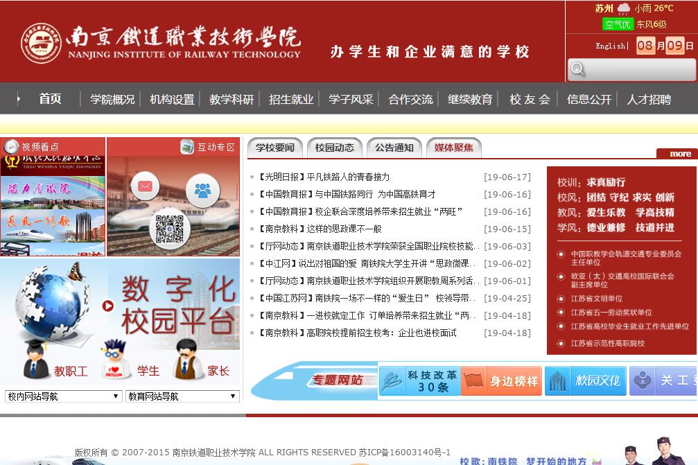 南京铁道职业技术学院是经江苏省人民政府批准成立、教育部备案的一所省属公办专科层次的全日制普通高校,是江苏省省级示范性高职院校。学校前身是创建于1941年的南京特别市立第一职业中学,1955年起更名为南京铁路运输学校,长期隶属铁道部管理。2002年学校升格为高等职业技术学院,更名为南京铁道职业技术学院,2004年成建制由铁道部划转江苏省地方管理。历经70多年风雨,南铁院人始终坚守立德树人,奉献铁路,服务社会的历史责任,艰苦创业,奋发图强,积淀了优良的办学传统,孕育了丰厚的铁路特色校园文化,培养了大批高素质技能型人才,赢得了良好的社会声誉。升格建院以来,学院事业发展翻开历史新篇章。在教育部组织的第一次高职高专人才培养工作水平评估中取得优异成绩;成功跻身省级示范性高职院行列;全面启用了浦口新校区;创新办学体制机制,与行业和区域大型企业开展战略合作,实行订单培养,建设高水平综合实训基地,与相关普通高校协同创新联合办学,与政府主管部门及企业联合建设大学生创业园、科技产业园,改革人才培养模式,人才培养质量不断提升。经过十年的拼搏,学院综合实力得到快速提升,事业发展进入新的历史时期。学院立足江苏,面向全国,重点服务长三角地区,立足铁路和城市轨道交通行业,面向区域经济,开放办学,特色办校,致力于培养一流高技能人才,推进教育教学改革,建设长三角地区轨道交通行业高技能人才培养、应用型技术研发与成果转化以及铁路文化传播的重要基地,把学院建设成为高水平、有特色、具有一定国际影响的轨道交通高职名校。